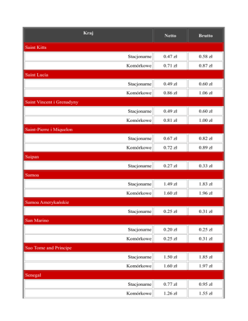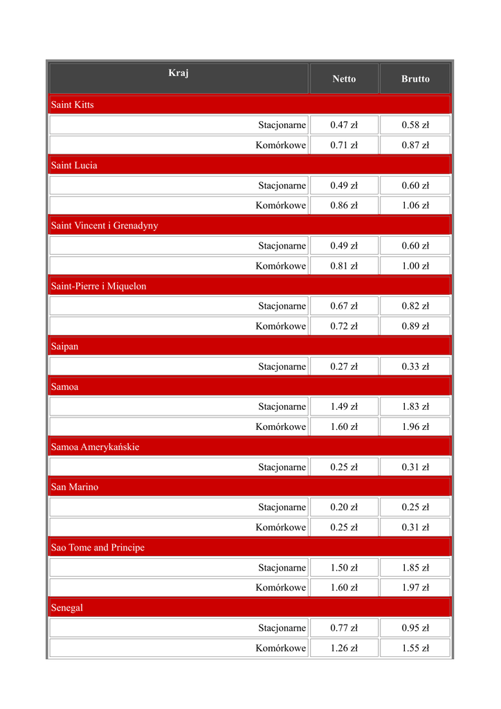 Kraj Netto Brutto Stacjonarne 0.47 zł 0.58 zł Komórkowe 0.71 zł 0.87 zł Stacjonarne 0.49 zł 0.60 zł Komórkowe 0.86 zł 1.06 zł Stacjonarne 0.49 zł 0.60 zł Komórkowe 0.81 zł 1.00 zł Stacjonarne 0.67 zł 0.82 zł Komórkowe 0.72 zł 0.89 zł Stacjonarne 0.27 zł 0.33 zł Stacjonarne 1.49 zł 1.83 zł Komórkowe 1.60 zł 1.96 zł Stacjonarne 0.25 zł 0.31 zł Stacjonarne 0.20 zł 0.25 zł Komórkowe 0.25 zł 0.31 zł Stacjonarne 1.50 zł 1.85 zł Komórkowe 1.60 zł 1.97 zł Stacjonarne 0.77 zł 0.95 zł Komórkowe 1.26 zł 1.55 zł Saint Kitts Saint Lucia Saint Vincent i Grenadyny Saint-Pierre i Miquelon Saipan Samoa Samoa Amerykańskie San Marino Sao Tome and Principe Senegal Serbia Stacjonarne 0.37 zł 0.46 zł Komórkowe 1.30 zł 1.60 zł Stacjonarne 1.08 zł 1.33 zł Stacjonarne 2.30 zł 2.83 zł Komórkowe 4.40 zł 5.41 zł Stacjonarne 1.06 zł 1.30 zł Komórkowe 1.31 zł 1.61 zł Stacjonarne 0.15 zł 0.18 zł Komórkowe 0.35 zł 0.43 zł Stacjonarne 0.11 zł 0.14 zł Komórkowe 0.59 zł 0.73 zł Stacjonarne 0.12 zł 0.15 zł Komórkowe 0.39 zł 0.48 zł Stacjonarne 1.30 zł 1.60 zł Komórkowe 1.40 zł 1.72 zł Stacjonarne 0.50 zł 0.62 zł Komórkowe 0.55 zł 0.68 zł Stacjonarne 0.08 zł 0.10 zł Komórkowe 0.10 zł 0.12 zł Seszele Sieci Międzynarodowe Sierra Leone Singapur Słowacja Słowenia Somalia Sri Lanka Stany Zjednoczone Sudan Stacjonarne 0.67 zł 0.82 zł Komórkowe 0.72 zł 0.89 zł Stacjonarne 0.62 zł 0.76 zł Komórkowe 0.84 zł 1.03 zł Stacjonarne 0.45 zł 0.55 zł Komórkowe 0.68 zł 0.84 zł Stacjonarne 0.09 zł 0.11 zł Komórkowe 0.53 zł 0.65 zł Stacjonarne 0.09 zł 0.11 zł Komórkowe 0.22 zł 0.27 zł Suriname Syria Szwajcaria Szwecja