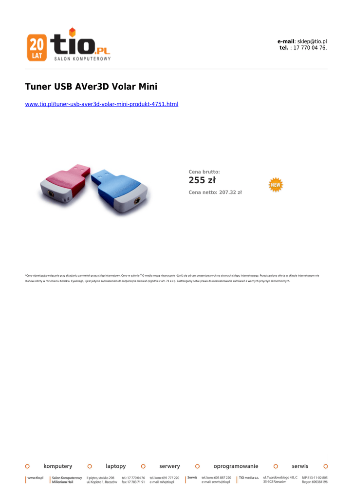 e-mail: [email protected] tel. : 17 770 04 76, Tuner USB AVer3D Volar Mini www.tio.pl/tuner-usb-aver3d-volar-mini-produkt-4751.html Cena brutto: 255 zł Cena netto: 207.32 zł *Ceny obowiązują wyłącznie przy składaniu zamówień przez sklep internetowy. Ceny w salonie TiO media mogą nieznacznie różnić się od cen prezentowanych na stronach sklepu internetowego. Przedstawiona oferta w sklepie internetowym nie stanowi oferty w rozumieniu Kodeksu Cywilnego, i jest jedynie zaproszeniem do rozpoczęcia rokowań (zgodnie z art. 71 k.c.). Zastrzegamy sobie prawo do niezrealizowania zamówień z ważnych przyczyn ekonomicznych.