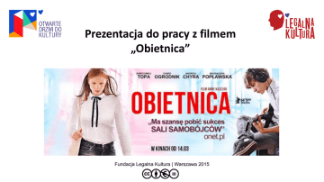 Prezentacja do pracy z filmem „Obietnica” Fundacja Legalna Kultura | Warszawa 2015 „Obietnica” Reżyserka filmu Anna Kazejak Fundacja Legalna Kultura „Obietnica” Inspiracja prawdziwymi wydarzeniami Fundacja Legalna Kultura „Obietnica” Generacja online - miłośnicy Facebooka, Skype'a i esemesowania Fundacja Legalna Kultura „Obietnica” Świat współczesnego nastolatka Fundacja Legalna Kultura „Obietnica” Przyjaźń i miłość w życiu nastolatka Fundacja Legalna Kultura „Obietnica” Różne modele wychowania Fundacja Legalna Kultura „Obietnica” Rodzice i dzieci w lekturach szkolnych • Henryk Sienkiewicz „Janko Muzykant” • Bolesław Prus „Antek” • Władysław Stanisław Reymont „Chłopi” • Stefan Żeromski „Przedwiośnie” • Jerome David Salinger „Buszujący w zbożu” Fundacja Legalna Kultura Źródło fotografii użytych w prezentacji: materiały dystrybutora – Kino Świat „Obietnica” Korzystając z legalnych źródeł wspierasz kulturę. Nie tylko osobistą. Fundacja Legalna Kultura