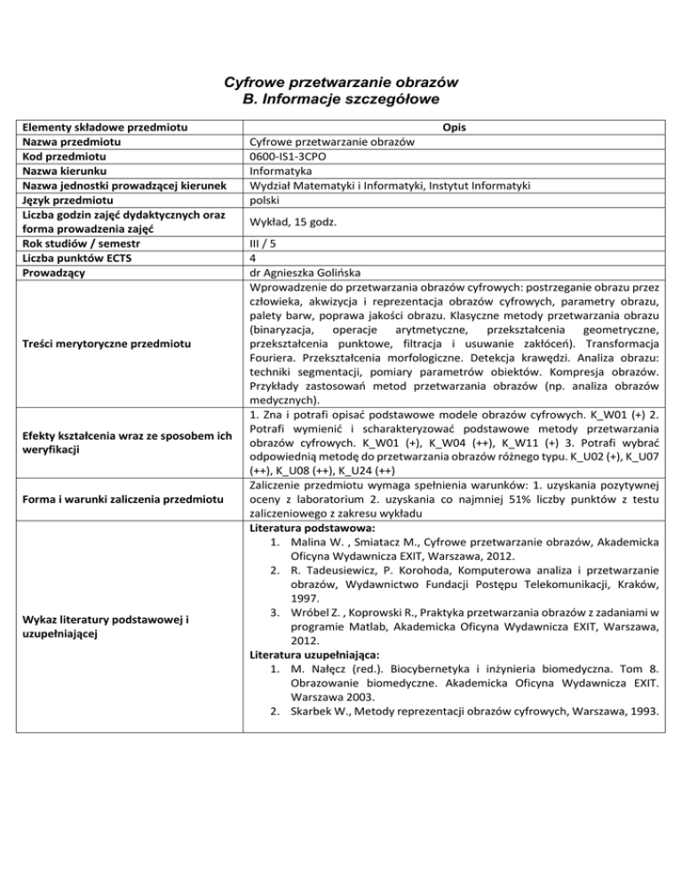 Cyfrowe przetwarzanie obrazów B. Informacje szczegółowe Elementy składowe przedmiotu Nazwa przedmiotu Kod przedmiotu Nazwa kierunku Nazwa jednostki prowadzącej kierunek Język przedmiotu Liczba godzin zajęć dydaktycznych oraz forma prowadzenia zajęć Rok studiów / semestr Liczba punktów ECTS Prowadzący Treści merytoryczne przedmiotu Efekty kształcenia wraz ze sposobem ich weryfikacji Forma i warunki zaliczenia przedmiotu Wykaz literatury podstawowej i uzupełniającej Opis Cyfrowe przetwarzanie obrazów 0600-IS1-3CPO Informatyka Wydział Matematyki i Informatyki, Instytut Informatyki polski Wykład, 15 godz. III / 5 4 dr Agnieszka Golińska Wprowadzenie do przetwarzania obrazów cyfrowych: postrzeganie obrazu przez człowieka, akwizycja i reprezentacja obrazów cyfrowych, parametry obrazu, palety barw, poprawa jakości obrazu. Klasyczne metody przetwarzania obrazu (binaryzacja, operacje arytmetyczne, przekształcenia geometryczne, przekształcenia punktowe, filtracja i usuwanie zakłóceń). Transformacja Fouriera. Przekształcenia morfologiczne. Detekcja krawędzi. Analiza obrazu: techniki segmentacji, pomiary parametrów obiektów. Kompresja obrazów. Przykłady zastosowań metod przetwarzania obrazów (np. analiza obrazów medycznych). 1. Zna i potrafi opisać podstawowe modele obrazów cyfrowych. K_W01 (+) 2. Potrafi wymienić i scharakteryzować podstawowe metody przetwarzania obrazów cyfrowych. K_W01 (+), K_W04 (++), K_W11 (+) 3. Potrafi wybrać odpowiednią metodę do przetwarzania obrazów różnego typu. K_U02 (+), K_U07 (++), K_U08 (++), K_U24 (++) Zaliczenie przedmiotu wymaga spełnienia warunków: 1. uzyskania pozytywnej oceny z laboratorium 2. uzyskania co najmniej 51% liczby punktów z testu zaliczeniowego z zakresu wykładu Literatura podstawowa: 1. Malina W. , Smiatacz M., Cyfrowe przetwarzanie obrazów, Akademicka Oficyna Wydawnicza EXIT, Warszawa, 2012. 2. R. Tadeusiewicz, P. Korohoda, Komputerowa analiza i przetwarzanie obrazów, Wydawnictwo Fundacji Postępu Telekomunikacji, Kraków, 1997. 3. Wróbel Z. , Koprowski R., Praktyka przetwarzania obrazów z zadaniami w programie Matlab, Akademicka Oficyna Wydawnicza EXIT, Warszawa, 2012. Literatura uzupełniająca: 1. M. Nałęcz (red.). Biocybernetyka i inżynieria biomedyczna. Tom 8. Obrazowanie biomedyczne. Akademicka Oficyna Wydawnicza EXIT. Warszawa 2003. 2. Skarbek W., Metody reprezentacji obrazów cyfrowych, Warszawa, 1993.