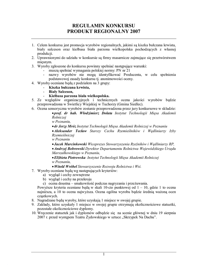 REGULAMIN KONKURSU PRODUKT REGIONALNY 2007 1. Celem konkursu jest promocja wyrobów regionalnych, jakimi są kiszka bułczana krwista, biały salceson oraz kiełbasa biała parzona wielkopolska pochodzących z własnej produkcji. 2. Uprawnionymi do udziału w konkursie są firmy masarnicze zajmujące się przetwórstwem mięsnym. 3. Wyroby zgłoszone do konkursu powinny spełniać następujące warunki: - muszą spełniać wymagania polskiej normy: PN nr 21 - nazwy wyrobów nie mogą identyfikować Producenta, w celu spełnienia podstawowej zasady konkursu tj. anonimowości oceny. 4. Wyroby oceniane będą z podziałem na 3 grupy: - Kiszka bułczana krwista, - Biały Salceson, - Kiełbasa parzona biała wielkopolska. 5. Ze względów organizacyjnych i technicznych ocena jakości wyrobów będzie przeprowadzona w Świetlicy Wiejskiej w Tuchorzy (Gmina Siedlec). 6. Ocena sensoryczna wyrobów zostanie przeprowadzona przez jury konkursowe w składzie: • prof. dr hab. Włodzimierz Dolata Instytut Technologii Mięsa Akademii Rolniczej w Poznaniu, • dr Jerzy Mróz Instytut Technologii Mięsa Akademii Rolniczej w Poznaniu • Aleksander Tecław Starszy Cechu Rzemieślników i Wędliniarzy Izby Rzemieślniczej w Poznaniu • Jacek Marcinkowski Wiceprezes Stowarzyszenia Rzeźników i Wędliniarzy RP, • Andrzej Bobrowski Dyrektor Departamentu Rolnictwa Wojewódzkiego Urzędu Marszałkowskiego w Poznaniu, • Elżbieta Piotrowska Instytut Technologii Mięsa Akademii Rolniczej w Poznaniu, • Witold Wróbel Stowarzyszenie Rozwoju Rolnictwa i Wsi. 7. Wyroby oceniane będą wg następujących kryteriów: a) wygląd i cechy zewnętrzne b) wygląd i cechy na przekroju c) ocena doustna – smakowitość podczas nagryzania i przeżuwania. Powyższe kryteria oceniane będą w skali 10-cio punktowej od 1 – 10, gdzie 1 to ocena najniższa, a 10 to ocena najwyższa. Ocena ogólna wyrobu będzie średnią ważoną ocen cząstkowych. 8. Nagradzane będą wyroby, które uzyskają 1 miejsce w swojej grupie. 9. Zakłady, które uzyskały 1 miejsce w swojej grupie otrzymają okolicznościowe statuetki, pozostałe okolicznościowe dyplomy. 10. Wręczenie statuetek jak i dyplomów odbędzie się na scenie głównej w dniu 19 sierpnia 2007 r. przed występem Teatru Żydowskiego w sztuce „Skrzypek Na Dachu”. 1 Zasady przyjmowania wyrobów na konkurs. 1. Wyroby na konkurs należy dostarczyć w pojemniku plastikowym z wiekiem zamykanym od góry w dniu 8 sierpnia, w godz. od 830 do 1000 do Świetlicy Wiejskiej w Tuchorzy (Gmina Siedlec) 2. Producent, zgłasza się do stanowiska przyjęć, gdzie: - przekazuje formularz w zaklejonej kopercie przedstawicielowi Organizatora , - losuje numer konkursowy, - jeżeli wyroby zgłoszone do konkursu wytwarzane są w oparciu o unikalną technologię opracowaną w zakładzie, mającą wpływ na ich wyróżniki jakościowe, należy dołączyć krótki opis wyjaśniający, jakim wymaganiom jakościowym powinien odpowiadać dany wyrób (wydrukowane maksymalnie na 1 stornie formatu A4), - każdy wyrób zgłoszony do konkursu Producent oznacza, wraz z przedstawicielem Organizatora, wylosowanym numerem. 3. Pojemniki z wyrobami, oznaczone właściwym numerem, Producent zostawia w punkcie przyjęć. 4. Wyroby przywiezione na Konkurs muszą spełniać następujące warunki: - w pojemniku, na opakowaniu, na osłonkach, tackach ani foliach nie może znaleźć się żadna cecha, która mogłaby identyfikować Producenta, - wyroby należy dostarczyć w całości (nie krojone ani plasterkowane) w ilości ok. 1 – 1,5 kg. Za Organizatora Krzysztof Słomianny 2 Wymagania jakościowe dla wyrobów mięsnych ocenianych w ramach obchodów Święta Świni w Siedlcu, 2007 r. − KISZKA BUŁCZANA KRWISTA Wędlina wytworzona z gotowanych surowców podrobowych (mięso z głów wieprzowych, skórki wieprzowe, wp. kl. IV, płuca wieprzowe) niepeklowanych, wytopionych surowców tłuszczowych (pachwina, podgardle), rozdrobnionych przez siatkę o średnicy oczek 2-3 mm, z dodatkiem bułki (tartej lub kostkowanej), rosołu z gotowania surowców podrobowych, wytopionego smalcu i krwi. Kiszki w kie łbaśnicach (dopuszczalne wszystkie kalibry) odkręcane w parki w odcinki długości 8 – 20 cm. Wędlina parzona w wodzie (kocioł) lub w parze (komora), studzona wodą i chłodzona na wisząco. Wytworzona z dodatkiem naturalnych przypraw: − cebula surowa lub smażona, − majeranek, − pieprz ziołowy lub czarny, − ziele angielskie. Bułczanka z bułki krojonej: na przekroju rozmieszczenie bułki w miarę równomierne, z dopuszczalnymi kawałkami bułki zajmującymi prawie całą powierzchnię przekroju. Po sparzeniu/usmażeniu bułka soczysta. Wydajność gotowego wyrobu w stosunku do surowca niepeklowanego nie większa niż 110%. Niedopuszczalne stosowanie zamienników mięsa (białkowych, smakowych itp.). − KIEŁBASA BIAŁA PARZONA WIELKOPOLSKA Kiełbasa niepeklowana, solona, parzona, porcjowana, w naturalnym jelicie wieprzowym o średnicy nie większej niż 32 mm, wytworzona z mięsa wieprzowego średnio rozdrobnionego oraz masy wiążącej przygotowanej na bazie chudego mięsa ścięgnistego wołowego lub wieprzowego. Zawartość mięsa wieprzowego o niewielkim przetłuszczeniu nie większa niż 70%. Wytworzona z dodatkiem naturalnych przypraw: − pieprz naturalny czarny świeżo zmielony, 3 − czosnek świeżo utarty, − aromatyczny kwiat majeranku z zeszłorocznych zbiorów. Wydajność gotowego wyrobu w stosunku do surowca niepeklowanego nie większa niż 100%. Niedopuszczalne stosowanie zamienników mięsa (białkowych, smakowych itp.). − SALCESON BIAŁY Wędlina podrobowa wytworzona z gotowanego peklowanego mięsa z głów i solonych skórek wieprzowych oraz rosołu z ich gotowania. Mięso z głów krojone w paski szerokości 1,5 – 2 cm i długości 7 – 10 cm; mięso ścięgniste z głów i skórki rozdrobnione przez siatkę 3 mm. Masa napełniana w żołądki lub w pęcherze wieprz