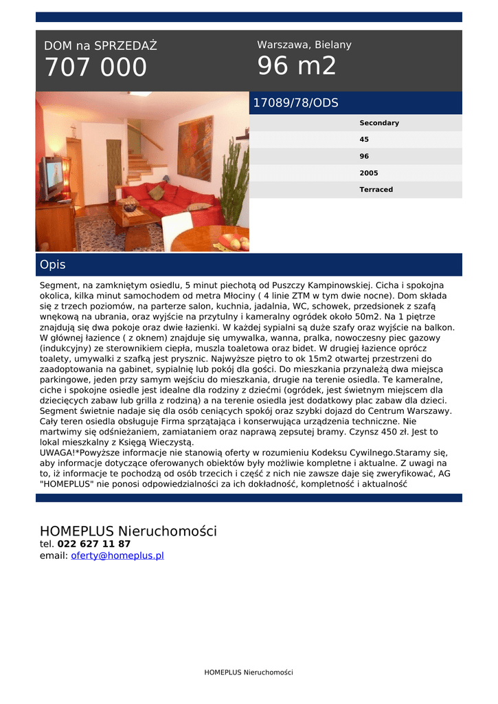 Warszawa, Bielany DOM na SPRZEDAŻ 96 m2 707 000 17089/78/ODS Secondary 45 96 2005 Terraced Opis Segment, na zamkniętym osiedlu, 5 minut piechotą od Puszczy Kampinowskiej. Cicha i spokojna okolica, kilka minut samochodem od metra Młociny ( 4 linie ZTM w tym dwie nocne). Dom składa się z trzech poziomów, na parterze salon, kuchnia, jadalnia, WC, schowek, przedsionek z szafą wnękową na ubrania, oraz wyjście na przytulny i kameralny ogródek około 50m2. Na 1 piętrze znajdują się dwa pokoje oraz dwie łazienki. W każdej sypialni są duże szafy oraz wyjście na balkon. W głównej łazience ( z oknem) znajduje się umywalka, wanna, pralka, nowoczesny piec gazowy (indukcyjny) ze sterownikiem ciepła, muszla toaletowa oraz bidet. W drugiej łazience oprócz toalety, umywalki z szafką jest prysznic. Najwyższe piętro to ok 15m2 otwartej przestrzeni do zaadoptowania na gabinet, sypialnię lub pokój dla gości. Do mieszkania przynależą dwa miejsca parkingowe, jeden przy samym wejściu do mieszkania, drugie na terenie osiedla. Te kameralne, ciche i spokojne osiedle jest idealne dla rodziny z dziećmi (ogródek, jest świetnym miejscem dla dziecięcych zabaw lub grilla z rodziną) a na terenie osiedla jest dodatkowy plac zabaw dla dzieci. Segment świetnie nadaje się dla osób ceniących spokój oraz szybki dojazd do Centrum Warszawy. Cały teren osiedla obsługuje Firma sprzątająca i konserwująca urządzenia techniczne. Nie martwimy się odśnieżaniem, zamiataniem oraz naprawą zepsutej bramy. Czynsz 450 zł. Jest to lokal mieszkalny z Księgą Wieczystą. UWAGA!*Powyższe informacje nie stanowią oferty w rozumieniu Kodeksu Cywilnego.Staramy się, aby informacje dotyczące oferowanych obiektów były możliwie kompletne i aktualne. Z uwagi na to, iż informacje te pochodzą od osób trzecich i część z nich nie zawsze daje się zweryfikować, AG "HOMEPLUS" nie ponosi odpowiedzialności za ich dokładność, kompletność i aktualność HOMEPLUS Nieruchomości tel. 022 627 11 87 email: [email protected] HOMEPLUS Nieruchomości Powered by TCPDF (www.tcpdf.org)