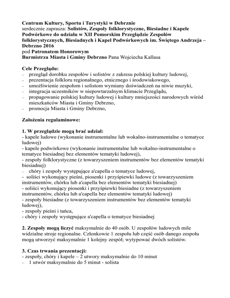 Centrum Kultury, Sportu i Turystyki w Debrznie serdecznie zaprasza: Solistów, Zespoły folklorystyczne, Biesiadne i Kapele Podwórkowe do udziału w XII Pomorskim Przeglądzie Zespołów folklorystycznych, Biesiadnych i Kapel Podwórkowych im. Świętego Andrzeja – Debrzno 2016 pod Patronatem Honorowym Burmistrza Miasta i Gminy Debrzno Pana Wojciecha Kallasa Cele Przeglądu: przegląd dorobku zespołów i solistów z zakresu polskiej kultury ludowej, prezentacja folkloru regionalnego, etnicznego i środowiskowego, umożliwienie zespołom i solistom wymiany doświadczeń na niwie muzyki, integracja uczestników w niepowtarzalnym klimacie Przeglądu, propagowanie polskiej kultury ludowej i kultury mniejszości narodowych wśród mieszkańców Miasta i Gminy Debrzno, promocja Miasta i Gminy Debrzno, Założenia regulaminowe: 1. W przeglądzie mogą brać udział: - kapele ludowe (wykonanie instrumentalne lub wokalno-instrumentalne o tematyce ludowej) - kapele podwórkowe (wykonanie instrumentalne lub wokalno-instrumentalne o tematyce biesiadnej bez elementów tematyki ludowej), - zespoły folklorystyczne (z towarzyszeniem instrumentów bez elementów tematyki biesiadnej) chóry i zespoły występujące a'capella o tematyce ludowej, - soliści wykonujący pieśni, piosenki i przyśpiewki ludowe (z towarzyszeniem instrumentów, chórku lub a'capella bez elementów tematyki biesiadnej) - soliści wykonujący piosenki i przyśpiewki biesiadne (z towarzyszeniem instrumentów, chórku lub a'capella bez elementów tematyki ludowej) - zespoły biesiadne (z towarzyszeniem instrumentów bez elementów tematyki ludowej), - zespoły pieśni i tańca, - chóry i zespoły występujące a'capella o tematyce biesiadnej 2. Zespoły mogą liczyć maksymalnie do 40 osób. U zespołów ludowych mile widzialne stroje regionalne. Członkowie 1 zespołu lub część osób danego zespołu mogą utworzyć maksymalnie 1 kolejny zespół; wytypować dwóch solistów. 3. Czas trwania prezentacji: - zespoły, chóry i kapele – 2 utwory maksymalnie do 10 minut 1 utwór maksymalnie do 5 minut - solista 4. Podział wiekowy: - Organizatorzy nie przewidują przesłuchań konkursowych w kategorii dzieci i młodzież, zespoły lub kapele, w których występują wraz z dorosłymi dzieci lub młodzież traktowane są jako zespoły dorosłych 5. Kryteria ocen Jury Konkursowego: Organizator Przeglądu powoła Jury, które będzie czuwało nad prezentacjami konkursowymi uczestników. W skład Jury wejdą: muzyk, choreograf, etnolog i specjalista od kultury słowa. - dobór repertuaru, w przypadku zespołów, kapel i solistów ludowych musi nawiązywać do kultury ludowej i polskich tradycji, - wykonanie wokalne, - układ taneczny lub ruch sceniczny - stroje i wizerunek wokalisty lub zespołu , - wykonanie instrumentalne zgodnie z konwencją ludową u kapel i zespołów ludowych, akompaniament lub jakość podkładów instrumentalnych, - przy większej ilości instrumentów ich dobór i współbrzmienie, - werdykt Jury jest niepodważalny, - za przekroczenie czasu prezentacji Jury karnie odejmuje punkty oraz ma prawo przerwać występ, 6. Nagrody: najważniejsza Nagrodą Przeglądu jest Grand Prix (Statuetka Św. Andrzeja) i atrakcyjne nagrody rzeczowe, - Organizatorzy przewidują Grand Prix I i II dnia Przeglądu tylko i wyłącznie dla 1 wykonawcy (kapeli, zespołu, bądź solisty, który w danym dniu otrzyma najwyższą ilość punktów), - w każdej kategorii zostaną przyznane I, II i III miejsce oraz wyróżnienia, są to nagrody rzeczowe, - każdy zespół i solista biorący udział w naszym przeglądzie otrzyma pamiątkowy dyplom i rzeczowy upominek, - w każdy dzień Przeglądu publiczność wybierze swoich faworytów, którzy otrzymają Nagrodę Publiczności - w każdy dzień Przeglądu swoje nagrody przyzna także Burmistrz Miasta i Gminy Debrzno, Założenia organizacyjne: 1. Podstawowym warunkiem do udziału w konkursie jest opłata akredytacyjna tj. 10 zł od osoby (opłata przeznaczona na bufet: napoje ciepłe i zimne oraz ciasto a także częściowe pokrycie kosztów organizacji Przeglądu ) - opłata obowiązkowa 2. Dodatkową opłatę stanowi koszt wyżywienia (obiad, kolacja) – 20 zł od osoby (opłata nieobowiązkowa) 3. Zespoły, które nie uiszczą opłaty akredytacyjnej nie wezmą udziału w Przeglądzie, 4. Zespoły, które nie uiszczą opłaty za wyżywienie nie będą mogły skorzystać z obiadu i kolacji, 5. Zespoły nocujące w Debrznie opłatę akredytacyjną wpłacają jednorazowo, 6. Zespoły nocujące w Debrznie opłatę za wyżywienie pokrywają za każdy dzień pobytu, 7. Zespoły, które nie będą spożywały kolacji wpłacają opłatę w wysokości 15 zł, 8. Organizator nie pokrywa kosztów noclegu oraz dojazdu, 9. Opłaty należy wpłacać w nieprzekraczalnym terminie do 4.XI. 2016 roku na konto Organizatora: Bank Spółdzielczy oddział w Debrznie 90 9326 0006 0081 0726 2000 0010 10. W przelewie należy podać nazwę zespołu i liczbę osób lub imię i nazwisko solisty, 11. Karty zgłoszenia do udziału w Przeglądzie należy składać osobiście lub drogą pocztową (decyduje data stempla pocztowego) w nieprzekraczalnym terminie do dnia 4 XI 2016 roku na adres: Centrum Kultury, Sportu i Turystyki w Debrznie ul. Wojska Polskiego 2 77-310 Debrzno Po tym terminie Organizator nie będzie przyjmował zgłoszeń. Organizatorzy proszą o dokładne ich wypełnienie, najlepiej drukowanymi literami. Dodatkowe informacje na temat przeglądu udzielane są także pod numerem telefonu: 59 83 35 165 w godz. 8.00 do 15.00 12. Parking dla pojazdów, którymi przyjadą wykonawcy znajduje się przed Urzędem Miasta i Gminy Debrzno oraz za budynkiem CKST Debrznie od strony ulicy Górnej. 13.Przegląd odbędzie się na dużej sali widowiskowej CKST w Debrznie w dniach 19 – 20 XI 2016 wg poniższego programu. PROGRAM PRZEGLĄDU IM. ŚW. ANDRZEJA – DEBRZNO 2016 Sobota 19 listopada 2016 r. - Przegląd 