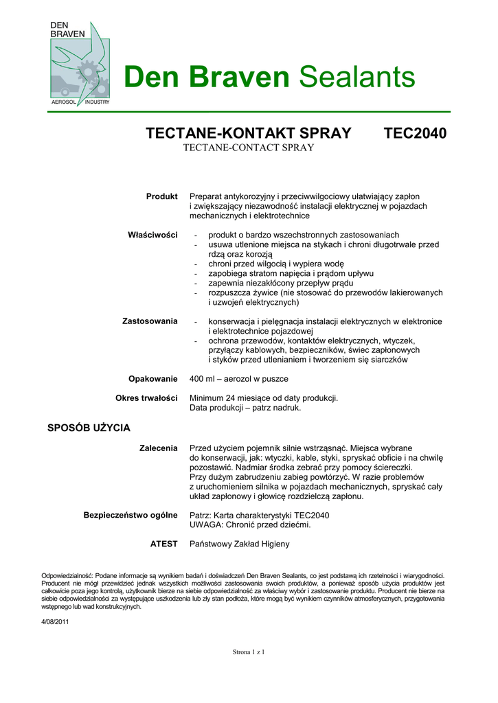 Den Braven Sealants TECTANE-KONTAKT SPRAY TEC2040 TECTANE-CONTACT SPRAY Produkt Właściwości Preparat antykorozyjny i przeciwwilgociowy ułatwiający zapłon i zwiększający niezawodność instalacji elektrycznej w pojazdach mechanicznych i elektrotechnice - Zastosowania - Opakowanie Okres trwałości produkt o bardzo wszechstronnych zastosowaniach usuwa utlenione miejsca na stykach i chroni długotrwale przed rdzą oraz korozją chroni przed wilgocią i wypiera wodę zapobiega stratom napięcia i prądom upływu zapewnia niezakłócony przepływ prądu rozpuszcza żywice (nie stosować do przewodów lakierowanych i uzwojeń elektrycznych) konserwacja i pielęgnacja instalacji elektrycznych w elektronice i elektrotechnice pojazdowej ochrona przewodów, kontaktów elektrycznych, wtyczek, przyłączy kablowych, bezpieczników, świec zapłonowych i styków przed utlenianiem i tworzeniem się siarczków 400 ml – aerozol w puszce Minimum 24 miesiące od daty produkcji. Data produkcji – patrz nadruk. SPOSÓB UŻYCIA Zalecenia Bezpieczeństwo ogólne ATEST Przed użyciem pojemnik silnie wstrząsnąć. Miejsca wybrane do konserwacji, jak: wtyczki, kable, styki, spryskać obficie i na chwilę pozostawić. Nadmiar środka zebrać przy pomocy ściereczki. Przy dużym zabrudzeniu zabieg powtórzyć. W razie problemów z uruchomieniem silnika w pojazdach mechanicznych, spryskać cały układ zapłonowy i głowicę rozdzielczą zapłonu. Patrz: Karta charakterystyki TEC2040 UWAGA: Chronić przed dziećmi. Państwowy Zakład Higieny Odpowiedzialność: Podane informacje są wynikiem badań i doświadczeń Den Braven Sealants, co jest podstawą ich rzetelności i wiarygodności. Producent nie mógł przewidzieć jednak wszystkich możliwości zastosowania swoich produktów, a ponieważ sposób użycia produktów jest całkowicie poza jego kontrolą, użytkownik bierze na siebie odpowiedzialność za właściwy wybór i zastosowanie produktu. Producent nie bierze na siebie odpowiedzialności za występujące uszkodzenia lub zły stan podłoża, które mogą być wynikiem czynników atmosferycznych, przygotowania wstępnego lub wad konstrukcyjnych. 4/08/2011 Strona 1 z 1