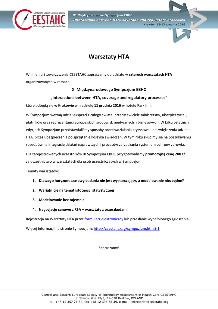 Warsztaty HTA W imieniu Stowarzyszenia CEESTAHC zapraszamy do udziału w czterech warsztatach HTA organizowanych w ramach XI Międzynarodowego Sympozjum EBHC „Interactions between HTA, coverage and regulatory processes” które odbędą się w Krakowie w niedzielę 11 grudnia 2016 w hotelu Park Inn. W Sympozjum wezmą udział eksperci z całego świata, przedstawiciele ministerstw, ubezpieczycieli, płatników oraz reprezentanci europejskich środowisk medycznych i biznesowych. W kilku ostatnich edycjach Sympozjum przedstawialiśmy sposoby przeciwdziałania kryzysowi – od zwiększenia udziału HTA, przez ubezpieczenia po sprzątanie koszyka świadczeń. W tym roku skupimy się na poszukiwaniu sposobów na integrację działań naprawczych i procesów zarządzania systemem ochrony zdrowia. Dla zarejestrowanych uczestników XI Sympozjum EBHC przygotowaliśmy promocyjną cenę 200 zł za uczestnictwo w warsztatach dla osób uczestniczących w Sympozjum. Tematy warsztatów: 1. Dlaczego horyzont czasowy badania nie jest wystarczający, a modelowanie niezbędne? 2. Waria(n)cje na temat istotności statystycznej 3. Modelowanie bez tajemnic 4. Negocjacje cenowe z RSA – warsztaty z przeszkodami Rejestracja na Warsztaty HTA przez formularz elektroniczny lub przesłanie wypełnionego zgłoszenia. Więcej informacji na stronie Sympozjum: http://ceestahc.org/sympozjum.html?i1. Zapraszamy! Central and Eastern European Society of Technology Assessment in Health Care CEESTAHC ul. Starowiślna 17/3, 31-038 Kraków, POLAND tel. +48 12 357 76 34, fax +48 12 396 38 39, e-mail: [email protected] Warsztaty nr 1 Dlaczego horyzont czasowy badania nie jest wystarczający, a modelowanie niezbędne? Data | Czas: niedziela, 11 grudnia 2016 | 120 min. | 11.00 – 13.00 Opis: Warsztaty bezpośrednio nawiązujące do aktualnej sytuacji refundacyjnej, kiedy to wyniki dla horyzontu czasowego badań klinicznych przywoływane są w kontekście opłacalności finansowania nowych leków. W trakcie warsztatów poruszony zostanie temat analizy krzywych przeżycia oraz ich modelowania w analizach ekonomicznych. Wymagania: Laptop z zainstalowanym pakietem Microsoft Office Limit miejsc: 15 osób (zapisy uczestników do wyczerpania miejsc) Prowadzący: Michał Pochopień Ekspert i praktyk w dziedzinie HTA i EBM. Pracuje jako kierownik zespołu w dziale ekonomicznym w firmie HTA Consulting. Absolwent matematyki na Uniwersytecie Jagiellońskim. Wstępna agenda warsztatów: 1 Horyzont czasowy badań klinicznych a horyzont analizy ekonomicznej. 2 Kiedy i dlaczego potrzebne jest modelowanie? 3 Podstawy analizy przeżycia. 4 Modelowanie krzywych przeżycia na podstawie dostępnych danych klinicznych. Cena: 200 zł netto (dla uczestników XI Sympozjum EBHC 2016 700 zł netto dla pozostałych osób Central and Eastern European Society of Technology Assessment in Health Care CEESTAHC ul. Starowiślna 17/3, 31-038 Kraków, POLAND tel. +48 12 357 76 34, fax +48 12 396 38 39, e-mail: [email protected] Warsztaty nr 2 Waria(n)cje na temat istotności statystycznej Data | Czas: niedziela, 11 grudnia 2016 | 120‐180 min. | 10.00 – 13.00 Opis: Warsztaty dedykowane dla osób bez specjalistycznego wykształcenia statystycznego, które na co dzień korzystają z wyników badań klinicznych, szczególnie analiz interim oraz w podgrupach. W trakcie warsztatów uczestnik dowie się jak interpretować istotność statystyczną wyniku oraz kiedy można wnioskować o różnicach efektów klinicznych w oparciu o p<0,05, a także kiedy nie jest to uprawnione. Wymagania: Laptop z zainstalowanym pakietem Microsoft Office. Znajomość arkusza kalkulacyjnego Excel, w tym umiejętność korzystania z funkcji oraz tworzenia wykresów. Znajomość podstawowych miar efektów stosowanych w badaniach klinicznych (RR, OR, MD) i przedziałów ufności oraz ich interpretacja. Limit miejsc: 15 osób (zapisy uczestników do wyczerpania miejsc) Prowadzący: Piotr Wojciechowski Ekspert i praktyk w dziedzinie HTA i EBM. Poza pracą na stanowisku kierownika projektu w firmie HTA Consulting prowadzi również szkolenia pomocne w zrozumieniu zasad EBM i interpretacji wyników badań klinicznych. Absolwent biotechnologii na Uniwersytecie Jagiellońskim. Wstępna agenda warsztatów: 1 Wartość p. Czym właściwie jest i co może nam powiedzieć. 2 Słów kilka o projektowaniu badań klinicznych: wielkość populacji punkty końcowe okres obserwacji moc badania 3 Słów kilka o analizie statystycznej i wnioskowaniu: Co nam mówią różnice istotne statystycznie? o I‐rzędowy punkt końcowy o kryteria przerwania badania Czy da się tak zaczarować badanie by pokazało różnice tam gdzie jej nie ma? o analizy śródokresowe o analizy warstwowe Cena: 200 zł netto dla uczestników XI Sympozjum EBHC 2016 700 zł netto dla pozostałych osób Central and Eastern European Society of Technology Assessment in Health Care CEESTAHC ul. Starowiślna 17/3, 31-038 Kraków, POLAND tel. +48 12 357 76 34, fax +48 12 396 38 39, e-mail: [email protected] Warsztaty nr 3 Modelowanie bez tajemnic Data | Czas: niedziela, 11 grudnia 2016 | 120‐180 min. | 13.00 – 16.00 Opis: Warsztat opracowany na podstawie książki Decision Modelling for Health Economic Evaluation. W trakcie zajęć uczestnicy wykonają samodzielnie replikację opublikowanego modelu Markova dla HIV z wykorzystaniem programu Microsoft Excel. Wymagania: Laptop z zainstalowanym pakietem Microsoft Office Dobra znajomość arkusza kalkulacyjnego Excel Limit miejsc: 15 osób (zapisy uczestników do wyczerpania miejsc) Robert Plisko Prezes firmy HTA Consulting. Farmakoekonomista, wykładowca akademicki, koordynator kilkudziesięciu projektów HTA, przeglądów systematycznych, badań kosztowych i ekonomicznych w zakresie produktów i technologii leczniczych. Prowadzący: Barbara Gad Ekspert i praktyk w dziedzinie HTA i EBM z kilkuletnim stażem. Pracuje jako kierownik zespołu w dziale ekonomicznym w firmie HTA Consulting. A