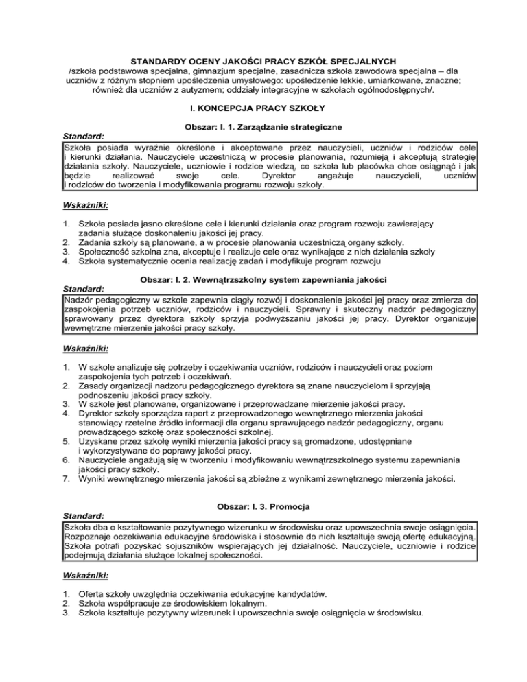 STANDARDY OCENY JAKOŚCI PRACY SZKÓŁ SPECJALNYCH /szkoła podstawowa specjalna, gimnazjum specjalne, zasadnicza szkoła zawodowa specjalna – dla uczniów z różnym stopniem upośledzenia umysłowego: upośledzenie lekkie, umiarkowane, znaczne; również dla uczniów z autyzmem; oddziały integracyjne w szkołach ogólnodostępnych/. I. KONCEPCJA PRACY SZKOŁY Obszar: I. 1. Zarządzanie strategiczne Standard: Szkoła posiada wyraźnie określone i akceptowane przez nauczycieli, uczniów i rodziców cele i kierunki działania. Nauczyciele uczestniczą w procesie planowania, rozumieją i akceptują strategię działania szkoły. Nauczyciele, uczniowie i rodzice wiedzą, co szkoła lub placówka chce osiągnąć i jak będzie realizować swoje cele. Dyrektor angażuje nauczycieli, uczniów i rodziców do tworzenia i modyfikowania programu rozwoju szkoły. Wskaźniki: 1. Szkoła posiada jasno określone cele i kierunki działania oraz program rozwoju zawierający zadania służące doskonaleniu jakości jej pracy. 2. Zadania szkoły są planowane, a w procesie planowania uczestniczą organy szkoły. 3. Społeczność szkolna zna, akceptuje i realizuje cele oraz wynikające z nich działania szkoły 4. Szkoła systematycznie ocenia realizację zadań i modyfikuje program rozwoju Obszar: I. 2. Wewnątrzszkolny system zapewniania jakości Standard: Nadzór pedagogiczny w szkole zapewnia ciągły rozwój i doskonalenie jakości jej pracy oraz zmierza do zaspokojenia potrzeb uczniów, rodziców i nauczycieli. Sprawny i skuteczny nadzór pedagogiczny sprawowany przez dyrektora szkoły sprzyja podwyższaniu jakości jej pracy. Dyrektor organizuje wewnętrzne mierzenie jakości pracy szkoły. Wskaźniki: 1. W szkole analizuje się potrzeby i oczekiwania uczniów, rodziców i nauczycieli oraz poziom zaspokojenia tych potrzeb i oczekiwań. 2. Zasady organizacji nadzoru pedagogicznego dyrektora są znane nauczycielom i sprzyjają podnoszeniu jakości pracy szkoły. 3. W szkole jest planowane, organizowane i przeprowadzane mierzenie jakości pracy. 4. Dyrektor szkoły sporządza raport z przeprowadzonego wewnętrznego mierzenia jakości stanowiący rzetelne źródło informacji dla organu sprawującego nadzór pedagogiczny, organu prowadzącego szkołę oraz społeczności szkolnej. 5. Uzyskane przez szkołę wyniki mierzenia jakości pracy są gromadzone, udostępniane i wykorzystywane do poprawy jakości pracy. 6. Nauczyciele angażują się w tworzeniu i modyfikowaniu wewnątrzszkolnego systemu zapewniania jakości pracy szkoły. 7. Wyniki wewnętrznego mierzenia jakości są zbieżne z wynikami zewnętrznego mierzenia jakości. Obszar: I. 3. Promocja Standard: Szkoła dba o kształtowanie pozytywnego wizerunku w środowisku oraz upowszechnia swoje osiągnięcia. Rozpoznaje oczekiwania edukacyjne środowiska i stosownie do nich kształtuje swoją ofertę edukacyjną. Szkoła potrafi pozyskać sojuszników wspierających jej działalność. Nauczyciele, uczniowie i rodzice podejmują działania służące lokalnej społeczności. Wskaźniki: 1. Oferta szkoły uwzględnia oczekiwania edukacyjne kandydatów. 2. Szkoła współpracuje ze środowiskiem lokalnym. 3. Szkoła kształtuje pozytywny wizerunek i upowszechnia swoje osiągnięcia w środowisku. 4. Szkoła systematycznie analizuje i modyfikuje swoje działania promocyjne. II. ZARZĄDZANIE I ORGANIZACJA Obszar: II. 1. Nauczyciele Standard: Nauczyciele zapewniają wysoki poziom pracy dydaktycznej, wychowawczej i opiekuńczej oraz wykonywanych zadań organizacyjnych. Prowadzone są eksperymenty i innowacje pedagogiczne oraz inne działania dające nauczycielom szanse samorealizacji. Ustalone są kryteria oceny jakości pracy nauczycieli. Sposób oceniania pracy oraz przyznawania nagród i dodatków motywacyjnych jest nauczycielom znany i przez nich akceptowany. Polityka kadrowa prowadzona przez dyrektora szkoły lub placówki jest planowana i realizowana stosownie do działań szkoły i kierunków jej rozwoju. Wskaźniki: 1. 2. 3. 4. 5. 6. Polityka kadrowa jest planowana i realizowana stosownie do zadań i potrzeb szkoły. Organizacja pracy nauczycieli służy zapewnieniu wysokiego poziomu jakości ich pracy. Sposób oceniania i motywowania jest czytelny i znany nauczycielom. Przestrzegane są przepisy dotyczące wymagań kwalifikacyjnych w zatrudnianiu nauczycieli. W szkole stworzone są warunki do podejmowania inicjatyw pedagogicznych. W szkole przestrzega się uprawnień rady pedagogicznej w zakresie opiniowania propozycji dyrektora w sprawach przydziału nauczycielom prac i zajęć dydaktycznych, wychowawczych i opiekuńczych. Obszar: II. 2. Rozwój zawodowy nauczycieli Standard: Rozwój zawodowy nauczycieli jest związany z jakościowym rozwojem szkoły oraz indywidualnymi potrzebami. Rozpoznawane są potrzeby w zakresie doskonalenia zawodowego związane z rozwojem szkoły i z indywidualnymi potrzebami nauczycieli. Wewnątrzszkolne doskonalenie zawodowe jest przemyślane, zaplanowane, systematyczne i właściwie organizowane. Nauczyciele stosują nabytą wiedzę i umiejętności w swojej pracy, a ich osiągnięcia są upowszechniane. Rozwój zawodowy jest uwzględniany w awansie zawodowym i w ocenach pracy nauczycieli. Wszystkim nauczycielom zostały stworzone równe szanse rozwoju zawodowego. Kolejne etapy awansu zawodowego nauczycieli są dobrze organizowane, a nauczyciele mają pełną świadomość wymagań. Oceny pracy i opinie o ich pracy wskazują na potrzeby rozwoju zawodowego. Analizowana jest skuteczność form doskonalenia zawodowego. Wskaźniki: 1. Rozpoznawane są potrzeby szkoły, rady pedagogicznej i poszczególnych nauczycieli w zakresie doskonalenia zawodowego. 2. W szkole istnieje system doskonalenia zawodowego nauczycieli. 3. Dyrektor szkoły wspiera nauczycieli w podnoszeniu jakości ich pracy poprzez: - tworzenie szans równego rozwoju - organizowanie opieki nad początkującymi nauczycielami - nadzorowanie i ocenianie p