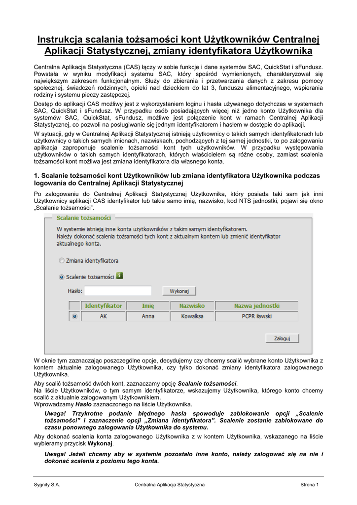 Instrukcja scalania tożsamości kont Użytkowników Centralnej Aplikacji Statystycznej, zmiany identyfikatora Użytkownika Centralna Aplikacja Statystyczna (CAS) łączy w sobie funkcje i dane systemów SAC, QuickStat i sFundusz. Powstała w wyniku modyfikacji systemu SAC, który spośród wymienionych, charakteryzował się największym zakresem funkcjonalnym. Służy do zbierania i przetwarzania danych z zakresu pomocy społecznej, świadczeń rodzinnych, opieki nad dzieckiem do lat 3, funduszu alimentacyjnego, wspierania rodziny i systemu pieczy zastępczej. Dostęp do aplikacji CAS możliwy jest z wykorzystaniem loginu i hasła używanego dotychczas w systemach SAC, QuickStat i sFundusz. W przypadku osób posiadających więcej niż jedno konto Użytkownika dla systemów SAC, QuickStat, sFundusz, możliwe jest połączenie kont w ramach Centralnej Aplikacji Statystycznej, co pozwoli na posługiwanie się jednym identyfikatorem i hasłem w dostępie do aplikacji. W sytuacji, gdy w Centralnej Aplikacji Statystycznej istnieją użytkownicy o takich samych identyfikatorach lub użytkownicy o takich samych imionach, nazwiskach, pochodzących z tej samej jednostki, to po zalogowaniu aplikacja zaproponuje scalenie tożsamości kont tych użytkowników. W przypadku występowania użytkowników o takich samych identyfikatorach, których właścicielem są różne osoby, zamiast scalenia tożsamości kont możliwa jest zmiana identyfikatora dla własnego konta. 1. Scalanie tożsamości kont Użytkowników lub zmiana identyfikatora Użytkownika podczas logowania do Centralnej Aplikacji Statystycznej Po zalogowaniu do Centralnej Aplikacji Statystycznej Użytkownika, który posiada taki sam jak inni Użytkownicy aplikacji CAS identyfikator lub takie samo imię, nazwisko, kod NTS jednostki, pojawi się okno „Scalanie tożsamości”. W oknie tym zaznaczając poszczególne opcje, decydujemy czy chcemy scalić wybrane konto Użytkownika z kontem aktualnie zalogowanego Użytkownika, czy tylko dokonać zmiany identyfikatora zalogowanego Użytkownika. Aby scalić tożsamość dwóch kont, zaznaczamy opcję Scalanie tożsamości. Na liście Użytkowników, o tym samym identyfikatorze, wskazujemy Użytkownika, którego konto chcemy scalić z aktualnie zalogowanym Użytkownikiem. Wprowadzamy Hasło zaznaczonego na liście Użytkownika. Uwaga! Trzykrotne podanie błędnego hasła spowoduje zablokowanie opcji „Scalenie tożsamości” i zaznaczenie opcji „Zmiana identyfikatora”. Scalenie zostanie zablokowane do czasu ponownego zalogowania Użytkownika do systemu. Aby dokonać scalenia konta zalogowanego Użytkownika z w kontem Użytkownika, wskazanego na liście wybieramy przycisk Wykonaj. Uwaga! Jeżeli chcemy aby w systemie pozostało inne konto, należy zalogować się na nie i dokonać scalenia z poziomu tego konta. Sygnity S.A. Centralna Aplikacja Statystyczna Strona 1 Instrukcja scalania tożsamości kont Użytkowników Centralnej Aplikacji Statystycznej, zmiany identyfikatora Użytkownika Po scaleniu kontem, które pozostanie w systemie, będzie konto, na które użytkownik zalogował się do systemu. Konto wskazane do scalania zostanie usunięte. Uprawnienia konta, wskazanego do scalenia, zostaną dopisane do konta, z poziomu którego nastąpiło scalenie. Aby zmienić identyfikator zalogowanego Użytkownika, zaznaczamy opcję Zmiana identyfikatora i wprowadzamy Nowy identyfikator. Zatwierdzamy zmianę przyciskiem Wykonaj. Identyfikator konta zalogowanego Użytkownika zostanie zmieniony. Jednocześnie zostaniemy przekierowani na stronę logowania, w celu ponownego zalogowania się z nowym identyfikatorem do aplikacji. Uwaga! Identyfikator możemy zmienić, tylko w sytuacji, gdy w aplikacji CAS istnieje drugi Użytkownik o takim samym identyfikatorze. 2. Scalania tożsamości kont Użytkowników z poziomu ustawień Użytkownika Proces scalania tożsamości kont użytkowników można uruchomić także z poziomu ustawień konta Użytkownika. W tym celu po zalogowaniu się do aplikacji CAS w głównym oknie wybieramy ikonę Otworzy się okno "Parametry użytkownika", w którym przechodzimy na zakładkę Scalanie tożsamości, gdzie możemy dokonać scalenia dwóch Użytkowników o tym samym identyfikatorze lub dwóch Użytkowników o takich samych imionach, nazwiskach, pochodzących z tej samej jednostki. W tym celu wprowadzamy Identyfikator i Hasło użytkownika, którego konto chcemy z scalić z kontem aktualnie zalogowanego Użytkownika, i wybieramy przycisk Wykonaj. Uwaga! Trzykrotne podanie błędnego hasła spowoduje zablokowanie możliwości scalenia tożsamości kont. Scalenie zostanie zablokowane do czasu ponownego zalogowania Użytkownika do systemu. Uwaga! Jeżeli chcemy aby w systemie pozostało inne konto, należy zalogować się na nie i dokonać scalenia z poziomu tego konta. Po scaleniu kontem, które pozostanie w systemie, będzie konto, na które użytkownik zalogował się do systemu. Konto wskazane do scalania zostanie usunięte. Sygnity S.A. Centralna Aplikacja Statystyczna Strona 2 Instrukcja scalania tożsamości kont Użytkowników Centralnej Aplikacji Statystycznej, zmiany identyfikatora Użytkownika Uprawnienia konta, wskazanego do scalenia, zostaną dopisane do konta, z poziomu którego nastąpiło scalenie. Sygnity S.A. Centralna Aplikacja Statystyczna Strona 3