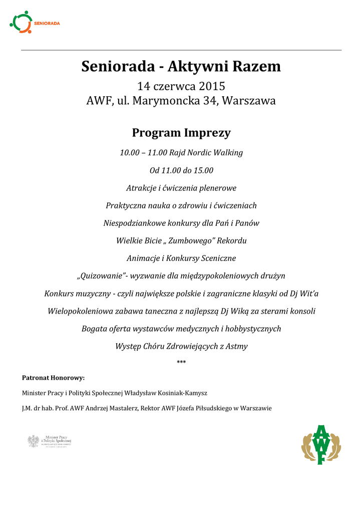 Seniorada - Aktywni Razem 14 czerwca 2015 AWF, ul. Marymoncka 34, Warszawa Program Imprezy 10.00 – 11.00 Rajd Nordic Walking Od 11.00 do 15.00 Atrakcje i ćwiczenia plenerowe Praktyczna nauka o zdrowiu i ćwiczeniach Niespodziankowe konkursy dla Pań i Panów Wielkie Bicie „ Zumbowego” Rekordu Animacje i Konkursy Sceniczne „Quizowanie”- wyzwanie dla międzypokoleniowych drużyn Konkurs muzyczny - czyli największe polskie i zagraniczne klasyki od Dj Wit’a Wielopokoleniowa zabawa taneczna z najlepszą Dj Wiką za sterami konsoli Bogata oferta wystawców medycznych i hobbystycznych Występ Chóru Zdrowiejących z Astmy *** Patronat Honorowy: Minister Pracy i Polityki Społecznej Władysław Kosiniak-Kamysz J.M. dr hab. Prof. AWF Andrzej Mastalerz, Rektor AWF Józefa Piłsudskiego w Warszawie Senioradowi wystawcy: 1. Pogotowie Rehabilitacyjne – na stanowisku o tym jak mimo upływu lat żyć aktywnie i zdrowo? Jak dbać o kręgosłup na co dzień? Fizjoterapeuci przeprowadzą dla chętnych masaże relaksacyjne oraz odpowiedzą na pytania: jak dbać o kręgosłup? 2. Związek Harcerstwa Rzeczypospolitej – w programie stanowiska: obóz harcerski – gry planszowe, liny, trampolina, poczęstunek w stylu obozowym: grochówka i kiełbaski. 3. Uniwersytet III Wieku w Łomiankach – warsztaty wyplatania różnych wyrobów ze zwiniętych gazet, technika decoupage, szydełko 4. Ośrodek Wsparcia dla Seniorów nr 1 – tańce integracyjne w kręgu, warsztaty plastyczne – biżuteria hand made i balonowe cuda, badanie mini mental 5. Ośrodek Wsparcia dla Seniorów nr 2 – występ zespołu Bielańskie Czerwone Korale, w ramach stanowiska warsztat wykonywania kwiatów z bibuły. 6. Skuteczna Komunikacja Monika Skorykow – gra Zośka, poradnictwo w zakresie skutecznej komunikacji 7. Gabinet Pomocy Psychologicznej „Empatia” – konsultacje psychologiczne, warsztaty, grupy wsparcia, testy psychotechniczne, badania na maszynach, refleks oraz postrzeganie przestrzenne. 8. Klub Przyjaciół Czosnowa – warsztaty haftu, wyroby z gazet, potrawy. 9. Gliniarnia Łomianki – warsztat z lepienia gliny. 10. Harcerska Grupa Ratownicza – zabezpieczenie medyczne, warsztat pierwszej pomocy. 11. Ciśnienie na życie – prezentacja III edycja ogólnopolskiej kampanii „Ciśnienie na Życie”. Organizatorzy kampanii, akcją bezpłatnych badań profilaktycznych, planują objąć mieszkańców ponad 50 polskich miast. Poza pomiarem ciśnienia tętniczego krwi, będzie również badany poziom cholesterolu we krwi. 12. Polskie Zrzeszenie Speedbadmintona – instruktaż gry w Speedbadmintona, informacja na temat wydarzeń związanych z dyscypliną. 13. Forum Zdrowia Mazowiecki Urząd Wojewódzki Wydział Zdrowia i Statystyki Medycznej i Programów Zdrowotnych – działalność FORUM ZDROWIA, materiały informacyjne 14. Fundacja Edukacji Społecznej – poradnictwo psycholog 15. Fundacja Neuropozytywni – Kwartalnik Świat Mózgu, Kwartalnik NeuroPozytywni 16. Fundacja Psychoonkologii i Promocji Zdrowia „Ogród Nadziei” – wegański poczęstunek, dieta antynowotworowa, zdrowe odżywianie, warsztat kulinarny 17. Fundacja Sedeka – kiermasz książki, konsultacje w postaci: masaż, relaksacja, fizjoterapia, psycholog 18. Klinika Rzucania palenia Allen Carr’s – konsultacje w zakresie rzucania palenia, konkurs. 19. Komenda Stołeczna Policji – Bezpieczeństwo w ruchu drogowym, prezentacja Mazowieckiej Akademii Seniora. 20. Krajowe Centrum ds. AIDS – quiz z nagrodami, poradnictwo w zakresie gdzie można anonimowo i bezpłatnie wykonać test na HIV. 21. Kuratorium Oświaty – Warszawa – konsultacje w zakresie Szkoła Promująca Zdrowie 22. Mazowiecki Oddział Wojewódzki Narodowego Funduszu Zdrowia – wydawanie Europejskiej Karty Ubezpieczenie Zdrowotnego, dostępu do Zintegrowanego Informatora Pacjenta 23. Mazowiecki Wojewódzki Inspektorat Inspekcji Handlowej – poradnictwo ochrony konsumentów seniorów 24. Ogólnopolska Sieć Osób Żyjących z HIV/AIDS” Sieć Plus” – książki, broszury, ulotki, nieodpłatne badania i konsultacje, konsultacje w zakresie wiedzy o HIV?AIDS, konsultacje opieki społecznej. 25. Rada Naczelna Polskiego Komitetu Pomocy Społecznej – Lecznica ROMA – pomiar ciśnienia, nieodpłatne badanie poziomu cukru, nieodpłatne badanie stężenia hemoglobiny 26. Stowarzyszenie Katolicki Ruch Antynarkotyczny KARAN – poradnictwo w zakresie problemów uzależnień, informacje o UTW, rozmowy na temat programu uniwersytetu, możliwość rozmowy z rodzicami dzieci uzależnionych 27. Stowarzyszenie MANKO – wydawanie bezpłatnej ogólnopolskiej Karty Seniora, dystrybucja magazynu Głos Seniora, badanie smokolizerem (zawartość szkodliwego tlenku węgla w wydychanym powietrzu) 28. Stowarzyszenie Taoistyczne Tai Chi – nauka ćwiczeń dla chętnych, pokaz ćwiczeń Tai Chi. 29. Fundacja Tam i z Powrotem Centrum Edukacji Zdrowotnej - dystrybucja materiałów i publikacji. 30. Towarzystwo Zdrowiejących z Astmy – szkolenia dla osób z problemami oddechowymi, badanie spirometria z wydrukiem, występ Chóru Zdrowiejących z Astmy. 31. Warszawska Grupa Społecznych Instruktorów Młodzieżowych Polskiego Czerwonego Krzyża - nauka pierwszej pomocy, malowanie twarzy dla dzieci, kostki origiami, autorska gra edukacyjno-profilaktyczna WG SIM PCK, puzzle i kolorowanki dla najmłodszych, nieodpłatne badania i konsultacje. 32. Wojewódzka Stacja Sanitarno-Epidemiologiczna – bezpieczne wakacje: poparzenia słoneczne, higiena osobista, profilaktyka chorób odkleszczowych. 33. Wojewódzki Ośrodek Koordynujący Populacyjne Programy Wczesnego Wykrywania Raka Piersi oraz Profilaktyki i Wczesnego Wykrywania Raka Szyjki Macicy, Centrum Onkologii Instytut – edukacja, nauka samobadania piersi, dystrybucja materiałów. Organizatorzy: Studenci specjalizacji kinezygerontoprofilaktyka AWF Warszawa Współfinansowanie: Partnerzy: 1. Partner ogólnopolski Seniorada - Rozrywka 