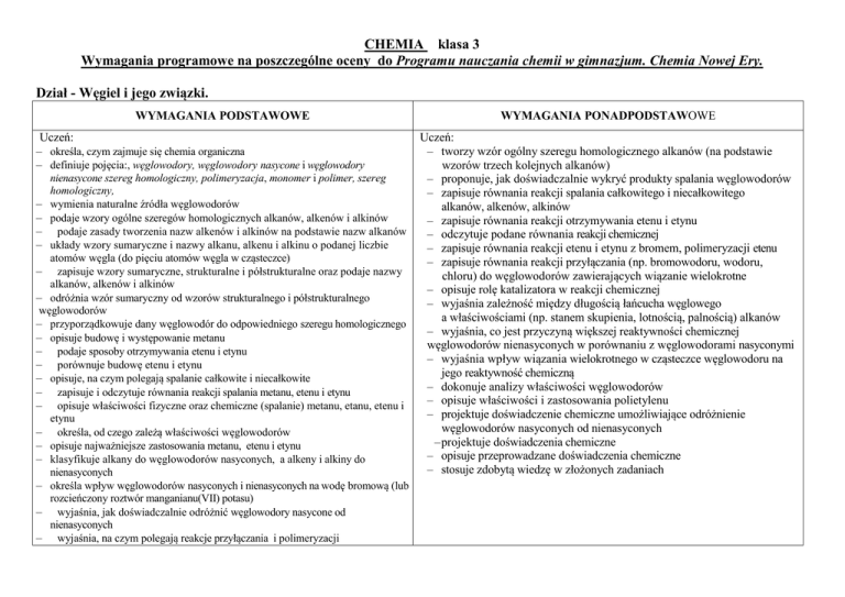 CHEMIA klasa 3 Wymagania programowe na poszczególne oceny do Programu nauczania chemii w gimnazjum. Chemia Nowej Ery. Dział - Węgiel i jego związki. WYMAGANIA PODSTAWOWE Uczeń: – określa, czym zajmuje się chemia organiczna – definiuje pojęcia:, węglowodory, węglowodory nasycone i węglowodory nienasycone szereg homologiczny, polimeryzacja, monomer i polimer, szereg homologiczny, – wymienia naturalne źródła węglowodorów – podaje wzory ogólne szeregów homologicznych alkanów, alkenów i alkinów – podaje zasady tworzenia nazw alkenów i alkinów na podstawie nazw alkanów – układy wzory sumaryczne i nazwy alkanu, alkenu i alkinu o podanej liczbie atomów węgla (do pięciu atomów węgla w cząsteczce) – zapisuje wzory sumaryczne, strukturalne i półstrukturalne oraz podaje nazwy alkanów, alkenów i alkinów – odróżnia wzór sumaryczny od wzorów strukturalnego i półstrukturalnego węglowodorów – przyporządkowuje dany węglowodór do odpowiedniego szeregu homologicznego – opisuje budowę i występowanie metanu – podaje sposoby otrzymywania etenu i etynu – porównuje budowę etenu i etynu – opisuje, na czym polegają spalanie całkowite i niecałkowite – zapisuje i odczytuje równania reakcji spalania metanu, etenu i etynu – opisuje właściwości fizyczne oraz chemiczne (spalanie) metanu, etanu, etenu i etynu – określa, od czego zależą właściwości węglowodorów – opisuje najważniejsze zastosowania metanu, etenu i etynu – klasyfikuje alkany do węglowodorów nasyconych, a alkeny i alkiny do nienasyconych – określa wpływ węglowodorów nasyconych i nienasyconych na wodę bromową (lub rozcieńczony roztwór manganianu(VII) potasu) – wyjaśnia, jak doświadczalnie odróżnić węglowodory nasycone od nienasyconych – wyjaśnia, na czym polegają reakcje przyłączania i polimeryzacji WYMAGANIA PONADPODSTAWOWE Uczeń: – tworzy wzór ogólny szeregu homologicznego alkanów (na podstawie wzorów trzech kolejnych alkanów) – proponuje, jak doświadczalnie wykryć produkty spalania węglowodorów – zapisuje równania reakcji spalania całkowitego i niecałkowitego alkanów, alkenów, alkinów – zapisuje równania reakcji otrzymywania etenu i etynu – odczytuje podane równania reakcji chemicznej – zapisuje równania reakcji etenu i etynu z bromem, polimeryzacji etenu – zapisuje równania reakcji przyłączania (np. bromowodoru, wodoru, chloru) do węglowodorów zawierających wiązanie wielokrotne – opisuje rolę katalizatora w reakcji chemicznej – wyjaśnia zależność między długością łańcucha węglowego a właściwościami (np. stanem skupienia, lotnością, palnością) alkanów – wyjaśnia, co jest przyczyną większej reaktywności chemicznej węglowodorów nienasyconych w porównaniu z węglowodorami nasyconymi – wyjaśnia wpływ wiązania wielokrotnego w cząsteczce węglowodoru na jego reaktywność chemiczną – dokonuje analizy właściwości węglowodorów – opisuje właściwości i zastosowania polietylenu – projektuje doświadczenie chemiczne umożliwiające odróżnienie węglowodorów nasyconych od nienasyconych – projektuje doświadczenia chemiczne – opisuje przeprowadzane doświadczenia chemiczne – stosuje zdobytą wiedzę w złożonych zadaniach – wykonuje proste obliczenia dotyczące węglowodorów Dział - Pochodne węglowodorów. WYMAGANIA PODSTAWOWE WYMAGANIA PONADPODSTAWOWE Uczeń: – podaje pojęcia: grupa funkcyjna, alkohole, alkohole polihydroksylowe, kwasy karboksylowe estry, aminy i aminokwasy – opisuje budowę pochodnych węglowodorów (grupa węglowodorowa + grupa funkcyjna) – klasyfikuje daną substancję organiczną do odpowiedniej grupy związków chemicznych – wymienia reguły tworzenia nazw systematycznych związków organicznych – zapisuje nazwy i wzory omawianych grup funkcyjnych – zaznacza grupy funkcyjne w alkoholach, kwasach karboksylowych, estrach, aminach i aminokwasach i podaje ich nazwy – zapisuje wzory ogólne alkoholi, kwasów karboksylowych i estrów – uzasadnia stwierdzenie, że alkohole i kwasy karboksylowe tworzą szeregi homologiczne – zapisuje wzory sumaryczne i strukturalne prostych alkoholi monohydroksylowych oraz tworzy ich nazwy – zapisuje wzory sumaryczny i strukturalny glicerolu – podaje odczyn roztworu alkoholu – opisuje fermentację alkoholową – zapisuje równania reakcji spalania metanolu i etanolu – opisuje zagrożenia związane z alkoholami (metanol, etanol) – opisuje najważniejsze właściwości metanolu, etanolu, glicerolu oraz kwasów etanowego i metanowego – opisuje podstawowe zastosowania etanolu i kwasu etanowego – dokonuje podziału alkoholi na monohydroksylowe, polihydroksylowe oraz kwasów karboksylowych na nasycone i nienasycone – zaznacza we wzorze kwasu karboksylowego resztę kwasową – podaje nazwy zwyczajowe omawianych kwasów karboksylowych (mrówkowy, octowy) – podaje przykłady kwasów organicznych występujących w przyrodzie i Uczeń: – wyjaśnia, dlaczego alkohol etylowy wykazuje odczyn obojętny – wyjaśnia, w jaki sposób tworzy się nazwę systematyczną glicerolu – zapisuje równania reakcji spalania alkoholi – podaje nazwy systematyczne kwasów karboksylowych – wyjaśnia, dlaczego wyższe kwasy karboksylowe nazywa się kwasami tłuszczowymi – porównuje właściwości kwasów organicznych i nieorganicznych – porównuje właściwości kwasów karboksylowych – podaje metodę otrzymywania kwasu octowego – wyjaśnia proces fermentacji octowej – opisuje równania reakcji chemicznych dla kwasów karboksylowych – podaje nazwy soli kwasów organicznych – określa miejsce występowania wiązania podwójnego w cząsteczce kwasu oleinowego – projektuje doświadczenie chemiczne umożliwiające odróżnienie kwasów oleinowego od palmitynowego lub stearynowego – zapisuje równania reakcji chemicznych prostych kwasów karboksylowych z alkoh