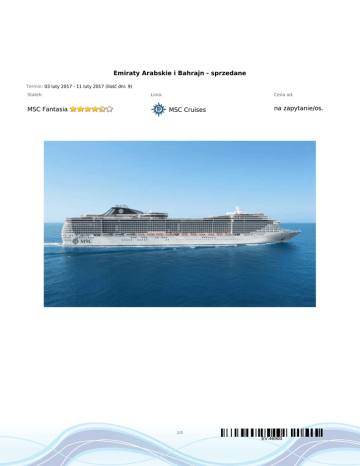 Emiraty Arabskie i Bahrajn - sprzedane Termin: 03 luty 2017 - 11 luty 2017 (ilość dni: 9) Statek: MSC Fantasia Linia: Cena od: MSC Cruises na zapytanie/os. 1/3 EV:46900 TRASA REJSU dzień 1 Data Port Wpłynięcie Wypłynięcie piątek 03.02.2017 Warszawa --:-- --:-- Legenda Polska Spotkanie z pilotem na lotnisku w Warszawie. Przelot do Dubaju. Transfer do hotelu, zakwaterowanie, nocleg. dzień 2 sobota 04.02.2017 Dubaj --:-- 23:00 Zjednoczone Emiraty Arabskie Śniadanie w hotelu, wykwaterowanie, czas wolny lub udział w fascynującej wycieczce pozwalającej poznać najciekawsze miejsca w mieście: Burj Al Arab, Meczet Jumeirah, dzielnica Bastakia, Pałac Zabeel, Fort Al Fahidi oraz słynne Creek. Transfer do portu i zaokrętowanie na statek. dzień 3 niedziela 05.02.2017 Abu Zabi 05:00 23:00 Zjednoczone Emiraty Arabskie Czas wolny lub udział w wycieczce fakultatywnej, podczas której zobaczymy wiele znakomitych przykładów drapaczy chmur, willi i pałaców. Zobaczymy też Meczet Szejka Zayeda, starą wioskę rybacką, beduińskie namioty w ramach zabytkowej wioski Heritage Village. dzień 4 poniedziałek 06.02.2017 Sir Bani Yas Island 09:00 17:00 Zjednoczone Emiraty Arabskie Czas wolny lub fakultatywny wyjazd taksówką wodną na pobyt w resorcie z lunchem (sporty wodne, wypoczynek przy basenie), przejażdżka na krótką wycieczkę "Nature and Wildlife", powrót do resortu i ciąg dalszy wypoczynku i później powrot na statek. dzień 5 wtorek 07.02.2017 Dzień na morzu --:-- --:-- dzień 6 środa 08.02.2017 Bahrajn 08:00 18:00 Bahrajn Czas wolny lub udział w wycieczce fakultatywnej, pokazującej najciekawsze atrakcje Królestwa Bahrajnu. dzień 7 Doha czwartek 09.02.2017 08:00 18:00 Katar Czas wolny lub udział w wycieczce fakultatywnej pozwalającej zobaczyć Al Wakra, waterfront, tradycyjne souki i poznać tą fascynującą kulturę. dzień 8 piątek 10.02.2017 Dubaj 09:00 --:-- --:-- --:-- Zjednoczone Emiraty Arabskie Czas wolny na ostatnie zakupy. dzień 9 sobota 11.02.2017 Dubaj Zjednoczone Emiraty Arabskie Wyokrętowanie ze statku, transfer na lotnisko i przelot do Polski. Zakończenie imprezy. CENNIK Cena katalogowa Kabina wewnętrzna 4 045.00zł Kabina zewnętrzna z oknem 4 375.00zł Kabina zewnętrzna z balkonem 5 175.00zł Cena promocyjna 2/3 EV:46900 3 i 4 osoba dorosła w kabinie na zapytanie dziecko do 18 lat jako 3 i 4 osoba w kabinie na zapytanie Opłaty portowe i obowiązkowe Bilet lotniczy (w PLN) w cenie ok. 2400 zł Uwaga! Ceny za osobę w kabinie dwuosobowej. Cena zawiera: 8 dniowy rejs statkiem MSC Fantasia - zakwaterowanie w kabinie wybranej kategorii; pełne wyżywienie w trakcie rejsu: 3 główne posiłki i przekąski między posiłkami; napoje serwowane do śniadania i w bufetach samoobsługowych; serwis bagażowy podczas wejścia i zejścia ze statku oraz serwis kabinowy; korzystanie ze wszystkich urządzeń sportowo - rekreacyjnych znajdujących się na pokładzie statku (basen, jacuzzi, sala fitness, itp.); udział we wszystkich imprezach organizowanych na statku (przedstawienia w teatrze, koncerty, programy animacyjne itp.); 1 nocleg ze śniadaniem w hotelu 3* w Dubaju przed rejsem; podatki, opłaty portowe i ubezpieczenie KL, NNW i bagażu; opiekę polskiego pilota w trakcie całej imprezy. Cena nie zawiera: biletu lotniczego na trasie Warszawa - Dubaj - Warszawa; wycieczek fakultatywnych w trakcie rejsu; korzystania z barów, mini baru w kabinie oraz napojów zamawianych w restauracji; korzystania z punktów usługowych (fryzjer, pralnia, fotograf, salon piękności i odnowy biologicznej, internet); ubezpieczenia od kosztów rezygnacji i chorób przewlekłych; napiwków dla obsługi na statku (ok. 10EUR/os./dzień) Uwagi: kabiny 1, 3 i 4 osobowe są na zapytanie i sprzedawane tylko po potwierdzeniu; grupa z polskim pilotem realizowana przy min. 16 osobach; istnieje możliwość wykupienia pakietu All inclusive obejmującego wybrane napoje alkoholowe i bezalkoholowe dostępne bez ograniczeń we wszystkich barach. Cena pakietu 26 EUR/dzień/os. dorosła i 12 EUR/dzień/dziecko. Warunkiem skorzystania z pakietu all inclusive jest wykupienie przez wszystkich pasażerów podróżujących w jednej kabinie na czas całego rejsu Bilet lotniczy: Powyższa cena dotyczy przelotu w klasie ekonomicznej i została podana w oparciu o cenę z dnia przygotowania oferty. Dokładna cena przelotu podawana jest w momencie rezerwacji. Proponowany przelot liniami lotniczymi Lufthansa. Przelot WARSZAWA - DUBAJ Przelot DUBAJ - WARSZAWA 03.02.2017 | Warszawa - Frankfurt: 09:45- 11:35 12.02.2017 | Dubaj - Frankfurt: 01:50 - 05:45 03.02.2017 | Dubaj - Frankfurt: 13:30 - 22:45 12.02.2016 | Frankfurt - Warszawa: 07:25 - 08:55 3/3 EV:46900