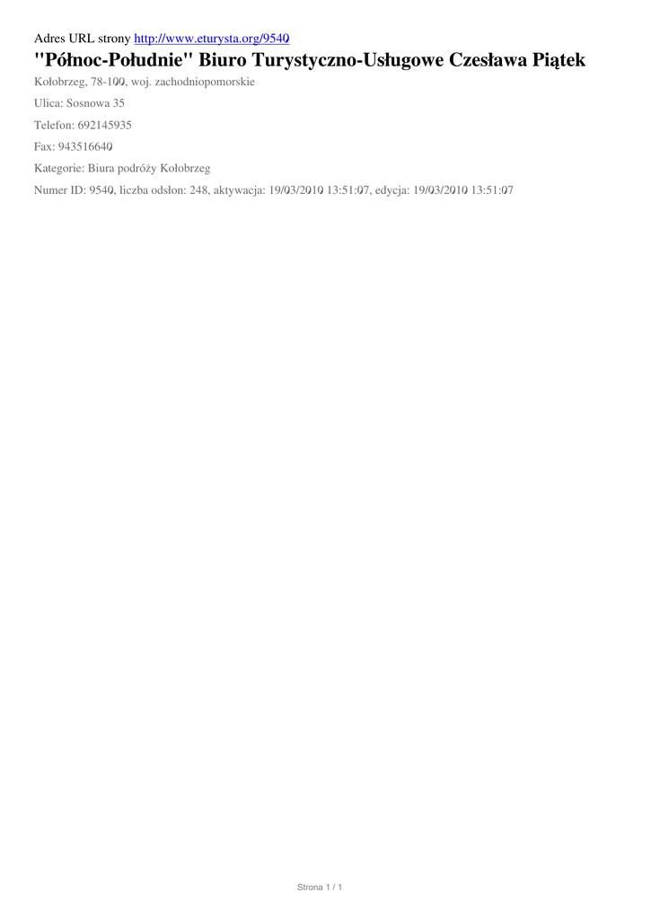 Adres URL strony http://www.eturysta.org/9540 "Północ-Południe" Biuro Turystyczno-Usługowe Czesława Piątek Kołobrzeg, 78-100, woj. zachodniopomorskie Ulica: Sosnowa 35 Telefon: 692145935 Fax: 943516640 Kategorie: Biura podróży Kołobrzeg Numer ID: 9540, liczba odsłon: 248, aktywacja: 19/03/2010 13:51:07, edycja: 19/03/2010 13:51:07 Strona 1 / 1