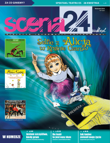 ZA CO GINIEMY? SPEKTAKL TEATRU ES 28 KWIETNIA s. 6 Kwiecień 2016 Nr 4(26) B I U L E T Y N I N F O R M A C J I K U L T U R A L N E Talent on the move | s. 4 Mały Książę | s. 5 Gala najpiękniejszych arii | s. 6 W NUMERZE s. 8-9 s. 12-13 s. 14-15 [rozmowa z Dominiką Ostałowską] [rozmowa z Janem Kobuszewskim] [wypowiedzi gości Sceny 24] Jestem szczęśliwa, kiedy gram Bo teatr to jest nasz dom Jak taniec zmienił moje życie J REKLAMA MECENAS KULTURY SIEDLECKIEJ prezentuje oraz druk ofsetowy i cyfrowy - kalendarze, katalogi, książki, czasopisma i.in. druk wielkoformatowy: banery, siatki, oklejanie samochodów i szyb wystawowych gadżety reklamowe P.P.H.”IWONEX” Ujrzanów 289, 08-110 Siedlce tel. (25) 633 33 10, tel./fax (25) 644 62 67, kom. 502 173 710 e-mail: [email protected], www.iwonex.com.pl DRUKUJEMY od 1995 roku KWIECIEŃ 2016 Biuletyn Informacji Kulturalnej |3 SONDA CO MNIE BAWI I ŚMIESZY? Wiosna RAFAŁ ZBIEĆ Wiosna - cieplejszy wieje wiatr, kabareciarz Wiosna - znów nam ubyło lat, Najbardziej bawią mnie moje nieudolne próby przygotowania śniadania wielkanocnego i innych kulinariów, ale na szczęście są w mojej rodzinie osoby, które robią to znacznie lepiej. Bawią mnie moi koledzy z kabaretów. Do tej pory, z braku czasu, nie chodziłem na występy innych kabaretów. Ale moja córka dorasta i chciałem jej pokazać kabarety i solistów, zaczęliśmy więc wspólnie chodzić na ich występy i parę rzeczy mnie naprawdę rozśmieszyło - ostatnio występ Grzegorza Halamy. Po raz pierwszy odkryłem to, co ludzie wynoszą z kabaretu: relaks, rozrywkę, dobrą zabawę. Lubię obserwować ludzi. Ostatnio śmieszą mnie, a jednocześnie niepokoją, bitwy internetowe, fejsbukowe batalie na tematy polityczno-społeczne. Przez nie coraz więcej ludzi oddala się od siebie, dzieli na wrogie obozy. Wiosna, wiosna w koło, rozkwitły bzy. Śpiewa skowronek nad nami, Drzewa strzeliły pąkami, Wszystko kwitnie w koło, i ja, i Ty. Ktoś na niebie owce wypasa, hej Popatrz zakwitł już Twój parasol, hej Nawet w bramie pan Walenty stróż, puszcza wiosną pierwsze pędy , już. Portret dziadzia rankiem wyszedł z ram, I na spacer poszedł sobie sam. URSZULA GOTOWICKA ARKADIUSZ MAZURKIEWICZ aktorka radny miasta Siedlce, nauczyciel Nad komedie przedkładam piekielnie zabawne anegdoty o ich twórcach. Śmieję się, z pewną czułością, kiedy aktorzy podczas granego spektaklu walczą, używając całej swej inteligencji i dowcipu, ze złośliwością materii i/lub partnera. Rechoczę przy błyskotliwych popisach artystów teatrów improwizowanych. Ale na kolana rzucają mnie genialne tragifarsy; teraz jestem na etapie zachwytów nad dziełami Hanocha Levina. W pracy, ze ściany, z powagą godną komika wszech czasów spogląda na mnie włóczęga w meloniku. I jego Brzdąc. Oj, tak, brzdące potrafią rozbawić niezgorzej... Ja: - Córeczko, możesz mnie namalować trochę ładniejszą? Olga, lat 7, patrzy na swój rysunek, na mnie, znów na rysunek. - Nie. I śmieszno, i straszno. Śmieszy mnie to i bawi, że wstaję codziennie o godz. 430. Co innego? Sytuacje - w domu, na ulicy, w szkole, gdzie pracuję, w sklepie – bardzo często doprowadzają mnie do łez. Bawi mnie scena polityczna, ale tylko wtedy, kiedy poziom dyskusji jest na wysokim poziomie i z pewną dozą humoru. Uwielbiam oglądać polskie komedie i kabarety, szczególnie „Czterdziestolatka”. Potrafię się przy tym śmiać również z siebie. Najbardziej wartościowe pod tym względem są jednak dyskusje z dziećmi, które spontanicznie wyrażają swoje opinie i poglądy. Wartościowymi pod kątem śmiechu, które też bardzo lubię, są życiowe motta i cytaty, tzw. kierunkowskazy. Cieszę się z tego, jak bardzo często potrafię rozbawić koleżankę czy kolegę, poprawiając im humor. Nie przeszkadza tytuł, wiek i płeć, By zielono wiosną w głowie mieć. Znajdziesz nas: CKiS im. A. Meżeryckiego Scena Teatralna Miasta Siedlce, ul. Bpa I. Świrskiego 31 Michał Bobrowski 4-6 Repertuar CKiS na kwiecień 7 Co za miesiąc? Punkt Informacji Miasta Siedlce, Galeria Siedlce, ul. Piłsudskiego 74 Urząd Miasta Siedlce, Skwer Niepodległości 2 Starostwo Powiatowe, ul. Piłsudskiego 40 8-9 Gość miesiąca - rozmowa Urząd Gminy Siedlce, ul. Asłanowicza 10 z Dominiką Ostałowską Klub Rafa, ul. Rynkowa 24 10 Edukacja PIT Piękna 7, ul. Pułaskiego 7 Arche – park handlowy, Hotel Arche, ul. Brzeska 134 Poradnia Psychologiczno - Pedagogiczna, ul. Kleeberga 2 12-13 Rozmowy teatralne UPH, Biblioteka Główna. ul. ks. Popiełuszki 9 z Janem Kobuszewskim Dworzec PKP, Pl. Zdanowskiego 1 14-15 Goście Sceny 24 o tańcu Nove Kino, ul. Wiszniewskiego 4 Park Wodny Siedlce, ul. Jana Pawła II 6 Sieć sklepów TOPAZ 17 Artyści i ich dzieła Salon samochodowy Jastrzębski S.A., ul. Targowa 20 18-19 Mini przewodnik po Biblioteka Miejska, ul. Piłsudskiego 5 Szkoła Muzyczna, ul. Podlaska 14 regionie Muzeum Regionalne, ul. Piłsudskiego 1 21 Kultura po sąsiedzku Szpital Miejski, Przychodnia lekarska, ul. Mazurska 2 22-23 Bazar kulturalny Cukiernia Klonowa, ul. Piłsudskiego 19 Szpital Wojewódzki, ul. Poniatowskiego 26 Nauczycielskie Kolegium Języków Obcych, ul. Asłanowicza 2 Bollywood Hollywood, ul. Wiszniewskiego 4 Hotel Janusz, ul. Pusta 15 „Kobieta z parasolem” Claude Monet Kwiecień 2016 Nr 4(26) Centrum Doskonalenia Nauczycieli, ul. Asłanowicza 2 Brofaktura, ul. Armii Krajowej 5 SCENA 24 – Scena Teatralna Miasta Siedlce 4 | www.facebook.com/ckis.siedlce R E P E R T U A R www.ckis.siedlce.pl S C E N A T E AT R A L N A M I A S TA S I E D L C E KWIECIEŃ 2016 aktualności teatralne w w w.ckis.siedlce.pl w w w.scena24.siedlce.pl 3 KWIETNIA (niedziela) SPEKTAKL LODOWA KRAINA godz. 16:00 miejsce: Scena Teatralna Miasta Siedlce Wykonanie: Szkoła Tańca do Caro Dance Reżyseria i choreografia: Katarzyna Bondarczuk 4, 6, 7 KWIETNIA SPEKTAKLE 17 KWIETNIA (niedziela) Pol nd TALENT ON THE MOVE godz. 17:00 mi