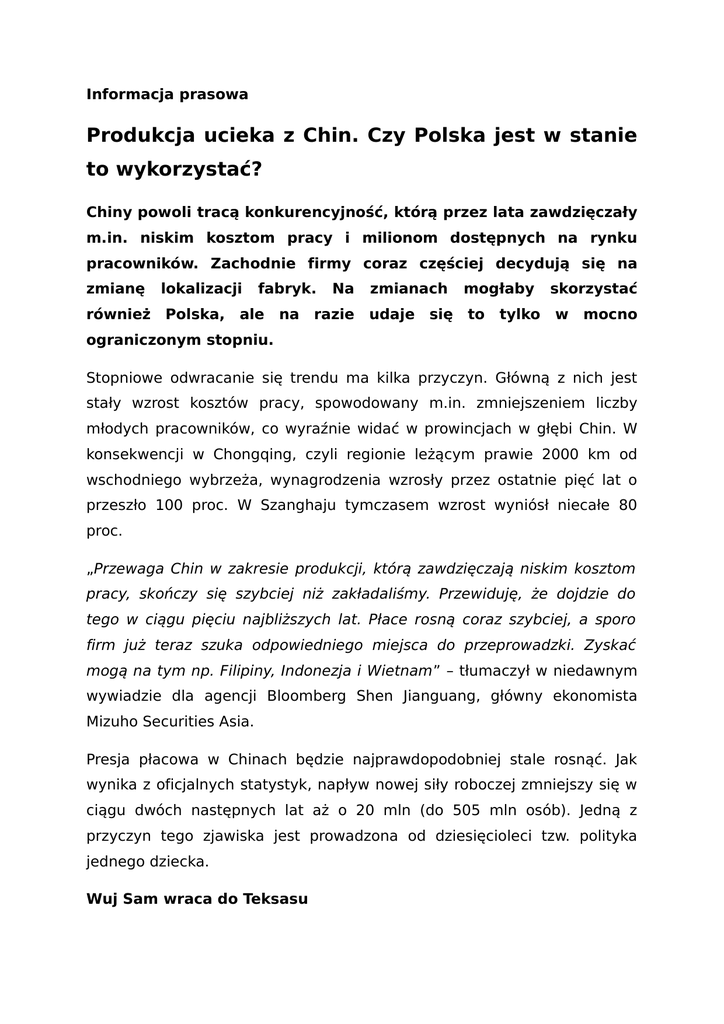 Informacja prasowa Produkcja ucieka z Chin. Czy Polska jest w stanie to wykorzystać? Chiny powoli tracą konkurencyjność, którą przez lata zawdzięczały m.in. niskim kosztom pracy i milionom dostępnych na rynku pracowników. Zachodnie firmy coraz częściej decydują się na zmianę również lokalizacji Polska, fabryk. ale na Na razie zmianach mogłaby udaje to się tylko skorzystać w mocno ograniczonym stopniu. Stopniowe odwracanie się trendu ma kilka przyczyn. Główną z nich jest stały wzrost kosztów pracy, spowodowany m.in. zmniejszeniem liczby młodych pracowników, co wyraźnie widać w prowincjach w głębi Chin. W konsekwencji w Chongqing, czyli regionie leżącym prawie 2000 km od wschodniego wybrzeża, wynagrodzenia wzrosły przez ostatnie pięć lat o przeszło 100 proc. W Szanghaju tymczasem wzrost wyniósł niecałe 80 proc. „Przewaga Chin w zakresie produkcji, którą zawdzięczają niskim kosztom pracy, skończy się szybciej niż zakładaliśmy. Przewiduję, że dojdzie do tego w ciągu pięciu najbliższych lat. Płace rosną coraz szybciej, a sporo firm już teraz szuka odpowiedniego miejsca do przeprowadzki. Zyskać mogą na tym np. Filipiny, Indonezja i Wietnam” – tłumaczył w niedawnym wywiadzie dla agencji Bloomberg Shen Jianguang, główny ekonomista Mizuho Securities Asia. Presja płacowa w Chinach będzie najprawdopodobniej stale rosnąć. Jak wynika z oficjalnych statystyk, napływ nowej siły roboczej zmniejszy się w ciągu dwóch następnych lat aż o 20 mln (do 505 mln osób). Jedną z przyczyn tego zjawiska jest prowadzona od dziesięcioleci tzw. polityka jednego dziecka. Wuj Sam wraca do Teksasu Wśród firm decydujących się lub rozważających porzucenie Chin przeważa biznes amerykański. Decyzję o przeniesieniu części produkcji do samych Stanów podjęły w ostatnim czasie tak znane firmy, jak np. Apple, Motorola i Whirlpool. Znaczenie odzyskuje również Europa, będąca jednym z głównych rynków zbytu dla dużych koncernów. Szczególnie widoczne jest to w branży spożywczej i motoryzacyjnej. Co ciekawe, mniej przedsiębiorstw wybiera inne państwa azjatyckie. Szczególnie widoczne stało się to po kwietniowej katastrofie budowlanej w Dhaki (Bangladesz), gdzie zginęło ponad 1000 pracowników fabryki odzieżowej. Wizerunek produkujących w tym regionie firm został mocno nadszarpnięty. Na opłacalność powrotu do USA wpływają jednak przede wszystkim znacznie malejące w ostatnich latach koszty energii. To efekt łupkowej rewolucji, dzięki której Stany mogą się pochwalić jednymi z najtańszych na świecie cen gazu. W połączeniu z wysokimi kosztami transportu towarów z Azji i ich większą wadliwością czynnik wysokich kosztów pracy w USA przestaje mieć znaczenie decydujące. W przyciąganiu produkcji dominuje wschodnia część kraju, m.in. Wyoming, Południowa Dakota, Nevada, Utah i Teksas. Powód jest stosunkowo prosty – stany te charakteryzują się najkorzystniejszymi zasadami opodatkowania działalności gospodarczej (wg rankingu pn. „2014 State Business Tax Climate Index”, opracowanego przez Tax Foundation). Nad Wisłą bez zmian? Według danych Eurostatu przeciętne godzinowe koszty pracy w strefie euro wynoszą obecnie ok. 28 euro. W „nowych” państwach członkowskich Unii Europejskiej koszty są zdecydowanie niższe. Przodują pod tym względem Bułgaria (3,7 euro za godzinę pracy), Rumunia (4,4 euro), Litwa (5,8 euro), Łotwa (6 euro) i Polska (7,4 euro). Dla porównania, w Niemczech godzina pracy kosztuje średnio aż 30,4 euro, a w Belgii – 37,2 euro. Niskie koszty pracy od lat pozostają, obok stosunkowo wysokiego kapitału społecznego elementem (m.in. dostęp do przyciągającym wykwalifikowanych nad Wisłę kadr), potencjalnych głównym inwestorów. Możliwości rozwoju ograniczają z drugiej strony m.in. liczne bariery prawno-administracyjne. Jak wynika z „Czarnej Listy Barier 2013”, opublikowanej przez Konfederację Lewiatan, takich ograniczeń dla prowadzenia biznesu jest 417. Niestety, liczba ta nie maleje, a wręcz przeciwnie – względem poprzedniego roku zwiększyła się o 49. Niekorzystne światowych warunki dla organizacji. biznesu W potwierdzają „Paying Taxes również 2013”, rankingi klasyfikującym przyjazność systemów podatkowych, Polska uplasowała się na odległym, 114. miejscu. Przed nią znalazły się m.in. Kambodża, Etiopia oraz Afganistan. W dłuższej perspektywie prawdopodobnie poprawić pozycję rozpoczęcie gospodarczą eksploatacji Polski złóż mogłoby łupkowych. Obecnie bowiem ceny gazu, istotnego m.in. dla branży chemicznej, należą – wskutek niekorzystnej umowy z Gazpromem – do najwyższych w Europie. Rozpoczęcie wydobycia łupków stoi pod znakiem zapytania. Rząd Donalda Tuska, mimo zapowiedzi sprzed kilku lat, nadal nie wprowadził jasnych zasad prawnych, dotyczących m.in. opodatkowania, co w oczywisty sposób zniechęca do inwestycji. Produkcja w Polsce? Tak, ale… Wyniki polskiego przemysłu za ostatnie miesiące pokazują, że gospodarka może wyjść z obecnej stagnacji. Według najnowszych danych GUS, we wrześniu – po wielu miesiącach, kiedy wskaźniki były słabe – produkcja przemysłowa wzrosła o 6,2 proc. rok do roku. Analitycy oczekiwali wzrostu na poziomie 7 proc., ale i tak w większości działów gospodarki odnotowano poprawę. Najlepszymi wynikami mogą pochwalić się firmy zajmujące się produkcją samochodów, przyczep, naczep oraz części do nich (wzrost o 14,1 proc.), wyrobów z drewna, korka, słomy i wikliny (+13,7 proc.) oraz wyrobów farmaceutycznych (+13,7 proc.). To właśnie branża motoryzacyjna jest od dawna jedną z głównych sił napędowych polskiej gospodarki. W pierwszym półroczu 2013 r. wyeksportowała w sumie towary o wartości 9,2 mld euro. Jak wskazują analitycy z Automotive Suppliers, ostatnie dane zwiastują co najmniej stabilizację, a może i dalszą poprawę. Jedn