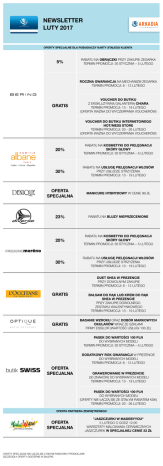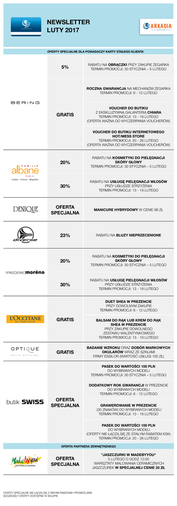 NEWSLETTER LUTY 2017 OFERTY SPECJALNE DLA POSIADACZY KARTY STAŁEGO KLIENTA 5% RABATU NA OBRĄCZKI PRZY ZAKUPIE ZEGARKA TERMIN PROMOCJI: 30 STYCZNIA – 5 LUTEGO ROCZNA GWARANCJA NA MECHANIZM ZEGARKA TERMIN PROMOCJI: 6 - 12 LUTEGO GRATIS VOUCHER DO BUTIKU Z EKSKLUZYWNĄ GALANTERIĄ CHIARA TERMIN PROMOCJI: 13 - 19 LUTEGO (OFERTA WAŻNA DO WYCZERPANIA VOUCHERÓW) VOUCHER DO BUTIKU INTERNETOWEGO HOT/MESS STORE TERMIN PROMOCJI: 20 - 26 LUTEGO (OFERTA WAŻNA DO WYCZERPANIA VOUCHERÓW) 20% RABATU NA KOSMETYKI DO PIELĘGNACJI SKÓRY GŁOWY TERMIN PROMOCJI: 30 STYCZNIA – 5 LUTEGO 30% RABATU NA USŁUGĘ PIELĘGNACJI WŁOSÓW PRZY USŁUDZE STRZYŻENIA TERMIN PROMOCJI: 13 - 19 LUTEGO OFERTA SPECJALNA MANICURE HYBRYDOWY W CENIE 99 ZŁ 23% RABATU NA BLUZY NIEPRZECENIONE 20% RABATU NA KOSMETYKI DO PIELĘGNACJI SKÓRY GŁOWY TERMIN PROMOCJI: 30 STYCZNIA – 5 LUTEGO 30% RABATU NA USŁUGĘ PIELĘGNACJI WŁOSÓW PRZY USŁUDZE STRZYŻENIA TERMIN PROMOCJI: 13 - 19 LUTEGO DUET SHEA W PREZENCIE PRZY DOWOLNYM ZAKUPIE TERMIN PROMOCJI: 6 - 12 LUTEGO GRATIS B U T I K O P T Y C Z N Y GRATIS BALSAM DO RĄK LUB KREM DO RĄK SHEA W PREZENCIE PRZY ZAKUPIE DOWOLNEGO ZESTAWU WALENTYNKOWEGO TERMIN PROMOCJI: 13 - 19 LUTEGO BADANIE WZROKU ORAZ DOBÓR MARKOWYCH OKULARÓW WRAZ ZE SZKŁAMI FIRMY ESSILOR (WARTOŚĆ USŁUGI 100 ZŁ) PASEK DO WARTOŚCI 100 PLN DO WYBRANYCH MODELI TERMIN PROMOCJI: 30 STYCZNIA – 5 LUTEGO OFERTA SPECJALNA DODATKOWY ROK GWARANCJI W PREZENCIE DO WYBRANYCH MODELI TERMIN PROMOCJI: 6 - 12 LUTEGO GRAWEROWANIE W PREZENCIE (30 ZNAKÓW) DO WYBRANYCH MODELI TERMIN PROMOCJI: 13 - 19 LUTEGO PASEK DO WARTOŚCI 100 PLN DO WYBRANYCH MODELI (OFERTY NIE ŁĄCZĄ SIĘ ZE STAŁYM RABATEM KSK) TERMIN PROMOCJI: 20 - 26 LUTEGO OFERTA PARTNERA ZEWNĘTRZNEGO OFERTA SPECJALNA OFERTY SPECJALNE NIE ŁĄCZĄ SIĘ Z INNYMI RABATAMI I PROMOCJAMI SZCZEGÓŁY OFERTY DOSTĘPNE W SKLEPIE "JASZCZURKI W MADEBYYOU" 5 LUTEGO O GODZ 12:00 WARSZTATY MALOWANIA CERAMICZNYCH JASZCZUREK W SPECJALNEJ CENIE 33 ZŁ