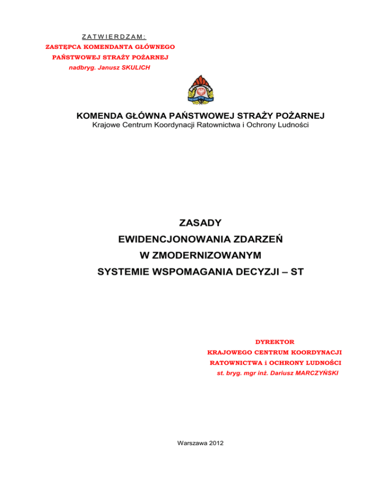 ZATW IERDZAM: ZASTĘPCA KOMENDANTA GŁÓWNEGO PAŃSTWOWEJ STRAŻY POŻARNEJ nadbryg. Janusz SKULICH KOMENDA GŁÓWNA PAŃSTWOWEJ STRAŻY POŻARNEJ Krajowe Centrum Koordynacji Ratownictwa i Ochrony Ludności ZASADY EWIDENCJONOWANIA ZDARZEŃ W ZMODERNIZOWANYM SYSTEMIE WSPOMAGANIA DECYZJI – ST DYREKTOR KRAJOWEGO CENTRUM KOORDYNACJI RATOWNICTWA i OCHRONY LUDNOŚCI st. bryg. mgr inż. Dariusz MARCZYŃSKI Warszawa 2012 Zasady ewidencjonowania zdarzeń w Systemie Wspomagania Decyzji – ST 3. Wersja z dnia 01 marca 2012. SPIS TREŚCI: WYKAZ ZMIAN W STOSUNKU DO WERSJI POPRZEDNIEJ .......................................................................4 DEFINICJE I SKRÓTY ......................................................................................................................................6 I. SZCZEGÓŁOWE ZASADY PROWADZENIA DOKUMENTACJI ZDARZEŃ .............................................9 II. SPOSÓB SPORZĄDZANIA KARTY ZDARZENIA ....................................................................................14 III. ZASADY SPORZĄDZANIA INFORMACJI ZE ZDARZENIA ..................................................................20 1. NUMER EWIDENCYJNY .............................................................................................................................................. 20 2. WSPÓŁRZĘDNE GEOGRAFICZNE ................................................................................................................................. 20 3. UGASZONO LUB ZLIKWIDOWANO ZAGROŻENIE BEZ UDZIAŁU JEDNOSTEK OCHRONY PRZECIWPOŻAROWEJ ............... 20 4. RODZAJ ZDARZENIA .................................................................................................................................................. 20 4.1. Pożar ................................................................................................................................................................ 21 4.2. Miejscowe zagrożenie ....................................................................................................................................... 22 4.3. Fałszywy alarm ................................................................................................................................................. 25 5. MIEJSCE ZDARZENIA ................................................................................................................................................. 25 6. OBIEKT...................................................................................................................................................................... 25 7. WŁAŚCICIEL LUB UŻYTKOWNIK ................................................................................................................................ 25 8. KOD OBIEKTU ............................................................................................................................................................ 25 9. KOD WŁAŚCICIELA .................................................................................................................................................... 30 10, 11. INFORMACJE O CZASIE ZDARZENIA I CZASIE DZIAŁAŃ RATOWNICZYCH ............................................................. 31 12. ZAUWAŻENIE ZDARZENIA PRZEZ ............................................................................................................................. 32 13. ZGŁOSZONO ZDARZENIE .......................................................................................................................................... 32 14. W DZIAŁANIACH RATOWNICZYCH UDZIAŁ BRAŁO ................................................................................................... 32 15. SPRZĘT UŻYTY W DZIAŁANIACH .............................................................................................................................. 33 16. RODZAJ PROWADZONYCH DZIAŁAŃ RATOWNICZYCH .............................................................................................. 34 17. DZIAŁANIA RATOWNICZE PROWADZONO Z UŻYCIEM SPRZĘTU ................................................................................ 34 18. MIEJSCE PROWADZENIA DZIAŁAŃ RATOWNICZYCH ................................................................................................. 34 19. UŻYTE ŚRODKI, ZAOPATRZENIE WODNE .................................................................................................................. 34 20. NR ONZ SUBSTANCJI .............................................................................................................................................. 35 21. WYBUCHY ............................................................................................................................................................... 35 22. MEDYCZNE DZIAŁANIA RATOWNICZE ..................................................................................................................... 35 23. WYPADKI Z LUDŹMI ................................................................................................................................................ 35 24. DANE PERSONALNE OSÓB POSZKODOWANYCH ........................................................................................................ 36 25. WIELKOŚĆ ZDARZENIA ............................................................................................................................................ 36 26. WIELKOŚĆ OBIEKTU ................................................................................................................................................ 36 27. STRATY ................................................................................................................................................................... 37 28. URATOWANE MIENIE .................................................................................................................................