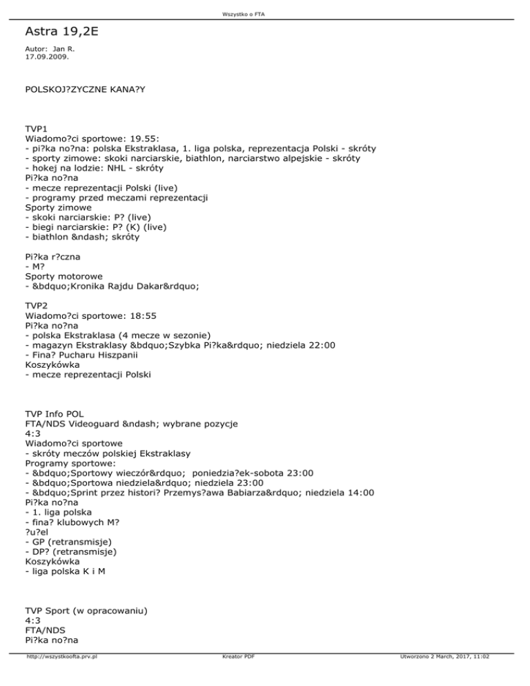 Wszystko o FTA Astra 19,2E Autor: Jan R. 17.09.2009. POLSKOJ?ZYCZNE KANA?Y TVP1 Wiadomo?ci sportowe: 19.55: - pi?ka no?na: polska Ekstraklasa, 1. liga polska, reprezentacja Polski - skróty - sporty zimowe: skoki narciarskie, biathlon, narciarstwo alpejskie - skróty - hokej na lodzie: NHL - skróty Pi?ka no?na - mecze reprezentacji Polski (live) - programy przed meczami reprezentacji Sporty zimowe - skoki narciarskie: P? (live) - biegi narciarskie: P? (K) (live) - biathlon – skróty Pi?ka r?czna - M? Sporty motorowe - „Kronika Rajdu Dakar” TVP2 Wiadomo?ci sportowe: 18:55 Pi?ka no?na - polska Ekstraklasa (4 mecze w sezonie) - magazyn Ekstraklasy „Szybka Pi?ka” niedziela 22:00 - Fina? Pucharu Hiszpanii Koszykówka - mecze reprezentacji Polski TVP Info POL FTA/NDS Videoguard – wybrane pozycje 4:3 Wiadomo?ci sportowe - skróty meczów polskiej Ekstraklasy Programy sportowe: - „Sportowy wieczór” poniedzia?ek-sobota 23:00 - „Sportowa niedziela” niedziela 23:00 - „Sprint przez histori? Przemys?awa Babiarza” niedziela 14:00 Pi?ka no?na - 1. liga polska - fina? klubowych M? ?u?el - GP (retransmisje) - DP? (retransmisje) Koszykówka - liga polska K i M TVP Sport (w opracowaniu) 4:3 FTA/NDS Pi?ka no?na http://wszystkoofta.prv.pl Kreator PDF Utworzono 2 March, 2017, 11:02 Wszystko o FTA - Unibet 1. liga - magazyn Unibet 1. ligi - Puchar Polski (wybrane mecze do 1/8 fina?u) - mecze reprezentacji Polski - M? RPA 2010 - Euro 2012 - liga RPA Koszykówka - Polska Liga Koszykówki - Polska Liga Koszykówki Kobiet - Mecze reprezetancji Polski kobiet i m??czyzn ?u?el -CentreNet Mobile Speedway Ekstraliga - magazyn CMSE "Wokó? Toru" ZAGRANICZNE KANA?Y SPORTOWE D:SF GER FTA 16:9 Pi?ka no?na - 2. Bundesliga - magazyn 2. Bundesligi - bramki z Bundesligi - FA Cup - magazyn Premier Liguae Sporty motorowe - Formu?a 1 - treningi live, wy?cig i kwalifikacje - retransmisja - Moto GP - magazyn rajdowy Hokej - 2. Bundesliga Poker Wrestling ameryka?ski - Smackdown Tenis sto?owy - liga niemiecka Koszykówka - M? k i m - skróty NBA Eurosport Deutschland GER Niemiecka wersja znanego kana?u sportowego, emiuje prawie to samo co polska. Dodatkowe programy to m.in. mecze niemieckich lig m?skich pi?ki r?cznej oraz koszykówki Canal+ Sport France FRA FTA/Viacess/Seca2 16:9 Pasmo niekodowane: codziennie od oko?o 18 do oko?o 20ZAGRANICZNE KANA?Y O INNEJ TEMATYCE ARD i ZDF GER FTA 16:9 Wiadomo?ci sportowe: 15:00 ZDF Pi?ka no?na - Skróty meczów Bundesligi - Bundesliga – 4 mecze w sezonie - Skróty meczów 3. ligi http://wszystkoofta.prv.pl Kreator PDF Utworzono 2 March, 2017, 11:02 Wszystko o FTA - M? i ME - Puchar Niemiec - Superpuchar Niemiec - mecze reprezentacji Niemiec - skróty el. M? Pi?ka r?czna - M? i ME - eliminacje ME i M? (reprezentacja Niemiec) - towarzyskie mecze reprezentacji Niemiec - skróty meczów Handball Bundesligi Sporty zimowe - skoki narciarskie - biathlon - biegi narciarskie - kombinacja norweska - saneczkarstwo - bobsleje - ?y?wiarstwo szybkie - IO i M? Boks zawodowy Kolarstwo Sporty motorowe - DTM (ARD) - Formula 3 Euroseries - skróty - Formu?a 2 - skróty Futbol ameryka?ski - Superbowl RTL Deutschland/Austria GER FTA 16:9 Sporty motorowe - Formu?a 1 - magazyn rajdowych M? Boks zawodowy - walki z udzia?em Kliczki Sat.1 GER FTA 4:3 Pi?ka no?na - Liga Mistrzów: niemieckie kluby Pro7 GER FTA 4:3 Pi?ka no?na - 3. liga niemiecka Boks (kobiety) Direct 8 FRA Pi?ka no?na - mecze towarzyskie BVN-TV NED FTA 16:9 Pi?ka no?na - magazyn ligi holenderskiej http://wszystkoofta.prv.pl Kreator PDF Utworzono 2 March, 2017, 11:02 Wszystko o FTA Anixe HD GER Pi?ka no?na - Bundesliga (retransmisja) CNBC Europe ENG Blok CNBC Sports - sobota i niedziela 14:00-18:00 http://wszystkoofta.prv.pl Kreator PDF Utworzono 2 March, 2017, 11:02