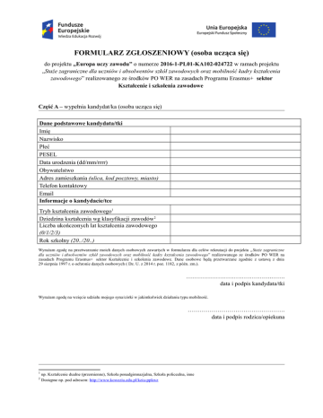 FORMULARZ ZGŁOSZENIOWY (osoba ucząca się) do projektu „Europa uczy zawodu” o numerze 2016-1-PL01-KA102-024722 w ramach projektu „Staże zagraniczne dla uczniów i absolwentów szkół zawodowych oraz mobilność kadry kształcenia zawodowego” realizowanego ze środków PO WER na zasadach Programu Erasmus+ sektor Kształcenie i szkolenia zawodowe Część A – wypełnia kandydat/ka (osoba ucząca się) Dane podstawowe kandydata/tki Imię Nazwisko Płeć PESEL Data urodzenia (dd/mm/rrrr) Obywatelstwo Adres zamieszkania (ulica, kod pocztowy, miasto) Telefon kontaktowy Email Informacje o kandydacie/tce Tryb kształcenia zawodowego1 Dziedzina kształcenia wg klasyfikacji zawodów2 Liczba ukończonych lat kształcenia zawodowego (0/1/2/3) Rok szkolny (20../20..) Wyrażam zgodę na przetwarzanie moich danych osobowych zawartych w formularzu dla celów rekrutacji do projektu „ Staże zagraniczne dla uczniów i absolwentów szkół zawodowych oraz mobilność kadry kształcenia zawodowego” realizowanego ze środków PO WER na zasadach Programu Erasmus+ sektor Kształcenie i szkolenia zawodowe. Dane osobowe będą przetwarzane zgodnie z ustawą z dnia 29 sierpnia 1997 r. o ochronie danych osobowych ( Dz. U. z 2014 r. poz. 1182, z późn. zm.). …………………………………….……. data i podpis kandydata/tki Wyrażam zgodę na wzięcie udziału mojego syna/córki w jakimkolwiek działaniu typu mobilność. …………………………………………. data i podpis rodzica/opiekuna 1 2 np. Kształcenie dualne (przemienne), Szkoła ponadgimnazjalna, Szkoła policealna, inne Dostępne np. pod adresem: http://www.koweziu.edu.pl/kziu-ppkwz Część B – wypełnia Komisja Rekrutacyjna a) kryterium formalne uczniów: - kandydat jest/nie jest* uczniem kl. 2 i 3 Zespołu Szkół Drzewnych i Leśnych w Żywcu (t. leśnik, t. ochrony środowiska, t. analityk, t. informatyk), załącznik: przekreślona kopia dowodu osobistego b) pozostałe kryteria dla uczniów to: - Średnia ocen z ostatniego roku nauki (25p.-śr pow. 4; 20p.-śr pow. 3; 15p.-śr pow. 2), załącznik: kopia świadectwa szkolnego i pisemna informacja od wychowawcy klasy; przyznana ilość punktów: ………………. - Frekwencja za ostatni rok nauki (20p. pow 90%; 15p. 90-75%; 10p. poniżej 75%), załącznik: pisemna informacja od wychowawcy klasy; przyznana ilość punktów: ………………. - Wynik testu z j. ang (25p. pow. 85%; 20p. pow. 70%; 15p. pow. 50%) przyznana ilość punktów: ………………. - Autoprezentacja kandydata – krótki film video w języku angielskim (15p.–10p –5p.), załącznik: plik audio przesłany na adres mailowy koordynatora w szkole; przyznana ilość punktów: ………………. - Formy aktywności (15p. pozaszkolne; 10p. szkolne), załącznik: pisemna informacja od wychowawcy klasy; przyznana ilość punktów: ……………… - Sytuacja społeczno-ekonomiczna ucznia – punkty dodatkowe (20p.) - w uzasadnionych przypadkach. Po ustaleniu listy rankingowej, przeanalizowana zostanie pozycja na liście osób z niską punkt. za oceny i/lub frekwencję. Jeżeli słabe wyniki i niska frekwencja będą wynikały z problemów środowiska rodzinnego, osobom tym zostaną przyznane dodatkowe pkt, co umożliwi włączenie do udziału w projekcie osób z trudnościami w nauce i złą sytuacją rodzinną, załącznik: opinia pedagoga szkolnego/wychowawcy klasy. przyznana ilość punktów: ……………… SUMA PUNKTÓW: ………………. * niepotrzebne skreślić ……………………………………………………..………………. data i podpis członków Komisji Rekrutacyjnej