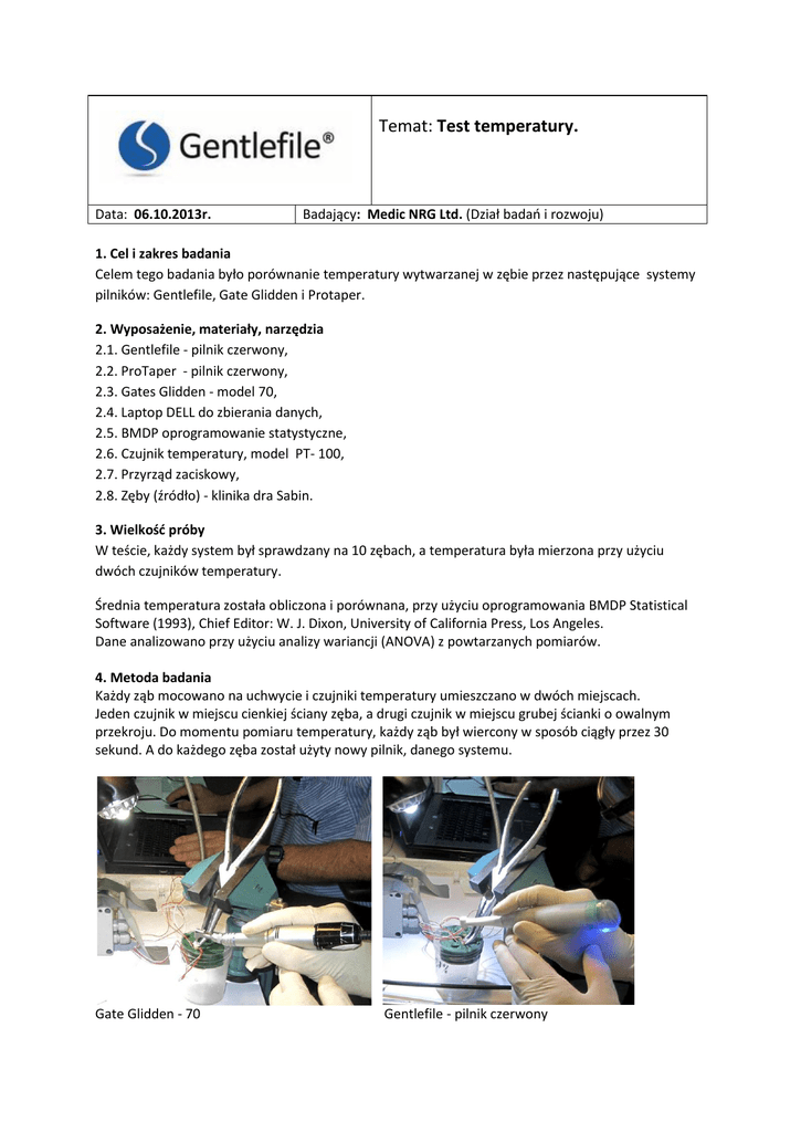Temat: Test temperatury. Data: 06.10.2013r. Badający: Medic NRG Ltd. (Dział badań i rozwoju) 1. Cel i zakres badania Celem tego badania było porównanie temperatury wytwarzanej w zębie przez następujące systemy pilników: Gentlefile, Gate Glidden i Protaper. 2. Wyposażenie, materiały, narzędzia 2.1. Gentlefile - pilnik czerwony, 2.2. ProTaper - pilnik czerwony, 2.3. Gates Glidden - model 70, 2.4. Laptop DELL do zbierania danych, 2.5. BMDP oprogramowanie statystyczne, 2.6. Czujnik temperatury, model PT- 100, 2.7. Przyrząd zaciskowy, 2.8. Zęby (źródło) - klinika dra Sabin. 3. Wielkość próby W teście, każdy system był sprawdzany na 10 zębach, a temperatura była mierzona przy użyciu dwóch czujników temperatury. Średnia temperatura została obliczona i porównana, przy użyciu oprogramowania BMDP Statistical Software (1993), Chief Editor: W. J. Dixon, University of California Press, Los Angeles. Dane analizowano przy użyciu analizy wariancji (ANOVA) z powtarzanych pomiarów. 4. Metoda badania Każdy ząb mocowano na uchwycie i czujniki temperatury umieszczano w dwóch miejscach. Jeden czujnik w miejscu cienkiej ściany zęba, a drugi czujnik w miejscu grubej ścianki o owalnym przekroju. Do momentu pomiaru temperatury, każdy ząb był wiercony w sposób ciągły przez 30 sekund. A do każdego zęba został użyty nowy pilnik, danego systemu. Gate Glidden - 70 Gentlefile - pilnik czerwony Protaper - pilnik czerwony 4. Wyniki badań Wszystkie trzy narzędzia w obu miejscach przyłożenia czujników temperatury wykazały bardzo wysoki wzrost temperatury w ciągu 30 sekund (p <0,001). Porównując lokalizację 1 i 2 sensorów temperatury dla każdego narzędzia oddzielnie, znaleziono znaczącą zależność między lokalizacją czujnika a wzrostem temperatury w ciągu 30 sekund. Tempo wzrostu temperatury było większe w miejscu 1 (cieńsza ściana kanału) niż w położeniu 2, (p = 0,002, p = 0,001 i p <0,001 odpowiednio dla narzędzia 1-Gentlefile, 2-Protaper i 3-Gates Glidden). Uwzględniając tylko 1. lokalizację czujników temperatury, po 30 sekundach pracy pilników: a) porównując Gentlefile z Protaper - nie stwierdzono istotnej interakcji (p = 0,678), b) porównując Gentlefile z Gates Glidden - odnotowano znaczące oddziaływanie (p <0,001), c) porównując ProTaper z Gates Glidden - stwierdzono istotną interakcję (p <0,001). Uwzględniając tylko 2. lokalizację czujników temperatury, po 30 sekundach pracy pilników: a) porównując Gentlefile z Protaper - nie stwierdzono istotnej interakcji (p = 0,238), b) porównując Gentlefile z Gates Glidden - odnotowano znaczące oddziaływanie (p <0,001), c) porównując ProTaper z Gates Glidden - odnotowano istotną interakcję (p <0,001). Temperatura wytworzona przez narzędzia Gentlefile nie była znacząco wyższa niż w przypadku dwóch pozostałych systemów.