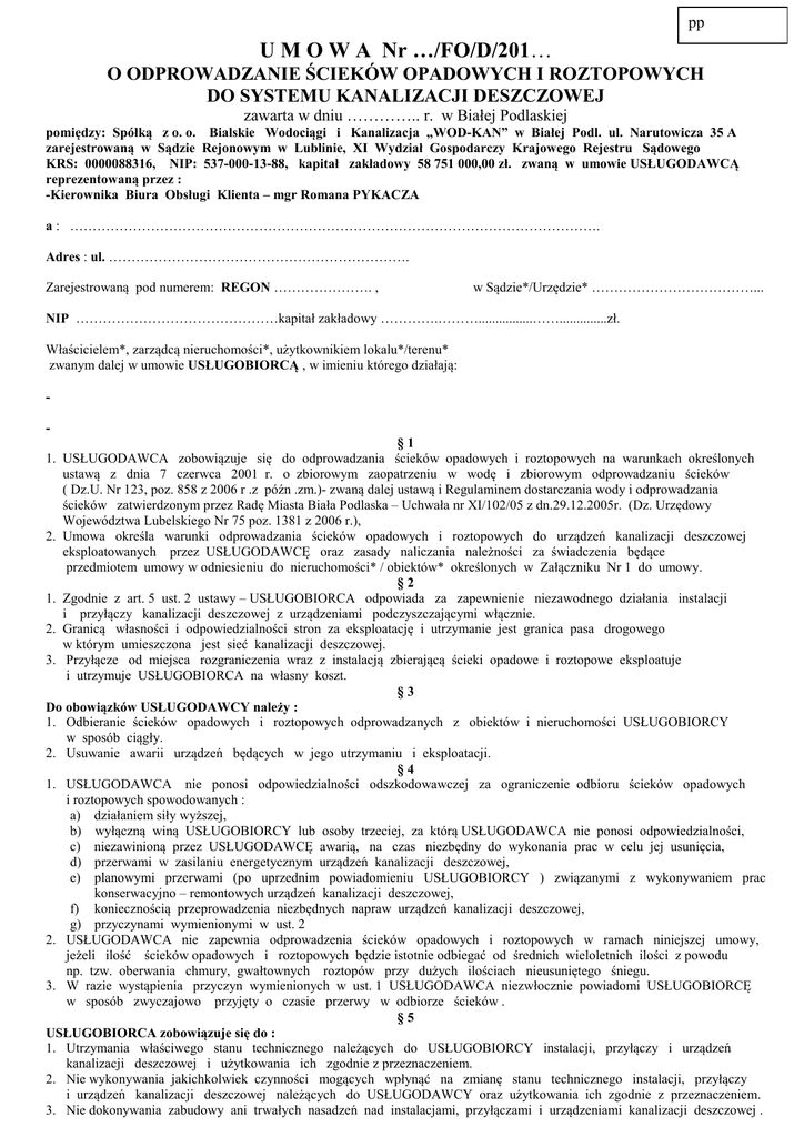 pp U M O W A Nr …/FO/D/201… O ODPROWADZANIE ŚCIEKÓW OPADOWYCH I ROZTOPOWYCH DO SYSTEMU KANALIZACJI DESZCZOWEJ zawarta w dniu ………….. r. w Białej Podlaskiej pomiędzy: Spółką z o. o. Bialskie Wodociągi i Kanalizacja „WOD-KAN” w Białej Podl. ul. Narutowicza 35 A zarejestrowaną w Sądzie Rejonowym w Lublinie, XI Wydział Gospodarczy Krajowego Rejestru Sądowego KRS: 0000088316, NIP: 537-000-13-88, kapitał zakładowy 58 751 000,00 zł. zwaną w umowie USŁUGODAWCĄ reprezentowaną przez : -Kierownika Biura Obsługi Klienta – mgr Romana PYKACZA a : ………………………………………………………………………………………………………. Adres : ul. …………………………………………………………. Zarejestrowaną pod numerem: REGON …………………. , w Sądzie*/Urzędzie* ………………………………... NIP ………………………………………kapitał zakładowy ………….………................……..............zł. Właścicielem*, zarządcą nieruchomości*, użytkownikiem lokalu*/terenu* zwanym dalej w umowie USŁUGOBIORCĄ , w imieniu którego działają: §1 1. USŁUGODAWCA zobowiązuje się do odprowadzania ścieków opadowych i roztopowych na warunkach określonych ustawą z dnia 7 czerwca 2001 r. o zbiorowym zaopatrzeniu w wodę i zbiorowym odprowadzaniu ścieków ( Dz.U. Nr 123, poz. 858 z 2006 r .z późn .zm.)- zwaną dalej ustawą i Regulaminem dostarczania wody i odprowadzania ścieków zatwierdzonym przez Radę Miasta Biała Podlaska – Uchwała nr XI/102/05 z dn.29.12.2005r. (Dz. Urzędowy Województwa Lubelskiego Nr 75 poz. 1381 z 2006 r.), 2. Umowa określa warunki odprowadzania ścieków opadowych i roztopowych do urządzeń kanalizacji deszczowej eksploatowanych przez USŁUGODAWCĘ oraz zasady naliczania należności za świadczenia będące przedmiotem umowy w odniesieniu do nieruchomości* / obiektów* określonych w Załączniku Nr 1 do umowy. §2 1. Zgodnie z art. 5 ust. 2 ustawy – USŁUGOBIORCA odpowiada za zapewnienie niezawodnego działania instalacji i przyłączy kanalizacji deszczowej z urządzeniami podczyszczającymi włącznie. 2. Granicą własności i odpowiedzialności stron za eksploatację i utrzymanie jest granica pasa drogowego w którym umieszczona jest sieć kanalizacji deszczowej. 3. Przyłącze od miejsca rozgraniczenia wraz z instalacją zbierającą ścieki opadowe i roztopowe eksploatuje i utrzymuje USŁUGOBIORCA na własny koszt. §3 Do obowiązków USŁUGODAWCY należy : 1. Odbieranie ścieków opadowych i roztopowych odprowadzanych z obiektów i nieruchomości USŁUGOBIORCY w sposób ciągły. 2. Usuwanie awarii urządzeń będących w jego utrzymaniu i eksploatacji. §4 1. USŁUGODAWCA nie ponosi odpowiedzialności odszkodowawczej za ograniczenie odbioru ścieków opadowych i roztopowych spowodowanych : a) działaniem siły wyższej, b) wyłączną winą USŁUGOBIORCY lub osoby trzeciej, za którą USŁUGODAWCA nie ponosi odpowiedzialności, c) niezawinioną przez USŁUGODAWCĘ awarią, na czas niezbędny do wykonania prac w celu jej usunięcia, d) przerwami w zasilaniu energetycznym urządzeń kanalizacji deszczowej, e) planowymi przerwami (po uprzednim powiadomieniu USŁUGOBIORCY ) związanymi z wykonywaniem prac konserwacyjno – remontowych urządzeń kanalizacji deszczowej, f) koniecznością przeprowadzenia niezbędnych napraw urządzeń kanalizacji deszczowej, g) przyczynami wymienionymi w ust. 2 2. USŁUGODAWCA nie zapewnia odprowadzenia ścieków opadowych i roztopowych w ramach niniejszej umowy, jeżeli ilość ścieków opadowych i roztopowych będzie istotnie odbiegać od średnich wieloletnich ilości z powodu np. tzw. oberwania chmury, gwałtownych roztopów przy dużych ilościach nieusuniętego śniegu. 3. W razie wystąpienia przyczyn wymienionych w ust. 1 USŁUGODAWCA niezwłocznie powiadomi USŁUGOBIORCĘ w sposób zwyczajowo przyjęty o czasie przerwy w odbiorze ścieków . §5 USŁUGOBIORCA zobowiązuje się do : 1. Utrzymania właściwego stanu technicznego należących do USŁUGOBIORCY instalacji, przyłączy i urządzeń kanalizacji deszczowej i użytkowania ich zgodnie z przeznaczeniem. 2. Nie wykonywania jakichkolwiek czynności mogących wpłynąć na zmianę stanu technicznego instalacji, przyłączy i urządzeń kanalizacji deszczowej należących do USŁUGODAWCY oraz użytkowania ich zgodnie z przeznaczeniem. 3. Nie dokonywania zabudowy ani trwałych nasadzeń nad instalacjami, przyłączami i urządzeniami kanalizacji deszczowej . 4. Niezwłocznego usunięcia awarii na przyłączu lub urządzeniu podczyszczającym będącym w jego posiadaniu. Jeżeli nie przystąpi do usunięcia awarii w ciągu 24 godzin od jej wystąpienia USŁUGODAWCA może wstrzymać świadczenie usług, bądź usunąć awarię we własnym zakresie, a kosztami obciążyć USŁUGOBIORCĘ. 5. Pokrycia kosztów napraw przyłącza kanalizacyjnego powstałych w wyniku nie zabezpieczenia go przed działaniem warunków atmosferycznych albo uszkodzeń mechanicznych i awarii. 6. Wprowadzania do kanalizacji ścieków o stanie i składzie nie zagrażającym prawidłowej eksploatacji instalacji, sieci i innych urządzeń kanalizacyjnych, a w szczególności nie wprowadzania do urządzeń kanalizacji deszczowej: a) ścieków bytowych, komunalnych, przemysłowych i innych nie będących ściekami opadowymi i roztopowymi. b) odpadów stałych, które mogą powodować zmniejszenie przepustowości przewodów kanalizacyjnych, a w szczególności żwiru, piasku, popiołu, szkła, wytłoczyn, drożdży, szczeciny, ścinków skór, tekstyliów włókien, nawet jeżeli znajdują się one w stanie rozdrobnionym, c) odpadów płynnych nie mieszających się z wodą, a w szczególności sztucznych żywic, lakierów, mas bitumicznych, smoły i jej emulsji, mieszanin cementowych, d) substancji palnych i wybuchowych, których punkt zapłonu znajduje się w temperat