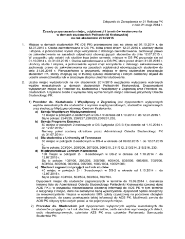Załącznik do Zarządzenia nr 21 Rektora PK z dnia 21 maja 2014 r. Zasady przyznawania miejsc, odpłatności i terminów kwaterowania w domach studenckich Politechniki Krakowskiej na rok akademicki 2014/2015 1. Miejsce w domach studenckich PK (DS PK) przyznawane jest na okres od 01.10.2014 r. do 12.07.2015 r. Osoba zakwaterowana w DS PK, która przed dniem 12.07.2015 r. ukończy studia I stopnia, a jednocześnie wyrazi chęć korzystania z dalszego zakwaterowania, zachowuje prawo do zakwaterowania na zasadach odpłatności obowiązujących studentów do dnia 12.07.2015 r. W przypadku gdy ostatni rok studiów trwa jeden semestr, miejsce w DS PK przyznaje się od 01.10.2014 r. do 31.03.2015 r. Osoba zakwaterowana w DS PK, która przed dniem 31.03.2015 r. ukończy studia I stopnia, a jednocześnie wyrazi chęć korzystania z dalszego zakwaterowania, zachowuje prawo do zakwaterowania na zasadach odpłatności obowiązujących studentów do dnia 31.03.2015 r. Pierwszeństwo w przyznaniu miejsca w domu studenckim przysługuje studentom PK, którzy znajdują się w trudnej sytuacji materialnej i którym codzienny dojazd do uczelni uniemożliwiałby lub w znacznym stopniu utrudniał studiowanie. 2. Liczba miejsc wydzielonych na rok akademicki 2014/2015 uwzględnia wyłączenia wybranych węzłów mieszkalnych w domach studenckich Politechniki Krakowskiej. Dysponentami wyłączonych miejsc są Prorektor ds. Kształcenia i Współpracy z Zagranicą oraz Prorektor ds. Studenckich. Uzyskane środki z wynajmu niżej wymienionych miejsc stanowią przychody Osiedla Studenckiego PK. 1) Prorektor ds. Kształcenia i Współpracy z Zagranicą jest dysponentem wyłączonych węzłów mieszkalnych dla studentów z wymian międzynarodowych, studentów zagranicznych oraz słuchaczy Międzynarodowego Centrum Kształcenia: a) Sekcja Współpracy Międzynarodowej 18 miejsc w pokojach 2-osobowych w DS-4 w okresie od 1.10.2014 r. do 12.07.2015 r. Są to pokoje: 224/225, 226/227,228/229,230/231,232, b) Sekcja Programu Erasmus 50 miejsc w pokojach 2-osobowych w DS Bydgoska (DS B-1)w okresie od 1.10.2014 r. do 12.07.2015 r. Numery pokoi zostaną określone przez Administracji Osiedla Studenckiego PK do 31.07.2014 r. c) Dla studentów z University of Tennessee 30 miejsc w pokojach 2-osobowych w DS-4 w okresie od 09.02.2015 r. do 12.07.2015 r., Są to pokoje: 203/204, 205/206, 207/208, 209/210, 211/212, 213/214, 215/216, 233; d) Międzynarodowe Centrum Kształcenia 130 miejsc w pokojach 2- i 3-osobowych w DS-2 w okresie od 1.10.2014 r. do 12.07.2015 r. Są to pokoje: 105/106, 205/206, 305/306, 405/406, 505/506, 605/606, 705/706, 803/804, 805/806, 903/904, 905/906, 1003/1004, 1005/1006; e) Studenci zagraniczni przyjęci na I rok studiów 40 miejsc w pokojach 2- i 3-osobowych w DS-2 w okresie od 1.10.2014 r. do 12.07.2015 r. Są to pokoje: 403/404, 503/504, 603/604, 703/704. Dysponent miejsc dla studentów zagranicznych w terminie do 15.09.2014 r. dostarcza imienne listy do Administracji Osiedla Studenckiego Politechniki Krakowskiej (zwanej dalej AOS PK).; w przypadku nieprzekazania pisemnej informacji do AOS PK w tym terminie o rezygnacji z miejsc, które nie zostały/nie będą wykorzystane, dysponent będzie obciążony za niewykorzystanie miejsca w wysokości 50% opłaty czynszowej na podstawie obciążeń wewnętrznych, do czasu przekazania takiej informacji do AOS PK. Możliwość zwrotu do AOS PK dotyczy tylko całych pokoi, a nie pojedynczych miejsc. 2) Prorektor ds. Studenckich jest dysponentem wyłączonych węzłów mieszkalnych dla studentów przyjętych na I rok studiów, doktorantów, osób samotnie wychowujących dzieci, osób niepełnosprawnych, członków AZS PK oraz członków Parlamentu Samorządu Studentów PK: a) dla doktorantów 16 miejsc w pokojach 2-osobowych w DS-4 w okresie od 1.10.2014 r. do 12.07.2015 r. Są to pokoje: 415/416, 426/427, 428/429, 430/431, b) dla osób niepełnosprawnych 18 miejsc w okresie od 1.10.2014 r. do 12.07.2015 r.: – 6 miejsc w pokojach 1- i 2-osobowych w DS-1, Są to pokoje: 114A (1-osobowy), 114B (2-osobowy), 115A (1-osobowy), 115B (2-osobowy), – 4 miejsca w pokojach 1-osobowych w DS-3, Są to pokoje: 112A, 112B, 113A, 113B, – 8 miejsc w pokojach 2-osobowych w DS-4, Są to pokoje: 103/104, 105/106, 503, 504, c) dla osób samotnie wychowujących dzieci 4 miejsca w pokojach 1-osobowych w DS-4 w okresie od 1.10.2014 r. do 12.07.2015 r. Są to pokoje: 622/623, 632/633, d) dla osób przyjętych na I rok studiów 360 miejsc w okresie od 1.10.2014 r. do 12.07.2015 r.: – 130 miejsc w DS-1, – 20 miejsc w DS-1 (dla studentów przyjętych na I rok studiów II stopnia, przydział miejsc poza systemem e-HMS, tj. bezpośrednio w AOS, na podstawie wniosku – wzór nr 2), – 160 miejsc w DS-2, – 20 miejsc DS-4 (dla studentów przyjętych na I rok studiów II stopnia, przydział miejsc poza systemem e-HMS, tj. bezpośrednio w AOS, na podstawie wniosku – wzór nr 2), – 30 miejsc w DS B-1, e) Akademicki Związek Sportowy – Klub Uczelniany PK 20 miejsc w pokojach 2-osobowych w DS-4 w okresie od 1.10.2014 r. do 12.07.2015 r. Są to pokoje: 403/404, 405/406, 407/408, 422/423, 432/433, f) Parlament Samorządu Studentów 16 miejsc w pokojach 2-osobowych w DS.-4 w okresie od 1.10.2014 r. do 12.07.2015 r. Są to pokoje: 409/410, 411/412, 413/414, 424/425. Zasady przyznawania miejsc dla tej grupy osób zostały określone w dalszej części dokumentu, 3) Kierownik Osiedla Studenckiego jest dysponentem pozostałych miejsc w domach studenckich. 3. Miejsca w domach studenckich będą przyznawane według następujących zasad: 1) Wszyscy studenci PK ubiegający się o miejsca w DS PK zobowiązani są do wysłania e-wniosku o przyznanie miejsca w DS PK drogą elektroniczną w systemie Wirtualny Dziekanat, w okresie od 22.05.2014 r. (godz. 10.00) do 25.05.2014 r. (do godz. 24:00). Osoby zalegające z opłatami za zakwaterowanie mogą ubiegać się o miejsce w DS PK na rok akademic