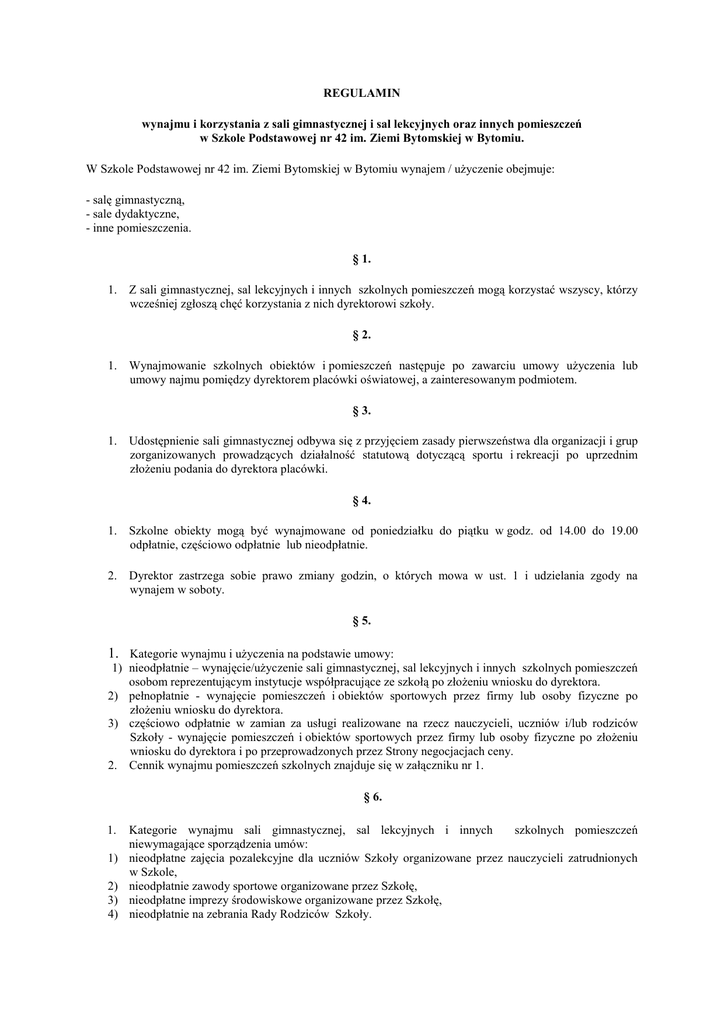 REGULAMIN wynajmu i korzystania z sali gimnastycznej i sal lekcyjnych oraz innych pomieszczeń w Szkole Podstawowej nr 42 im. Ziemi Bytomskiej w Bytomiu. W Szkole Podstawowej nr 42 im. Ziemi Bytomskiej w Bytomiu wynajem / użyczenie obejmuje: - salę gimnastyczną, - sale dydaktyczne, - inne pomieszczenia. § 1. 1. Z sali gimnastycznej, sal lekcyjnych i innych szkolnych pomieszczeń mogą korzystać wszyscy, którzy wcześniej zgłoszą chęć korzystania z nich dyrektorowi szkoły. § 2. 1. Wynajmowanie szkolnych obiektów i pomieszczeń następuje po zawarciu umowy użyczenia lub umowy najmu pomiędzy dyrektorem placówki oświatowej, a zainteresowanym podmiotem. § 3. 1. Udostępnienie sali gimnastycznej odbywa się z przyjęciem zasady pierwszeństwa dla organizacji i grup zorganizowanych prowadzących działalność statutową dotyczącą sportu i rekreacji po uprzednim złożeniu podania do dyrektora placówki. § 4. 1. Szkolne obiekty mogą być wynajmowane od poniedziałku do piątku w godz. od 14.00 do 19.00 odpłatnie, częściowo odpłatnie lub nieodpłatnie. 2. Dyrektor zastrzega sobie prawo zmiany godzin, o których mowa w ust. 1 i udzielania zgody na wynajem w soboty. § 5. 1. Kategorie wynajmu i użyczenia na podstawie umowy: 1) nieodpłatnie – wynajęcie/użyczenie sali gimnastycznej, sal lekcyjnych i innych szkolnych pomieszczeń osobom reprezentującym instytucje współpracujące ze szkołą po złożeniu wniosku do dyrektora. 2) pełnopłatnie - wynajęcie pomieszczeń i obiektów sportowych przez firmy lub osoby fizyczne po złożeniu wniosku do dyrektora. 3) częściowo odpłatnie w zamian za usługi realizowane na rzecz nauczycieli, uczniów i/lub rodziców Szkoły - wynajęcie pomieszczeń i obiektów sportowych przez firmy lub osoby fizyczne po złożeniu wniosku do dyrektora i po przeprowadzonych przez Strony negocjacjach ceny. 2. Cennik wynajmu pomieszczeń szkolnych znajduje się w załączniku nr 1. § 6. 1. 1) 2) 3) 4) Kategorie wynajmu sali gimnastycznej, sal lekcyjnych i innych szkolnych pomieszczeń niewymagające sporządzenia umów: nieodpłatne zajęcia pozalekcyjne dla uczniów Szkoły organizowane przez nauczycieli zatrudnionych w Szkole, nieodpłatnie zawody sportowe organizowane przez Szkołę, nieodpłatne imprezy środowiskowe organizowane przez Szkołę, nieodpłatnie na zebrania Rady Rodziców Szkoły. § 7. 1. Za bezpieczeństwo uczestników odpowiedzialność prawną ponosi wyłącznie osoba organizująca zajęcia, w tym zajęcia rekreacyjno – sportowe (nauczyciel, opiekun, kierownik grupy). 2. Obowiązkiem osoby organizującej zajęcia jest każdorazowe sprawdzanie przed zajęciami pomieszczenia pod względem bezpieczeństwa. Wszelkie uwagi powinny być natychmiast zgłoszone dyrektorowi szkoły lub osobie wskazanej przez dyrektora. § 8. 1. 2. Regulamin użytkowania sali gimnastycznej jest integralną częścią niniejszego Regulaminu. Osoby najmujące salę gimnastyczną są zobowiązane do zapoznania się i przestrzegania obydwu Regulaminów. § 9. 1. Za zniszczenia wynikłe podczas zajęć odpowiada materialnie osoba odpowiedzialna za grupę, z którą podpisano umowę najmu/użyczenia. Osoba ta przebywa cały czas z uczestnikami zajęć prowadząc je zgodnie z umową. § 10. 1. Obowiązkiem uczestników jest odpowiednie zabezpieczenie pozostawionych rzeczy osobistych. Szkoła nie ponosi odpowiedzialność za straty wynikłe w tym zakresie. § 11. 1. Uczestnikom nie wolno korzystać z pomieszczeń, obiektów sportowych nie wymienionych w umowie pod rygorem jej rozwiązania. § 12. 1. W obiektach szkolnych nie wolno spożywać alkoholu, palić papierosów. 2. Osoby będące w stanie wskazującym na spożycie alkoholu nie będą wpuszczone do budynku Szkoły. § 13. 1. Dyrektor Szkoły ma prawo do odwołania zajęć w dniach, w których planowane są uroczystości lub imprezy organizowane przez Szkołę. § 14. 1. W zakresie spraw nie unormowanych niniejszym Regulaminem decyzję podejmuje dyrektor Szkoły Podstawowej nr 42 w Bytomiu. Bytom, 30 września 2015r. załącznik nr 1 CENNIK WYNAJMU POMIESZCZEŃ SZKOLNYCH w Szkole Podstawowej nr 42 im. Ziemi Bytomskiej w Bytomiu 1. Sala gimnastyczna: 40,00zł/h 1. Sala gimnastyczna z używalnością zaplecza sanitarnego: 50,00zł/h 2. Inne pomieszczenia udostępnione do wynajmu: - sale lekcyjne – 30,00zł/h - stołówka – 35,00zł/h - gabinet profilaktyki zdrowotnej i pomocy przedlekarskiej – 0,40zł/m2 powierzchni załącznik nr 2 UMOWA NR … - wzór zawarta w dniu ………………………………… pomiędzy: Szkołą Podstawową nr 42 im. Ziemi Bytomskiej w Bytomiu reprezentowaną przez dyrektora szkoły Panią/Pana ………………… – zwaną dalej Wynajmującym, a ……………………………………………………………. reprezentowaną/reprezentowanym przez Panią/Pana …………………………………………………………… zwaną/zwanym dalej Najemcą, dotycząca korzystania z pomieszczeń szkolnych/sali gimnastycznej w Szkole Podstawowej nr 42 im. Ziemi Bytomskiej w Bytomiu §1 1. Wynajmujący zobowiązuje się do udostępnienia Najemcy …………………………… (nazwa pomieszczenia) w celu realizacji zajęć ……………………………………………………………………….. (forma/nazwa zajęć) §2 1. Udostępnienie przedmiotu umowy odbywać się będzie w dniu/dniach ……………… w godzinach od ……… do ………………… §3 1. Z tytułu niniejszej umowy Najemca nie ponosi żadnych opłat/Najemca zobowiązuje się zapłacić Wynajmującemu kwotę ……(słownie: ) w terminie do…………… w sekretariacie szkoły (na konto ……….) §4 1. Najemca oświadcza, że zapoznał się z Regulaminem wynajmu i korzystania z sali gimnastycznej i sal lekcyjnych oraz innych pomieszczeń w Szkole Podstawowej nr 42 im. Ziemi Bytomskiej w Bytomiu i zobowiązuje się do jego przestrzegania. §5 1. Najemca zobow