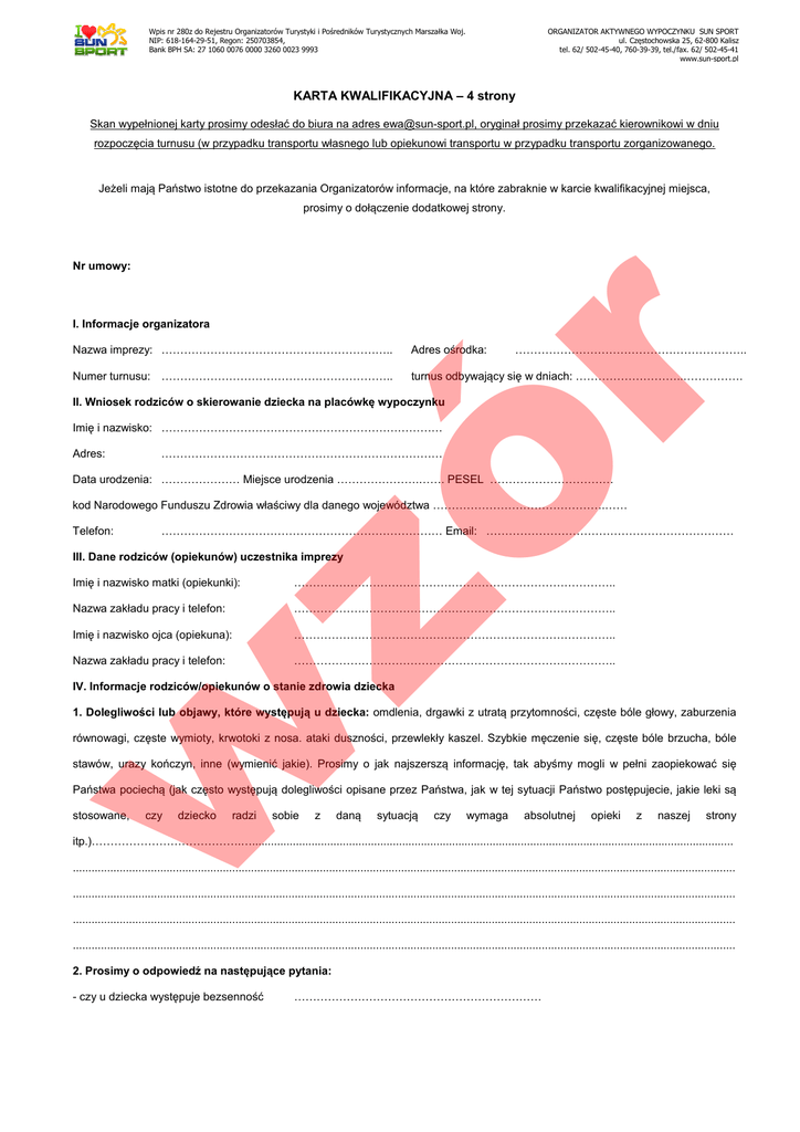 Wpis nr 280z do Rejestru Organizatorów Turystyki i Pośredników Turystycznych Marszałka Woj. Wlkp. NIP: 618-164-29-51, Regon: 250703854, Bank BPH SA: 27 1060 0076 0000 3260 0023 9993 ORGANIZATOR AKTYWNEGO WYPOCZYNKU SUN SPORT ul. Częstochowska 25, 62-800 Kalisz tel. 62/ 502-45-40, 760-39-39, tel./fax. 62/ 502-45-41 www.sun-sport.pl KARTA KWALIFIKACYJNA – 4 strony Skan wypełnionej karty prosimy odesłać do biura na adres [email protected], oryginał prosimy przekazać kierownikowi w dniu rozpoczęcia turnusu (w przypadku transportu własnego lub opiekunowi transportu w przypadku transportu zorganizowanego. Jeżeli mają Państwo istotne do przekazania Organizatorów informacje, na które zabraknie w karcie kwalifikacyjnej miejsca, prosimy o dołączenie dodatkowej strony. Nr umowy: I. Informacje organizatora Adres ośrodka: …………………………………………………….. r Nazwa imprezy: …………………………………………………….. Numer turnusu: …………………………………………………….. turnus odbywający się w dniach: ………………………..……………. II. Wniosek rodziców o skierowanie dziecka na placówkę wypoczynku Imię i nazwisko: ………………………………………………………………… ………………………………………………………………… zó Adres: Data urodzenia: ………………… Miejsce urodzenia ………………….……. PESEL …………………………… kod Narodowego Funduszu Zdrowia właściwy dla danego województwa ……………………………………….…… Telefon: ………………………………………………………………… Email: ………………………………………………………… III. Dane rodziców (opiekunów) uczestnika imprezy Imię i nazwisko matki (opiekunki): ………………………………………………………………………….. Nazwa zakładu pracy i telefon: ………………………………………………………………………….. Imię i nazwisko ojca (opiekuna): ………………………………………………………………………….. Nazwa zakładu pracy i telefon: ………………………………………………………………………….. IV. Informacje rodziców/opiekunów o stanie zdrowia dziecka w 1. Dolegliwości lub objawy, które występują u dziecka: omdlenia, drgawki z utratą przytomności, częste bóle głowy, zaburzenia równowagi, częste wymioty, krwotoki z nosa. ataki duszności, przewlekły kaszel. Szybkie męczenie się, częste bóle brzucha, bóle stawów, urazy kończyn, inne (wymienić jakie). Prosimy o jak najszerszą informację, tak abyśmy mogli w pełni zaopiekować się Państwa pociechą (jak często występują dolegliwości opisane przez Państwa, jak w tej sytuacji Państwo postępujecie, jakie leki są stosowane, czy dziecko radzi sobie z daną sytuacją czy wymaga absolutnej opieki z naszej strony itp.)………………………………….….......................................................................................................................................................... .................................................................................................................................................................................................................... .................................................................................................................................................................................................................... .................................................................................................................................................................................................................... .................................................................................................................................................................................................................... 2. Prosimy o odpowiedź na następujące pytania: - czy u dziecka występuje bezsenność ………………………………………………………… Wpis nr 280z do Rejestru Organizatorów Turystyki i Pośredników Turystycznych Marszałka Woj. Wlkp. NIP: 618-164-29-51, Regon: 250703854, Bank BPH SA: 27 1060 0076 0000 3260 0023 9993 ORGANIZATOR AKTYWNEGO WYPOCZYNKU SUN SPORT ul. Częstochowska 25, 62-800 Kalisz tel. 62/ 502-45-40, 760-39-39, tel./fax. 62/ 502-45-41 www.sun-sport.pl - czy dziecko śpi samodzielnie (bez rodzica) …………………………………………………………………………… - czy u dziecka występują lęki nocne (lub inne lęki) ..………………………………………………………………….. - czy dziecko moczy się w nocy ………………………………………………………………………………………… - czy dziecko samodzielnie używa sztućców, je, myje się, ubiera, załatwia potrzeby fizjologiczne …………………………………………... ...................................................................................................................................................................................................................... - czy u dziecka występuje lub jest podejrzenie występowania Zespołu nadpobudliwości psychoruchowej z deficytem uwagi (ADHD), jeżeli tak proszę podać szczegóły nt. możliwych zachowań dziecka i Państwa sposobów na odpowiednie reakcje : ...................................................................................................................................................... ………………………………………… ...................................................................................................................................................... ………………………………