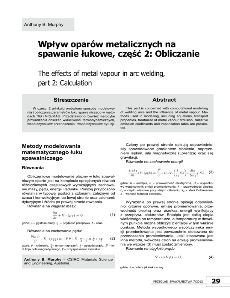 Anthony B. Murphy Wpływ oparów metalicznych na spawanie łukowe, część 2: Obliczanie the effects of metal vapour in arc welding, part 2: calculation Streszczenie abstract W części 2 artykułu omówiono sposoby modelowania i obliczania parametrów łuku spawalniczego w metodach TIG i MIG/MAG. Przedstawiono również metodykę prowadzenia obliczeń właściwości termodynamicznych, współczynników przenoszenia i współczynników dyfuzji. This part is concerned with computational modelling of welding arcs and the influence of metal vapour. Methods used in modelling, including equations, transport properties, treatment of metal vapour diffusion, radiative emission coefficients and vaporization rates are presented. Człony po prawej stronie opisują odpowiednio: siły spowodowane gradientem ciśnienia, naprężeniem lepkim, siłę magnetyczną (Lorentza) oraz siłę grawitacji. Równanie na zachowanie energii: Metody modelowania matematycznego łuku spawalniczego Równania (3) Obliczeniowe modelowanie plazmy w łuku spawalniczym oparte jest na komplecie sprzężonych równań różniczkowych cząstkowych wyrażających zachowanie masy, pędu, energii i ładunku. Poniżej przytoczono równania w typowej postaci z członami: zależnym od czasu i konwekcyjnym po lewej stronie oraz członami: dyfuzyjnym i źródła po prawej stronie równania. Równanie na ciągłość masy: (1) gdzie: p – gęstość masy, – prędkość przepływu, t – czas. Równanie na zachowanie pędu: (2) gdzie: p – ciśnienie, – tensor naprężeń, – gęstość prądu, dukcja pola magnetycznego, – przyspieszenie ziemskie. – in- gdzie: h – entalpia, σ – przewodność elektryczna, U – wypadkowy współczynnik emisji promieniowania, k – przewodność cieplna, cP – ciepło właściwe przy stałym ciśnieniu, kB – stała Boltzmanna, e – wartość ładunku elektronu. Wyrażenia po prawej stronie opisują odpowiednio: grzanie oporowe, emisję promieniowania, przewodność cieplną oraz przekaz energii wynikający z przepływu elektronów. Entalpia jest całką ciepła właściwego po temperaturze, a temperaturę w dowolnym punkcie można obliczyć z entalpii w tym właśnie punkcie. Metoda wypadkowego współczynnika emisji promieniowania jest powszechnie stosowana do przenoszenia promieniowania. Jeśli stosowana jest inna metoda, wówczas człon na emisję promieniowania we wzorze (3) musi zostać zmieniony. Równanie na ciągłość prądu: (4) anthony B. Murphy – CSIRO Materials Science and Engineering, Australia. gdzie: ϕ – potencjał elektryczny. Przegląd sPawalnictwa 7/2012 29 Gęstość natężenia prądu jest dana wzorem Indukcja pola magnetycznego , która pojawia się we wzorze (2), także musi być obliczona, np. ze wzoru na potencjał pola magnetycznego : (5) gdzie: . W spawaniu łukowym z gazem osłonowym i oparami metalicznymi potrzebne jest również równanie wyrażające zachowanie masy oparów metalicznych. Zazwyczaj zakłada się, że plazma zawiera dwa osobne składniki: opary metaliczne i gaz osłonowy. Dlatego substancje pochodzące od oparów metalu (np. Fe, Fe+, Fe2+, Fe3+ itd. dla oparów żelaza) są traktowane jako jeden gaz, a te od gazu osłonowego (np. Ar, Ar+, Ar2+, Ar3+ itd. dla argonu) jako inny gaz. Elektrony są podzielone pomiędzy dwa gazy, więc każdy z nich jest elektrycznie neutralny. Równanie dla zachowania masy oparów metalicznych wygląda wówczas następująco: (6) gdzie: – suma ułamków wagowych substancji oparów metalu, – średni przepływ masy w stosunku do średniej prędkości masy substancji oparów metalu, SM – człon źródłowy oparów metalicznych (masa na jednostkę objętości i czasu). Pierwszy człon po prawej stronie opisuje dyfuzję oparów metalicznych, a drugi powstanie oparów metalicznych w wyniku odparowania elektrod, z uwzględnieniem możliwych strat, np. skraplania oparów metalu. Dodatkowe wyrażenie: (7) dodaje się do prawej strony wzoru na zachowanie energii (3), by uwzględnić zmianę entalpii wynikającą z mieszania oparów metalu i gazu osłonowego; i to entalpie odpowiednio oparów metalu i gazu osłonowego, zdefiniowane jako sumy entalpii substancji tworzących poszczególne gazy. Należy zwrócić uwagę, że w pracach [59, 84] został uwzględniony dodatkowy człon w , przy czym człon ten został już zawarty w przewodności cieplnej [85]. Człon źródła oparów metalicznych we wzorze (6) powinien być także dodany do prawej strony równania na zachowanie masy (1). Należy do niego również dodać człon odpowiedzialny za chłodzenie wyparne (3). Równania te rozwiązuje się zazwyczaj, stosując metodę objętości skończonych [86], pomimo że coraz częściej do tworzenia modeli plazm termicznych stosowane są metody elementów skończonych. Właściwości plazmy termicznej silnie zależą od właściwości termofizycznych gazu plazmy, które występują we wzorach (1) i (7). Właściwości te mogą 30 Przegląd sPawalnictwa 7/2012 być podzielone na termodynamiczne (gęstość, ciepło właściwe, entalpia), współczynniki przenoszenia (lepkość, przewodność elektryczna, przewodność cieplna, współczynniki dyfuzji) oraz współczynniki emisji promieniowania. Obecność oparów metalicznych ma wpływ na wszystkie z wymienionych właściwości, jednak najbardziej zmienia przewodność elektryczną i współczynniki emisji promieniowania. Znajomość współczynników dyfuzji jest wymagana do obliczenia strumienia masy oparów metalicznych i wraz z przepływem konwekcyjnym określają one rozkład oparów metalicznych w łuku. Właściwości termodynamiczne, transportu i promieniowania oraz współczynniki dyfuzji będą omówione w dalszej części artykułu. Konieczne jest również dobranie odpowiedniej metody wyznaczenia szybkości parowania metalu z elektrod (człon źródłowy we wzorze (6)). Obliczenie właściwości termodynamicznych i współczynników przenoszenia Punktem 