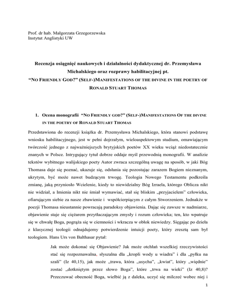 Prof. dr hab. Małgorzata Grzegorzewska Instytut Anglistyki UW Recenzja osiągnięć naukowych i działalności dydaktycznej dr. Przemysława Michalskiego oraz rozprawy habilitacyjnej pt. “NO FRIENDLY GOD?” (SELF-)MANIFESTATIONS OF THE DIVINE IN THE POETRY OF RONALD STUART THOMAS 1. Ocena monografii “NO FRIENDLY GOD?” (SELF-)MANIFESTATIONS OF THE DIVINE IN THE POETRY OF RONALD STUART THOMAS Przedstawiona do recenzji książka dr. Przemysława Michalskiego, która stanowi podstawę wniosku habilitacyjnego, jest w pełni dojrzałym, wieloaspektowym studium, omawiającym twórczość jednego z najważniejszych brytyjskich poetów XX wieku wciąż niedostatecznie znanych w Polsce. Intrygujący tytuł dobrze oddaje myśl przewodnią monografii. W analizie tekstów wybitnego walijskiego poety Autor zwraca szczególną uwagę na sposób, w jaki Bóg Thomasa daje się poznać, ukazuje się, odsłania się pozostając zarazem Bogiem nieznanym, ukrytym, być może nawet budzącym trwogę. Teologia Nowego Testamentu podkreśla zmianę, jaką przyniosło Wcielenie, kiedy to niewidzialny Bóg Izraela, którego Oblicza nikt nie widział, a Imienia nikt nie śmiał wymawiać, stał się bliskim „przyjacielem” człowieka, ofiarującym siebie za nasze zbawienie i współcierpiącym z całym Stworzeniem. Jednakże w poezji Thomasa nieustannie powracają paradoksy objawienia. Dając się zawsze w nadmiarze, objawienie staje się ciężarem przytłaczającym zmysły i rozum człowieka; ten, kto wpatruje się w chwałę Boga, pogrąża się w ciemności i wkracza w obłok niewiedzy. Sięgając po dzieła z klasycznej teologii odnajdujemy potwierdzenie intuicji poety, który zresztą sam był teologiem. Hans Urs von Balthasar pytał: Jak może dokonać się Objawienie? Jak może otchłań wszelkiej rzeczywistości stać się rozpoznawalna, słyszalna dla „kropli wody u wiadra” i dla „pyłku na szali” (Iz 40,15), jak może „trawa, która „usycha”, „kwiat”, który „więdnie” zostać „dotkniętym przez słowo Boga”, które „trwa na wieki” (Iz 40,8)? Przeczuwać obecność Boga, wielbić ją z daleka, uczyć się milczeć wobec niej i 1 pozwolić jej panować: to najwyżej może być dozwolone stworzeniom; takie przeczuwanie wydaje się dla nich wystarczającym objawieniem: na brzegu swojej skończoności odkrywają Zupełnie Inne, a otoczeni morzem tajemnicy uczą się takich rzeczy, jak szacunek wobec niewytłumaczalnego sensu, który przenika nawet to, co w ich życiu na pozór bezsensowne. (Chwała. Estetyka teologiczna. 3/2 Teologia. cz. 1. Stary Testament, s. 29) Jak przypomina Louis Dupre, Objawienie w sensie teologicznym „początkowo jest zawsze czynem, lub w pewnych wypadkach wydarzeniem historycznym, w którym to, co transcendentne samo się odsłania … słowo nigdy nie zastępuje czynu”. Zatem, kiedy chrześcijanie nazwali Boga Słowem, „wyrazili najgłębsze znaczenie każdego objawienia” (Inny wymiar, s. 239). Wiara nie usuwa jednak dialektycznego charakteru epifanii (w której zawiera się znajomość i nieznajomość Innego; widzenie i niewidzenie Boga); również słowo objawiające nigdy „nie przekształca się w … rozumową refleksję nad rzeczywistością” (tamże). Przypomnienie tych faktów z zakresu teologii i filozofii religii znakomicie ułatwia obcowanie z poezją, której przewodnim motywem jest tęsknota człowieka za Bogiem i ciemność poznania Boga. Na przykład, kiedy Balthasar dochodzi w swoim rozważaniu do „niewytłumaczalnego sensu, który przenika nawet to, co w życiu [ludzi] na pozór bezsensowne”, czytelnik książki dr. Michalskiego natychmiast przywoła te fragmenty recenzowanej monografii, w których mowa o cierpieniu wpisanym w żywą tkankę świata. Warto zestawić refleksję szwajcarskiego teologa z omówieniem tych wierszy Thomasa, w których wiara w Opatrzność i wynikająca z niej wizja Stwórcy troszczącego się o każde istnienie zostaje zastąpiona beznamiętnym opisem walki o byt i ślepego darwinowskiego determinizmu. Dr Michalski twierdzi, że podmiot liryczny tej poezji wydaje się mieć moralną przewagę nad obojętnym wobec wszechobecnego cierpienia bóstwem (“the speaker of the poem comes across as morally superior to the inconsiderate deity, for the world he would have fashioned would not necessitate so much suffering and waste”, s. 97). Ale czy takie odczytanie poezji Thomasa nie upraszcza jej paradoksalnego przesłania opartego na paradoksach wiary? Do listy Balthasara Thomas wydaje się dopisywać jeszcze jedną „niemożność” objawienia: dając się poznać, Bóg jawi się jako coraz bardziej niepoznawalny, daleki, nieobecny. Najpewniejszym i najbardziej intymnym znakiem jego bliskości jest wewnętrzne doświadczenie całkowitej pustki i nieprzeniknionego milczenia. Nie jest to myśl całkiem nowa. Wielu mówiło przed Thomasem, że jeśli bóstwo daje się pojąć, nie może być 2 prawdziwym Bogiem, a jedynie naszym o nim wyobrażeniem, idolem wytworzonym przez nasz umysł. Studium dr. Michalskiego poświęcone jest zatem poezji, w której tajemnica objawiania się Boga nie tylko napełnia podmiot pełnym szacunku podziwem i bojaźnią, lecz jest także, a może przede wszystkim, źródłem dojmującego poczucia osamotnienia i tęsknoty. W wierszach Thomasa znajdziemy wiele przykładów graniczących z bluźnierstwem sporów z nieobecnym i niemym Bogiem, który zarazem objawia się nie inaczej, jak w nieprzejednanym milczeniu i przerażającej pustce. Czy jednak dialektyczny model Balthasara nie ujmuje tego właśnie paradoksu? Oczywistym przewodnikiem poety na ścieżce „wiary tragicznej” jest Soeren Kierkegaard, co musiało przyciągnąć uwagę literaturoznawcy od dawna inspirującego się myślą duńskiego filozofa. Wybór tematu książki świadczy więc o autentycznej pasji badawczej, która każe zgłębiać wybrane problemy, a nie chwytać się przypadkowo napot