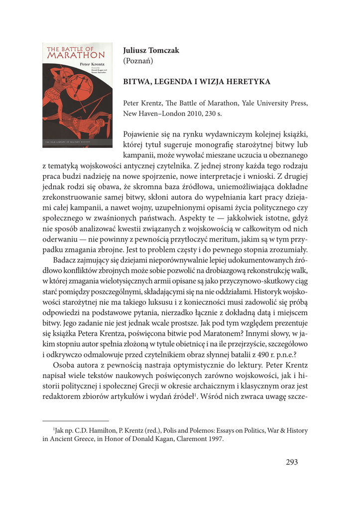 JULIUSZ TOMCZAK, BITWA, LEGENDA I WIZJA HERETYKA Juliusz Tomczak (Poznań) BITWA, LEGENDA I WIZJA HERETYKA Peter Krentz, The Battle of Marathon, Yale University Press, New Haven–London 2010, 230 s. Pojawienie się na rynku wydawniczym kolejnej książki, której tytuł sugeruje monografię starożytnej bitwy lub kampanii, może wywołać mieszane uczucia u obeznanego z tematyką wojskowości antycznej czytelnika. Z jednej strony każda tego rodzaju praca budzi nadzieję na nowe spojrzenie, nowe interpretacje i wnioski. Z drugiej jednak rodzi się obawa, że skromna baza źródłowa, uniemożliwiająca dokładne zrekonstruowanie samej bitwy, skłoni autora do wypełniania kart pracy dziejami całej kampanii, a nawet wojny, uzupełnionymi opisami życia politycznego czy społecznego w zwaśnionych państwach. Aspekty te — jakkolwiek istotne, gdyż nie sposób analizować kwestii związanych z wojskowością w całkowitym od nich oderwaniu — nie powinny z pewnością przytłoczyć meritum, jakim są w tym przypadku zmagania zbrojne. Jest to problem częsty i do pewnego stopnia zrozumiały. Badacz zajmujący się dziejami nieporównywalnie lepiej udokumentowanych źródłowo konfliktów zbrojnych może sobie pozwolić na drobiazgową rekonstrukcję walk, w której zmagania wielotysięcznych armii opisane są jako przyczynowo-skutkowy ciąg starć pomiędzy poszczególnymi, składającymi się na nie oddziałami. Historyk wojskowości starożytnej nie ma takiego luksusu i z konieczności musi zadowolić się próbą odpowiedzi na podstawowe pytania, nierzadko łącznie z dokładną datą i miejscem bitwy. Jego zadanie nie jest jednak wcale prostsze. Jak pod tym względem prezentuje się książka Petera Krentza, poświęcona bitwie pod Maratonem? Innymi słowy, w jakim stopniu autor spełnia złożoną w tytule obietnicę i na ile przejrzyście, szczegółowo i odkrywczo odmalowuje przed czytelnikiem obraz słynnej batalii z 490 r. p.n.e.? Osoba autora z pewnością nastraja optymistycznie do lektury. Peter Krentz napisał wiele tekstów naukowych poświęconych zarówno wojskowości, jak i historii politycznej i społecznej Grecji w okresie archaicznym i klasycznym oraz jest redaktorem zbiorów artykułów i wydań źródeł1. Wśród nich zwraca uwagę szcze- 1 Jak np. C.D. Hamilton, P. Krentz (red.), Polis and Polemos: Essays on Politics, War & History in Ancient Greece, in Honor of Donald Kagan, Claremont 1997. 293 STUDIA EUROPAEA GNESNENSIA 8/2013 · RECENZJE gólnie opublikowany w roku 2002 na łamach periodyku „Hesperia” tekst, w którym podjął próbę świeżego, krytycznego spojrzenia na rzekomo wysoce zrytualizowany i usystematyzowany charakter sztuki wojennej Hellady2. Podobna oryginalność, w jak najbardziej pozytywnym tego słowa znaczeniu, cechuje również recenzowaną książkę Krentza. Świeże spojrzenie niewątpliwie jest konieczne, bowiem bitwa pod Maratonem doczekała się szeregu opracowań, zarówno w formie artykułów, jak i książkowej. Wystarczy wymienić klasyczny artykuł N.G.L. Hammonda3, czy też będące świadectwem niesłabnącego zainteresowania tematem, najnowsze prace poświęcone temu starciu4. Na szczęście autor nie podążył utartymi ścieżkami i tym samym jego wywód w wielu miejscach ma charakter polemiki z ustaleniami innych historyków. Praca podzielona została na przedmowę, wstęp, dziewięć rozdziałów oraz dwa aneksy. Cztery pierwsze rozdziały poświęcono przedstawieniu szerszego tła bitwy, pięć kolejnych natomiast zawiera opis kampanii 490 roku p.n.e., tytułowej batalii oraz jej następstw. Wstęp rozpoczyna się zwartym opisem ostatnich chwil przed rozpoczęciem bitwy. Ten krótki, fabularyzowany epizod ustępuje jednak szybko miejsca klasycznej narracji. Autor pokrótce omawia znaczenie batalii dla starożytnych Greków, jak również symboliczny wymiar Maratonu dla kolejnych pokoleń i niesłabnące zainteresowanie, jakim cieszyła się bitwa wśród historyków. Następnie Krentz dokonuje zwięzłego omówienia założeń pracy, określa swój stosunek do źródeł i dorobku dotychczasowej historiografii oraz przedstawia strukturę książki5. Konstrukcję i treść wstępu należy uznać za bardzo udaną, czytelnik uzyskuje bowiem jasne informacje na temat treści książki oraz celu, jaki przyświecał autorowi. Ciekawość laika zostaje umiejętnie rozbudzona, a ciekawość znawcy tematu — zaspokojona stosowną dawką konkretnych informacji, jednoznacznie świadczących o ambitnym podejściu autora do problemu badawczego. 2 P. Krentz, Fighting by the Rules. The Invention of the Hoplite Agôn, Hesperia 71, 1 (styczeń–marzec 2002), s. 23–39. 3 N.G.L. Hammond, The Campaign and Battle of Marathon, JHS 88, 1968, s. 13–57. 4 R.A. Billows, Marathon. The Battle That Changed Western Civilization, New York, 2010; J. Lacey, The First Clash. The Miraculous Greek Victory at Marathon and Its Impact on Western Civilization, New York 2011. Ta ostatnia książka ukazała się po opublikowaniu recenzowanej pozycji. 5 Autor odnosi się w tym miejscu do znakomitego artykułu: N. Whatley, On the Possibility of Reconstructing Marathon and Other Ancient Battles, JHS 84, 1964, s. 119–139. 294 JULIUSZ TOMCZAK, BITWA, LEGENDA I WIZJA HERETYKA W rozdziale 1 znajdziemy omówienie wydarzeń, które doprowadziły do nawiązania stosunków dyplomatycznych pomiędzy Atenami i Persją. Krentz zwraca w tym miejscu uwagę na niejasne znaczenie wspomnianego wielokrotnie przez Herodota aktu żądania przez perskiego władcę „ziemi i wody”. Znajdziemy w nim również zwięzły opis potencjału państwa perskiego i charakterystykę jego sił zbrojnych (s. 23–35). Na uznanie zasługuje fakt, że zarówno w tym, jak i w kolejnych rozdziałach, autor nie uległ tendencji lekceważenia armii Achemenidów, wynikającej z postrzegania jej wartości bojowej przez pryzmat późniejszych klęsk. Zachowując sceptycyzm wobec liczebności si