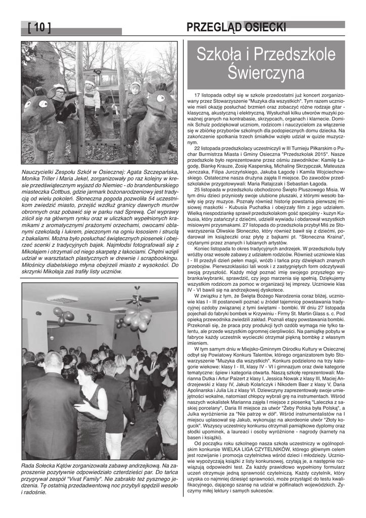 [ 10 ] PRZEGLĄD OSIECKI Szkoła i Przedszkole Świerczyna Nauczycielki Zespołu Szkół w Osiecznej: Agata Szczepańska, Monika Triller i Maria Jekel, zorganizowały po raz kolejny w kresie przedświątecznym wyjazd do Niemiec - do brandenburskiego miasteczka Cottbus, gdzie jarmark bożonarodzeniowy jest tradycją od wielu pokoleń. Słoneczna pogoda pozwoliła 54 uczestnikom zwiedzić miasto, przejść wzdłuż granicy dawnych murów obronnych oraz pobawić się w parku nad Sprewą. Cel wyprawy ziścił się na głównym rynku oraz w uliczkach wypełnionych kramikami z aromatycznymi prażonymi orzechami, owocami oblanymi czekoladą i lukrem, pieczonym na ogniu łososiem i struclą z bakaliami. Można było posłuchać świątecznych piosenek i obejrzeć scenki z tradycyjnych bajek. Najmłodsi fotografowali się z Mikołajem i otrzymali od niego skarpetę z łakociami. Chętni wzięli udział w warsztatach plastycznych w drewnie i scrapbookingu. Miłośnicy diabelskiego młyna obejrzeli miasto z wysokości. Do skrzynki Mikołaja zaś trafiły listy uczniów. Rada Sołecka Kątów zorganizowała zabawę andrzejkową. Na zaproszenie pozytywnie odpowiedziało czterdzieści par. Do tańca przygrywał zespół "Vivat Family". Nie zabrakło też pysznego jedzenia. Tę ostatnią przedadwentową noc przybyli spędzili wesoło i radośnie. 17 listopada odbył się w szkole przedostatni już koncert zorganizowany przez Stowarzyszenie "Muzyka dla wszystkich". Tym razem uczniowie mieli okazję posłuchać brzmień oraz zobaczyć różne rodzaje gitar klasyczną, akustyczną i elektryczną. Wysłuchali kilku utworów muzyki poważnej granych na kontrabasie, skrzypcach, organach i klarnecie. Dominik Schulz podziękował uczniom, rodzicom i nauczycielom za włączenie się w zbiórkę przyborów szkolnych dla podopiecznych domu dziecka. Na zakończenie spotkania trzech śmiałków wzięło udział w quizie muzycznym. 22 listopada przedszkolacy uczestniczyli w III Turnieju Piłkarskim o Puchar Burmistrza Miasta i Gminy Osieczna "Przedszkolak 2015". Nasze przedszkole było reprezentowane przez ośmiu zawodników: Kamilę Łagodę, Biankę Krauze, Zosię Kasperską, Michalinę Skrzypczak, Mateusza Jenczaka, Filipa Jurczyńskiego, Jakuba Łagodę i Kamila Wojciechowskiego. Ostateczne nasza drużyna zajęła II miejsce. Do zawodów przedszkolaków przygotowywali: Maria Ratajczak i Sebastian Łagoda. 25 listopada w przedszkolu obchodzono Święto Pluszowego Misia. W tym dniu dzieci przyniosły swoje ulubione pluszaki, z którymi wesoło bawiły się przy muzyce. Poznały również historię powstania pierwszej misiowej maskotki - Kubusia Puchatka i obejrzały film z jego udziałem. Wielką niespodziankę sprawił przedszkolakom gość specjalny - kuzyn Kubusia, który zatańczył z dziećmi, udzielił wywiadu i obdarował wszystkich misiowymi przysmakami. 27 listopada do przedszkola przybył Miś ze Stowarzyszenia Oliwskie Słoneczko, który również bawił się z dziećmi, podarował im książeczki oraz płytę z bajkami pt. "Słoneczna Kraina", czytanymi przez znanych i lubianych artystów. Koniec listopada to okres tradycyjnych andrzejek. W przedszkolu były wróżby oraz wesołe zabawy z udziałem rodziców. Również uczniowie klas I - III przeżyli dzień pełen magii, wróżb i tańca przy dźwiękach znanych przebojów. Pierwszoklasiści lali wosk i z zastygniętych form odczytywali swoją przyszłość. Każdy mógł poznać imię swojego przyszłego wybranka/wybranki, sprawdzić, czy jego marzenia się spełnią. Dziękujemy wszystkim rodzicom za pomoc w organizacji tej imprezy. Uczniowie klas IV - VI bawili się na andrzejkowej dyskotece. W związku z tym, że Święta Bożego Narodzenia coraz bliżej, uczniowie klas I - III postanowili poznać u źródeł tajemnicę powstawania tradycyjnej ozdoby związanej z tymi świętami - bombki. W dniu 27 listopada pojechali do fabryki bombek w Krzywiniu - Firmy St. Martin Glass s. c. Pod opieką przewodnika zwiedzili zakład. Poznali etapy powstawania bombki. Przekonali się, że praca przy produkcji tych ozdób wymaga nie tylko talentu, ale przede wszystkim ogromnej cierpliwości. Na pamiątkę pobytu w fabryce każdy uczestnik wycieczki otrzymał piękną bombkę z własnym imieniem. W tym samym dniu w Miejsko-Gminnym Ośrodku Kultury w Osiecznej odbył się Powiatowy Konkurs Talentów, którego organizatorem było Stowarzyszenie "Muzyka dla wszystkich". Konkurs podzielono na trzy kategorie wiekowe: klasy I - III, klasy IV - VI i gimnazjum oraz dwie kategorie tematyczne: śpiew i kategoria otwarta. Naszą szkołę reprezentowali: Marianna Dutka i Artur Paizert z klasy I, Jessica Nowak z klasy III, Maciej Andrzejewski z klasy IV, Jakub Kolańczyk i Nikodem Baer z klasy V, Daria Apolinarska i Julia Lis z klasy VI. Dziewczyny zaprezentowały swoje umiejętności wokalne, natomiast chłopcy wybrali grę na instrumentach. Wśród naszych wokalistek Marianna zajęła I miejsce z piosenką "Laleczka z saskiej porcelany", Daria III miejsce za utwór "Żeby Polska była Polską", a Julka wyróżnienie za "Nie patrzę w dół". Wśród instrumentalistów na I miejscu uplasował się Jakub, wykonując na akordeonie utwór "Złoty kogucik". Wszyscy uczestnicy konkursu otrzymali pamiątkowe dyplomy oraz słodki upominek, a laureaci i osoby wyróżnione - nagrody (karnety na basen i książki). Od początku roku szkolnego nasza szkoła uczestniczy w ogólnopolskim konkursie WIELKA LIGA CZYTELNIKÓW, którego głównym celem jest rozwijanie i promocja czytelnictwa wśród dzieci i młodzieży. Uczniowie wypożyczają książki z listy konkursowej, czytają je, a następnie rozwiązują odpowiedni test. Za każdy prawidłowo wypełniony formularz uczeń otrzymuje jedną sprawność czytelniczą. Każdy czytelnik, który uzyska co najmniej dziesięć sprawności, może przystąpić do testu kwalifikacyjnego, dającego szansę na udział w półfinałach wojewódzkich.