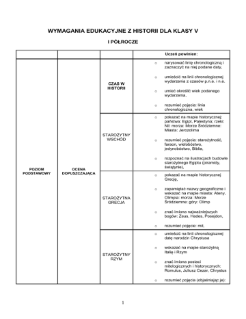 WYMAGANIA EDUKACYJNE Z HISTORII DLA KLASY V I PÓŁROCZE Uczeń powinien: CZAS W HISTORII STAROŻYTNY WSCHÓD POZIOM PODSTAWOWY OCENA DOPUSZCZAJĄCA o narysować linię chronologiczną i zaznaczyć na niej podane daty, o umieścić na linii chronologicznej wydarzenia z czasów p.n.e. i n.e. o umieć określić wiek podanego wydarzenia, o rozumieć pojęcia: linia chronologiczna, wiek o pokazać na mapie historycznej: państwa: Egipt, Palestyna; rzeki: Nil: morza: Morze Śródziemne: Miasta: Jerozolima o rozumieć pojęcia: starożytność, faraon, wielobóstwo, jedynobóstwo, Biblia, o rozpoznać na ilustracjach budowle starożytnego Egiptu (piramidy, świątynie), o pokazać na mapie historycznej Grecję, o zapamiętać nazwy geograficzne i wskazać na mapie miasta: Ateny, Olimpia: morza: Morze Śródziemne: góry: Olimp o znać imiona najważniejszych bogów: Zeus, Hades, Posejdon, o rozumieć pojęcie: mit, o umieścić na linii chronologicznej datę narodzin Chrystusa o wskazać na mapie starożytną Italię i Rzym o znać imiona postaci mitologicznych i historycznych: Romulus, Juliusz Cezar, Chrystus o rozumieć pojęcia (objaśniając je): STAROŻYTNA GRECJA STAROŻYTNY RZYM 1 imperium, niewolnik, cesarz, CZAS W HISTORII o wiedzieć, że Rzym uważany był za stolicę świata starożytnego o kojarzyć nauczanie Jezusa Chrystusa z początkiem chrześcijaństwa, o opisać los niewolnika. o umieć określać wydarzenia w kategorii wcześniejsze późniejsze o nazwać kontynent i wskazać na mapie historycznej położenie geograficzne Egiptu oraz Palestyny o znać imiona postaci historycznych i biblijnych (Jahwe, Mojżesz), o rozumieć pojęcia: państwo, papirus, despota, mumia, prorok, o wyjaśnić przeznaczenie budowli (piramida, świątynia), o rozpoznać pismo obrazkowe na ilustracjach, o określić położenie geograficzne Grecji na mapie historycznej, o pamiętać imiona postaci historycznych i mitologicznych: Aleksander Macedoński, Prometeusz, Dedal i Ikar, Herakles o wiedzieć, jakimi dziedzinami opiekowali się bogowie: Zeus, Hera, Posejdon, Atena, Apollo, Hades, Afrodyta o rozumieć pojęcia: państwo-miasto, pięciobój, tragedia, komedia o wymienić dyscypliny olimpijskie, o wymienić style architektury greckiej, o wymienić dzieła Homera i określić ich tematykę. o umieścić na linii chronologicznej STAROŻYTNY WSCHÓD OCENA DOSTATECZNA STAROŻYTNA GRECJA STAROŻYTNY 2 RZYM daty: 753 r. p.n.e. 476 r. p.n.e. , o wskazać na mapie granice imperium rzymskiego o pamiętać nazwy geograficzne (wskazując na mapie): Tybr, Sycylia, Płw.Apeniński, Roma - znać imiona postaci historycznych i mitologicznych: Spartakus, Romulus i Remus, Mars o rozumieć pojęcie (objaśniając je): legiony, o wskazać przyczyny niewolnictwa w starożytności, o wymienić najważniejsze osiągnięcia cywilizacyjne Rzymian (technika, budownictwo, prawo), o wymienić główne założenia religii chrześcijańskiej o obliczyć na wybranych przykładach, ile lat upłynęło od wskazania wydarzenia p.n.e. do czasów współczesnych (w przybliżeniu) o przyporządkować wydarzenie do połowy wieku (pierwsza połowa, druga) o określić położenie Egiptu i Palestyny, o znać imiona postaci: Re, Dawid Salomon, o rozumieć pojęcia: sarkofag, sfinks, hieroglify, balsamowanie, monarchia despotyczna, Dekalog, Stary Testament, o wyjaśnić związek między warunkami naturalnymi a zajęciami i życiem ludności (Egipt, Palestyna), o odczytać informacje z materiału ikonograficznego w podręczniku i opowiedzieć o pracy egipskiego chłopa. CZAS W HISTORII OCENA DOBRA STAROŻYTNY WSCHÓD 3 STAROŻYTNA GRECJA POZIOM PONADPODSTAWOWY o zaznaczyć na linii chronologicznej czas powstania poznanych państw (Egipt, Palestyna, Grecja). -zapamiętać i pokazać na mapie: Morze Jońskie, Morze Egejskie, Macedonia, Sparta, Azja Mniejsza, Troja o znać imiona postaci historycznych i mitologicznych: Dionizos, bohaterów wojny trojańskiej: Achilles, Hektor, Parys o wymienić antropomorficzne cechy bogów greckich o wymienić zadania zgromadzenia ludowego w Atenach o wymienić, jakie skarby kultury znajdują się na Akropolu o wyjaśnić symbolikę mitów: o Prometeuszu, Heraklesie, Dedal i Ikar o rozpoznać na materiale ikonograficznym style architektury greckiej o opisać na podstawie ilustracji wygląd teatru greckiego. o odczytać z mapy historycznej nazwy mieszkańców starożytnej Italii, o na postawie mapy określić terytorium cesarstwa zachodniorzymskiego i wschodniorzymskiego, o znać imiona postaci historycznych: Oktawian, August, Attyla, Konstantyn Wielki, o rozumieć pojęcia: romanizacja, prawo rzymskie, kodeks, o znać zadania urzędników rzymskich: konsula, trybuna ludowego, senatu, o wyjaśnić przyczyny wybuchu powstania Spartakusa, o wykazać, na czym polegał OCENA DOBRA STAROŻYTNY RZYM 4 związek chrześcijaństwa z judaizmem.. CZAS W HISTORII STAROŻYTNY WSCHÓD OCENA BARDZO DOBRA STAROŻYTNA GRECJA 5 o rozumieć umowności rachuby czasu o podać przykłady innych sposobów mierzenia czasu o umieć zlokalizować państwa Starożytnego Wschodu na mapie, o porównać terytorium i granice państw starożytnych ze współczesnymi, o wskazać różnice i podobieństwa między religią żydowską a egipską, o wykazać wpływ kultury starożytnego Wschodu na współczesność, o wyjaśnić, dlaczego niektóre nauki rozwinęły się właśnie w Egipcie, o wyjaśnić przyczyny istnienia nieograniczonej władzy faraona, o znać funkcje i rozumieć hierarchiczny układ społeczeństwa egipskiego. o odczytać z mapy przebieg podbojów Aleksandra Macedońskiego, o porównać warunki naturalne i zajęcia ludności w Grecji oraz Egipcie, o porównać wierzenia Egipcjan i Greków, o porównać teatr grecki ze współczesnym, o porównać igrzyska sportowe starożytności ze współczesnymi olimpiadami, o ocenić Aleksandra Macedońskiego jako wodza i polityka, o określić wpływ kultury greckiej na współczes