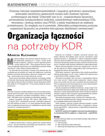 RATOWNICTWO I OCHRONA LUDNOŚCI Podczas ćwiczeń międzywojewódzkich i inspekcji gotowości operacyjnej jednostek ratowniczo-gaśniczych można było dostrzec typowe, powtarzające się błędy. Dotyczyły one m.in.: organizowania łączności, prowadzenia korespondencji radiowej, prawidłowego wykorzystania SDŁ, tworzenia i obsługi sztabu oraz PPSiS, a także współpracy ze statkami powietrznymi. Ze względu na to powstała „Metodyka postępowania podczas organizacji łączności na potrzeby kierującego działaniem ratowniczym”. Organizacja łączności na potrzeby KDR Marcin Kucharski M etodyka porządkuje wiele informacji zebranych dotychczas w różnych dokumentach, przedstawia je w zwięzły i czytelny sposób. Powstała na podstawie: „Instrukcji w sprawie organizacji łączności w sieciach radiowych PSP”, „Zasad organizacji łączności alarmowania, powiadamiania dysponowania oraz współdziałania na potrzeby działań ratowniczych”, a także „Krajowych Danych Radiowych”. Nie wprowadza ona nowych pojęć i rozwiązań, służy natomiast temu, aby wymieniona powyżej instrukcja oraz zasady były respektowane i realizowane jednolicie na poziomie interwencyjnym, taktycznym i strategicznym w całym kraju – zarówno podczas rzeczywistych zdarzeń, jak i ćwiczeń. Pomysł opracowania jednego spójnego dokumentu zawierającego niezbędne informacje i dane dotyczące organizacji łączności na potrzeby KDR powstał przed odprawą kadry dowódczej Centralnego Odwodu Operacyjnego KSRG, która odbyła się 27-29 listopada 2013 r. Na niej właśnie materiał ten został zaprezentowany. Zmiany Prócz prac związanych z metodyką zaproponowano wówczas korektę zasad organizacji łączności pod kątem zmiany zakresu organizacji łączności dla KDR. Postulowano umożliwienie prowadzenia korespondencji radiowej w relacji KDR – PSK/MSK również za pośrednictwem radiotelefonu nasobnego. Zastępca komendanta głównego PSP pismem (BIŁ-I-0462/3-1/14) z 16 stycznia 2014 r. wprowadził do stosowania w jednostkach organizacyjnych PSP metodykę oraz aneks nr 1 do „Zasad organizacji łączności alarmowania, powiadamiania dysponowania oraz współdziałania na potrzeby działań ratowniczych”, zmieniając zapisy pkt 5.5. Było: „5.5. Łączność KDR na kanale powiatowym z PSK/MSK odbywa się za pośrednictwem radiotelefonu przewoźnego”. Jest (nowy zapis): „5.5. Łączność KDR na kanale powiatowym z PSK/MSK, w przypadku braku zasięgów z radiotelefonu nasobnego, odbywa się za pośrednictwem radiotelefonu przewoźnego”. Na odprawie ustalono także, że podczas organizowania i przeprowadzania ćwiczeń – zarówno na poziomie wojewódzkim, jak i powiatowym – należy zwracać szczególną uwagę na pewne kwestie: 26 Konieczne jest wyrabianie u strażaków stosownych nawyków, przy każdym zdarzeniu. Bezwzględnie należy stosować zatwierdzone zasady organizacji łączności, w szczególności w zakresie uruchamiania kanałów ratowniczo-gaśniczych (KRG). Powinny one być przydzielane przez stanowiska kierowania przed przyjazdem na miejsce zdarzenia, tak aby ratownicy jeszcze w pojeździe mogli uruchomić radiotelefon na odpowiednim kanale. Miejsce ustawienia pojazdów powinno być zorganizowane w taki sposób, aby zapewnić im właściwe zasięgi radiowe (jeśli wykorzystywane są samochody dowodzenia i łączności SDŁ). PPSIS należy wyposażać w sprzęt radiowy, który umożliwia prawidłową realizację postawionego mu celu i może w każdej chwili zapewnić pracę w sieciach KSW i KDW, a dodatkowo KRG. Obowiązuje bezwzględny zakaz używania w korespondencji radiowej m.in. imion, nazwisk i funkcji zamiast kryptonimów. Jedynym odstępstwem od tej zasady może być praca na kanałach ratowniczo-gaśniczych. Wówczas dopuszczona jest forma podawania np. imion zamiast kryptonimów, co pozwala skrócić czas zajmowania pasma. Zalecane jest podawanie okólnikiem (zamiast np. „uwaga, uwaga”) ważnych informacji dotyczących całego terenu działań (jak np. podział na odcinki bojowe, zmiany lub przydział kanałów radiowych dla poszczególnych odcinków), mających wpływ na poprawę organizacji działań oraz zwiększających bezpieczeństwo ratowników w sytuacjach zagrożenia. Obowiązuje przestrzeganie zasady: minimum słów, maksimum treści. Alternatywne urządzenia łączności mogą być stosowane tylko i wyłącznie w przypadku braku łączności radiowej UKF. Należy pamiętać o sprawnej wymianie informacji pomiędzy wszystkimi stanowiskami (SK KW, SK KM/KP, sztab), w szczególności w zakresie wykorzystania KSWL – statek powietrzny w ciągu krótkiej chwili pokonuje znaczną odległość. Sieć KSWL musi być bezwzględnie wykorzystywana jako podstawowy kanał (kanał U02) do współpracy w relacji strażak – zespół HEMS. Metodyka Wszystkie informacje zebrane są na trzech kartach metodyki, odpowiednich do poziomu dowodzenia: A – interwencyjnego, B – taktycznego (bez powołania sztabu akcji), C – taktycznego lub strategicznego (z powołaniem sztabu akcji). 4/2014 A. Metodyka organizacji łączności na potrzeby KDR na poziomie interwencyjnym Karta składa się z trzech modułów (informacji, działań), jakie KDR powinien wykorzystać (wykonać) na poziomie interwencyjnym, a mianowicie: I. W trakcie dojazdu do miejsca zdarzenia. II. Po przybyciu na miejsce działań KDR musi pamiętać, że: tylko on może pracować z macierzystym stanowiskiem kierowania w sieci powiatowej (PR), musi uzgodnić z SK KP/KM* kanał ratowniczo-gaśniczy (KRG) do wykorzystania na miejscu działań, obowiązuje określony sposób postępowania (organizowania łączności) w razie konieczności dysponowania dodatkowych sił z własnego powiatu lub z innych powiatów, a nawet województw. Metodyka wyraźnie pokazuje, że siły i środki spoza powiatu nie muszą, a nawet nie powinny mieć zaprogramowanego całego wachlarza częstotliwości, tj. ws