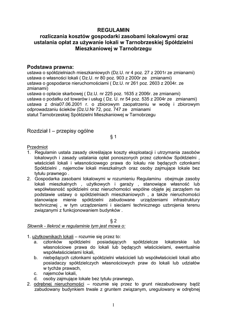 REGULAMIN rozliczania kosztów gospodarki zasobami lokalowymi oraz ustalania opłat za używanie lokali w Tarnobrzeskiej Spółdzielni Mieszkaniowej w Tarnobrzegu Podstawa prawna: ustawa o spółdzielniach mieszkaniowych (Dz.U. nr 4 poz. 27 z 2001r ze zmianami) ustawa o własności lokali ( Dz.U. nr 80 poz. 903 z 2000r ze zmianami) ustawa o gospodarce nieruchomościami ( Dz.U. nr 261 poz. 2603 z 2004r. ze zmianami) ustawa o opłacie skarbowej ( Dz.U. nr 225 poz. 1635 z 2006r. ze zmianami) ustawa o podatku od towarów i usług ( Dz. U. nr 54 poz. 535 z 2004r ze zmianami) ustawa z dnia07.06.2001 r. o zbiorowym zaopatrzeniu w wodę i zbiorowym odprowadzaniu ścieków (Dz.U.Nr 72, poz. 747 ze zmianami statut Tarnobrzeskiej Spółdzielni Mieszkaniowej w Tarnobrzegu Rozdział I – przepisy ogólne §1 Przedmiot 1. Regulamin ustala zasady określające koszty eksploatacji i utrzymania zasobów lokalowych i zasady ustalania opłat ponoszonych przez członków Spółdzielni , właścicieli lokali i własnościowego prawa do lokalu nie będących członkami Spółdzielni , najemców lokali mieszkalnych oraz osoby zajmujące lokale bez tytułu prawnego . 2. Gospodarka zasobami lokalowymi w rozumieniu Regulaminu obejmuje zasoby lokali mieszkalnych , użytkowych i garaży , stanowiące własność lub współwłasność spółdzielni oraz nieruchomości wspólne objęte jej zarządem na podstawie ustawy o spółdzielniach mieszkaniowych , a także nieruchomości stanowiące mienie spółdzielni zabudowane urządzeniami infrastruktury technicznej , w tym urządzeniami i sieciami technicznego uzbrojenia terenu związanymi z funkcjonowaniem budynków . §2 Słownik - Ilekroć w regulaminie tym jest mowa o: 1. użytkownikach lokali – rozumie się przez to: a. członków spółdzielni posiadających spółdzielcze lokatorskie lub własnościowe prawa do lokali lub będących właścicielami, ewentualnie współwłaścicielami lokali, b. niebędących członkami spółdzielni właścicieli lub współwłaścicieli lokali albo posiadaczy spółdzielczych własnościowych praw do lokali lub udziałów w tychże prawach, c. najemców lokali, d. osoby zajmujące lokale bez tytułu prawnego, 2. odrębnej nieruchomości – rozumie się przez to grunt niezabudowany bądź zabudowany budynkiem trwale z gruntem związanym, uregulowany w odrębnej 1 księdze wieczystej bądź projektowany do wydzielenia w odrębną nieruchomość zgodnie z uchwałą uprawnionego organu Spółdzielni; 3. nieruchomości wspólnej – rozumie się przez to grunt oraz część budynku i urządzenia, które nie służą wyłącznie do użytku właściciela lokalu w obrębie nieruchomości 4. udziale w nieruchomości wspólnej – rozumie się przez to udział w nieruchomości wspólnej odpowiadający stosunkowi powierzchni użytkowej lokalu wraz z powierzchnią przynależną do powierzchni użytkowej wszystkich lokali wraz z pomieszczeniami do nich przynależnymi; Udział w nieruchomości wspólnej określa uchwała zarządu, o jakiej mowa w art. 42 ustawy o spółdzielniach mieszkaniowych. 5. pomieszczeniu przynależnym – rozumie się przez to pomieszczenie pomocnicze lokalu mieszkalnego lub lokalu o innym przeznaczeniu, w szczególności piwnicę, strych, komórkę, garaż, będące częścią składową lokalu, nawet jeżeli bezpośrednio do niego nie przylega lub znajduje się w innym budynku, ale w ramach jednej odrębnej nieruchomości; 6. lokalu mieszkalnym – rozumie się przez to wydzielony trwałymi ścianami w obrębie budynku zespół izb przeznaczony na stały pobyt ludzi, który wraz z pomieszczeniami przynależnymi służy zaspokojeniu ich potrzeb mieszkaniowych, przy czym za lokal mieszkalny uważa się również pracownię twórcy przeznaczoną do prowadzenia działalności w dziedzinie kultury i sztuki; 7. mieniu wspólnym – rozumie się wszystkie nieruchomości, budowle i inne urządzenia stanowiące własność Spółdzielni, a przeznaczone ze względu na ich charakter i funkcję do użytkowania przez wszystkich mieszkańców określonych nieruchomości, a w szczególności : - budynki administracji osiedlowych, - chodniki, ciągi pieszo-jezdne, - ulice wewnętrzne osiedli, parkingi, zatoki postojowe, - oświetlenia terenów i ulic, - małą architektura i tereny zielone - infrastruktura techniczna służąca do zabezpieczenia dostawy mediów do lokali budynków. 8. mieniu ogólnym rozumie się wszystkie nieruchomości, budowle i inne urządzenia stanowiące własność Spółdzielni służące prowadzeniu przez Spółdzielnię działalności wytwórczej, budowlanej, handlowej, usługowej, społecznej, oświatowo-kulturalnej administracyjnej i innej, zabudowane budynkami i innymi urządzeniami i nie przeznaczone ze względu na swój charakter i funkcję do wyodrębnienia, jak też nie stanowiące mienia wspólnego. W szczególności mieniem ogólnym w ramach gospodarki zasobem lokalowym są lokale stanowiące własność spółdzielni (lokale najem i bez tytułu prawnego) i budynek administracji ogólnej 9. osobach zamieszkałych w lokalu mieszkalnym – rozumie się przez to osoby faktycznie korzystające z lokalu, w tym wymienione w punkcie 1, 10. pożytkach i innych przychodach z nieruchomości wspólnej – rozumie się przez to dochody, które nieruchomość przynosi na podstawie stosunku prawnego, które służą pokrywaniu wydatków związanych z eksploatacją i jej utrzymaniem, a w części przekraczającej te potrzeby przypadają właścicielom lokali proporcjonalnie do ich udziałów; 11. pożytkach i innych przychodach z własnej działalności gospodarczej rozumie się dochody uzyskiwane z mienia Spółdzielni , które Spółdzielnia może przeznaczyć 2 na pokrycie wydatków związanych z eksploatacją i utrzymaniem nieruchomości w zakresie obciążającym członków oraz na prowadzenie działalności społecznej, oświatowej i kulturalnej. 12. koszty niezależne od spółdzielni- do kosztów ni