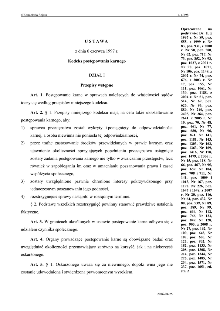 ©Kancelaria Sejmu s. 1/298 U S T AWA z dnia 6 czerwca 1997 r. Kodeks postępowania karnego DZIAŁ I Przepisy wstępne Art. 1. Postępowanie karne w sprawach należących do właściwości sądów toczy się według przepisów niniejszego kodeksu. Art. 2. § 1. Przepisy niniejszego kodeksu mają na celu takie ukształtowanie postępowania karnego, aby: 1) sprawca przestępstwa został wykryty i pociągnięty do odpowiedzialności karnej, a osoba niewinna nie poniosła tej odpowiedzialności, 2) przez trafne zastosowanie środków przewidzianych w prawie karnym oraz ujawnienie okoliczności sprzyjających popełnieniu przestępstwa osiągnięte zostały zadania postępowania karnego nie tylko w zwalczaniu przestępstw, lecz również w zapobieganiu im oraz w umacnianiu poszanowania prawa i zasad współżycia społecznego, 3) zostały uwzględnione prawnie chronione interesy pokrzywdzonego przy jednoczesnym poszanowaniu jego godności, 4) rozstrzygnięcie sprawy nastąpiło w rozsądnym terminie. § 2. Podstawę wszelkich rozstrzygnięć powinny stanowić prawdziwe ustalenia faktyczne. Art. 3. W granicach określonych w ustawie postępowanie karne odbywa się z udziałem czynnika społecznego. Art. 4. Organy prowadzące postępowanie karne są obowiązane badać oraz uwzględniać okoliczności przemawiające zarówno na korzyść, jak i na niekorzyść oskarżonego. Art. 5. § 1. Oskarżonego uważa się za niewinnego, dopóki wina jego nie zostanie udowodniona i stwierdzona prawomocnym wyrokiem. 2016-04-25 Opracowano na podstawie: Dz. U. z 1997 r. Nr 89, poz. 555, z 1999 r. Nr 83, poz. 931, z 2000 r. Nr 50, poz. 580, Nr 62, poz. 717, Nr 73, poz. 852, Nr 93, poz. 1027, z 2001 r. Nr 98, poz. 1071, Nr 106, poz. 1149, z 2002 r. Nr 74, poz. 676, z 2003 r. Nr 17, poz. 155, Nr 111, poz. 1061, Nr 130, poz. 1188, z 2004 r. Nr 51, poz. 514, Nr 69, poz. 626, Nr 93, poz. 889, Nr 240, poz. 2405, Nr 264, poz. 2641, z 2005 r. Nr 10, poz. 70, Nr 48, poz. 461, Nr 77, poz. 680, Nr 96, poz. 821, Nr 141, poz. 1181, Nr 143, poz. 1203, Nr 163, poz. 1363, Nr 169, poz. 1416, Nr 178, poz. 1479, z 2006 r. Nr 15, poz. 118, Nr 66, poz. 467, Nr 95, poz. 659, Nr 104, poz. 708 i 711, Nr 141, poz. 1009 i 1013, Nr 167, poz. 1192, Nr 226, poz. 1647 i 1648, z 2007 r. Nr 20, poz. 116, Nr 64, poz. 432, Nr 80, poz. 539, Nr 89, poz. 589, Nr 99, poz. 664, Nr 112, poz. 766, Nr 123, poz. 849, Nr 128, poz. 903, z 2008 r. Nr 27, poz. 162, Nr 100, poz. 648, Nr 107, poz. 686, Nr 123, poz. 802, Nr 182, poz. 1133, Nr 208, poz. 1308, Nr 214, poz. 1344, Nr 225, poz. 1485, Nr 234, poz. 1571, Nr 237, poz. 1651, cd. str. 2 ©Kancelaria Sejmu s. 2/298 § 2. Niedające się usunąć wątpliwości rozstrzyga się na korzyść oskarżonego. Art. 6. Oskarżonemu przysługuje prawo do obrony, w tym prawo do korzystania z pomocy obrońcy, o czym należy go pouczyć. Art. 7. Organy postępowania kształtują swe przekonanie na podstawie wszystkich przeprowadzonych dowodów, ocenianych swobodnie z uwzględnieniem zasad prawidłowego rozumowania oraz wskazań wiedzy i doświadczenia życiowego. Art. 8. § 1. Sąd karny rozstrzyga samodzielnie zagadnienia faktyczne i prawne oraz nie jest związany rozstrzygnięciem innego sądu lub organu. § 2. Prawomocne rozstrzygnięcia sądu kształtujące prawo lub stosunek prawny są jednak wiążące. Art. 9. § 1. Organy procesowe prowadzą postępowanie i dokonują czynności z urzędu, chyba że ustawa uzależnia je od wniosku określonej osoby, instytucji lub organu albo od zezwolenia władzy. § 2. Strony i inne osoby bezpośrednio zainteresowane mogą składać wnioski o dokonanie również tych czynności, które organ może lub ma obowiązek podejmować z urzędu. Art. 10. § 1. Organ powołany do ścigania przestępstw jest obowiązany do wszczęcia i przeprowadzenia postępowania przygotowawczego, a oskarżyciel publiczny także do wniesienia i popierania oskarżenia – o czyn ścigany z urzędu. § 2. Z wyjątkiem wypadków określonych w ustawie lub w prawie międzynarodowym nikt nie może być zwolniony od odpowiedzialności za popełnione przestępstwo. Art. 11. § 1. Postępowanie w sprawie o występek, zagrożony karą pozbawienia wolności do lat 5, można umorzyć, jeżeli orzeczenie wobec oskarżonego kary byłoby oczywiście niecelowe ze względu na rodzaj i wysokość kary prawomocnie orzeczonej za inne przestępstwo, a interes pokrzywdzonego temu się nie sprzeciwia. § 2. Jeżeli kara za inne przestępstwo nie została prawomocnie orzeczona, postępowanie można zawiesić. Zawieszone postępowanie należy umorzyć albo podjąć przed upływem 3 miesięcy od uprawomocnienia się orzeczenia w sprawie o inne przestępstwo, o którym mowa w § 1. 2016-04-25 z 2009 r. Nr 8, poz. 39, Nr 20, poz. 104, Nr 28, poz. 171, Nr 68, poz. 585, Nr 85, poz. 716, Nr 127, poz. 1051, Nr 144, poz. 1178, Nr 168, poz. 1323, Nr 178, poz. 1375, Nr 190, poz. 1474, Nr 206, poz. 1589, z 2010 r. Nr 7, poz. 46, Nr 98, poz. 626, Nr 106, poz. 669, Nr 122, poz. 826, Nr 125, poz. 842, Nr 182, poz. 1228, Nr 197, poz. 1307, z 2011 r. Nr 48, poz. 245 i 246, Nr 53, poz. 273, Nr 112, poz. 654, Nr 117, poz. 678, Nr 142, poz. 829, Nr 191, poz. 1135, Nr 217, poz. 1280, Nr 240, poz. 1430, 1431 i 1438, Nr 279, poz. 1645, z 2012 r. poz. 886, 1091, 1101, 1327, 1426, 1447, 1529, z 2013 r. poz. 480, 765, 849 , 1247, 1262, 1282, 1650, z 2014 r. poz. 85, 384, 694, 1375, 1556, z 2015 r. poz. 21, 290, 396, 1185, 1186, 1334, 1788, 1855, 2281, z 2016 r. poz. 178, 437. ©Kancelaria Sejmu s. 3/298 § 3. Postępowanie umorzone na podstawie § 1 można wznowić w wypadku uchylenia lub istotnej zmiany treści prawomocnego wyroku, z powodu którego zostało ono umorzone. Art. 12. § 1. W sprawach o przestępstwa ścigane na wniosek postępowanie z chwilą złożenia wniosku toczy się z urzędu. Organ ścigania poucza osobę uprawnioną do złożenia wniosku o przysługującym jej uprawnieniu. § 2. W razie złożenia wniosku o ściganie niektó