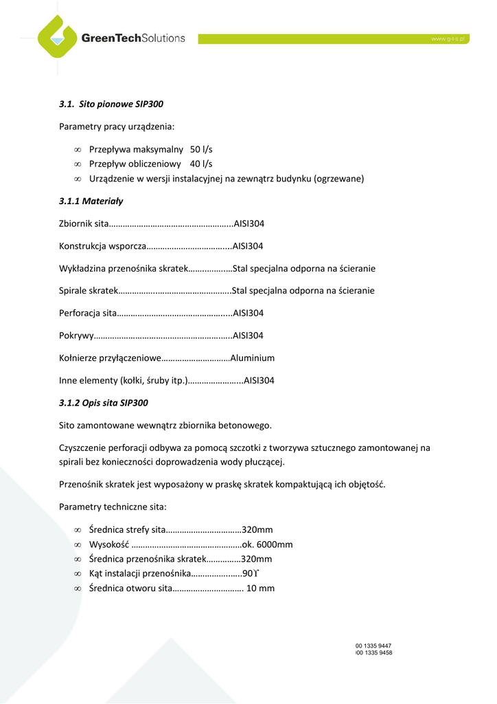 3.1. Sito pionowe SIP300 Parametry pracy urządzenia: • • • Przepływa maksymalny 50 l/s Przepływ obliczeniowy 40 l/s Urządzenie w wersji instalacyjnej na zewnątrz budynku (ogrzewane) 3.1.1 Materiały Zbiornik sita……………………………………………...AISI304 Konstrukcja wsporcza……………………………....AISI304 Wykładzina przenośnika skratek……..……..…Stal specjalna odporna na ścieranie Spirale skratek……………..…………………………..Stal specjalna odporna na ścieranie Perforacja sita……………………………………….....AISI304 Pokrywy……………………………………………….…..AISI304 Kołnierze przyłączeniowe…………………………Aluminium Inne elementy (kołki, śruby itp.)…………………...AISI304 3.1.2 Opis sita SIP300 Sito zamontowane wewnątrz zbiornika betonowego. Czyszczenie perforacji odbywa za pomocą szczotki z tworzywa sztucznego zamontowanej na spirali bez konieczności doprowadzenia wody płuczącej. Przenośnik skratek jest wyposażony w praskę skratek kompaktującą ich objętość. Parametry techniczne sita: • • • • • Średnica strefy sita……………………………320mm Wysokość …………………………………………ok. 6000mm Średnica przenośnika skratek……………320mm Kąt instalacji przenośnika……………..…..90° Średnica otworu sita…………………………. 10 mm Green Tech Solutions Sp. z o.o. ul. Zimorodków 17/1 40-534 Katowice telefon/fax (32) 350-32-60, 61 mail: [email protected] Kapitał zakładowy: 50 000zł KRS: 0000385762 Sąd Rejonowy Katowice – Wschód Wydział VIII Gospodarczy KRS REGON: 241894953 NIP:634-278-34-39 Konta bankowe: Raiffeisen Bank Polska S.A PLN 05 1750 1035 0000 0000 1335 9447 EUR 96 1750 1035 0000 0000 1335 9458 SWIFT: R C B W P L P W Dodatkowe wyposażenie sita: • • • • Króciec dopływowy………………….....średnica zgodnie z projektem/kołnierz luźny Rynna zrzutowa……………………………AISI304 Sonda konduktometryczna do sterowania pracą sita Silnik z przekładnią płaską produkcji SEW lub NORD 3.1.3 Napędy zamontowane w urządzeniu • • Napęd sita………………………………16 obr/min, 1,5 kW, 400V, IP 55 Producent………………………….……SEW lub NORD 3.1.4 Spirale zamontowane w urządzeniu Urządzenie wyposażone jest w spirale bezwałowe najwyższej jakości wykonane jako element gięty z jednego kęsa stali specjalnej. Spirala jest obrabiana cieplnie i chemicznie celem zwiększenia odporności powierzchni na zużycie. 3.1.5 Opcjonalne przygotowanie urządzenia do pracy na zewnątrz budynku Ocieplenie wełną mineralną, ogrzewanie samoregulującymi listwami grzejnymi, przykrycie polerowaną blachą ze stali nierdzewnej. 3.1.6 Szafa sterowania Sito pionowe jest dostarczane z szafą sterowania. Charakterystyka: • • • • • • • • • • Klasa ochrony IP 55 Moc nominalna 400/230V, 50Hz, In 25A Wyłącznik główny 25A Możliwość ręcznego sterowania urządzeniem Niezbędne przekaźniki do sterowania urządzeniem Niezbędne bezpieczniki, łączniki, styczniki i przekaźniki termiczne do wyjścia silnika Wyłącznik start/stop i stanu alarmowego w części wlotowej urządzenia Czujnik poziomu Lampy pracy i stanu alarmowego Sygnały alarmu skierowane na listwy zaciskowe Green Tech Solutions Sp. z o.o. ul. Zimorodków 17/1 40-534 Katowice telefon/fax (32) 350-32-60, 61 mail: [email protected] Kapitał zakładowy: 50 000zł KRS: 0000385762 Sąd Rejonowy Katowice – Wschód Wydział VIII Gospodarczy KRS REGON: 241894953 NIP:634-278-34-39 Konta bankowe: Raiffeisen Bank Polska S.A PLN 05 1750 1035 0000 0000 1335 9447 EUR 96 1750 1035 0000 0000 1335 9458 SWIFT: R C B W P L P W 3.2. Sitopiaskownik S300/P3000 Parametry pracy urządzenia: • • Przepływa maksymalny sita 30 l/s Przepływ obliczeniowy piaskownika 15 l/s 3.2.1 Materiały Zbiornik sita…………………………………………….......AISI304 Konstrukcja wsporcza…………………………………..AISI304 Listwy ślizgowe przenośników……….……..……Stal HARDOX Spirale skratek……………………………………………Stal specjalna odporna na ścieranie Perforacja sita……………………………………...........AISI304 Pokrywy………………………………………………........AISI304 Luźne kołnierze przyłączeniowe ………………..…Aluminium Inne elementy(kołki, śruby itp.)…………………..AISI304 3.2.2 Opis sita S300 Green Tech Solutions Sp. z o.o. ul. Zimorodków 17/1 40-534 Katowice telefon/fax (32) 350-32-60, 61 mail: [email protected] Kapitał zakładowy: 50 000zł KRS: 0000385762 Sąd Rejonowy Katowice – Wschód Wydział VIII Gospodarczy KRS REGON: 241894953 NIP:634-278-34-39 Konta bankowe: Raiffeisen Bank Polska S.A PLN 05 1750 1035 0000 0000 1335 9447 EUR 96 1750 1035 0000 0000 1335 9458 SWIFT: R C B W P L P W Sito zamontowane w zbiorniku rozprężnym prostopadle do osi piaskownika. Czyszczenie perforacji odbywa za pomocą szczotki z tworzywa sztucznego zamontowanej na spirali bez konieczności doprowadzenia wody płuczącej. Przenośnik sita jest wyposażony w praskę skratek. Parametry techniczne sita: • • • • Średnica strefy sita……………………………300mm Średnica przenośnika skratek……………280mm Kąt instalacji przenośnika……………..…..35° Średnica perforacji sita………………………3 mm Dodatkowe wyposażenie sita: • • • • • • • Króciec dopływowy………………….....DN do uzgodnienia /kołnierz luźny Rynna zrzutowa……………………………AISI304 Sonda konduktometryczna do sterowania pracą sita Silnik z przekładnią płaską produkcji NORD Rynna zrzutowa……………………………AISI304 Deflektor ścieków redukujący zaburzenia wpływających ścieków do komory piaskownika Przelew