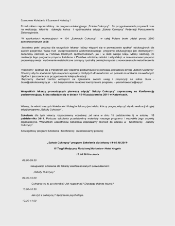 Szanowne Koleżanki i Szanowni Koledzy ! Przed rokiem zapraszaliśmy do program edukacyjnego „Szkoła Cukrzycy”. Po przygotowaniach przyszedł czas na realizację. Właśnie dobiegła końca I ogólnopolska edycja „Szkoły Cukrzycy” Federacji Porozumienie Zielonogórskie. W spotkaniach edukacyjnych w 104 „Szkołach Cukrzycy” zainteresowanych osób. w całej Polsce brało udział ponad 2500 Jesteśmy pełni podziwu dla wszystkich lekarzy, którzy włączyli się w prowadzenie spotkań edukacyjnych dla swoich pacjentów. Wasz trud przeprowadzenia wielomiesięcznego programu edukacyjnego jest dostrzegany i doceniany zarówno w Państwa lokalnych społecznościach, jak i w skali całego kraju. Mamy nadzieję, że realizacja tego programu przynosi każdemu z Państwa odrobinę radości i satysfakcji, a zainteresowani pacjenci poprawiają swoje wyrównanie metaboliczne cukrzycy i potrafią pełniej korzystać z nowoczesnych metod leczenia . Pragniemy spotkać się z Państwem aby wspólnie podsumować tę pierwszą, pilotażową edycję „Szkoły Cukrzycy” Chcemy aby to spotkanie było miejscem wymiany zdobytych doświadczeń, co pozwoli na unikanie zauważonych błędów i jeszcze lepsze przygotowanie kolejnych edycji . Będziemy również bardzo wdzięczni za zgłaszanie swoich uwag i propozycji na adres biura [email protected] - lub bezpośrednio na adres koordynatora programu – [email protected] Wszystkich lekarzy prowadzących pierwszą edycję” Szkoły Cukrzycy” zapraszamy na Konferencję podsumowującą, która odbędzie się w dniach 15-16 października 2011 w Katowicach. Wiemy, że wśród naszych Koleżanek i Kolegów lekarzy jest wielu, którzy pragną włączyć się do realizacji drugiej edycji programu „Szkoły Cukrzycy” . Szkolenie dla tych lekarzy rozpoczniemy wcześniej ,od rana w dniu 15 października tj. w sobotę 15 października 2011. Podczas szkolenia przedstawimy materiały naszego programu i wszystkie jego aspekty organizacyjne. Wszystkich uczestników Szkolenia zapraszamy również do udziału w Konferencji „Szkoły Cukrzycy”. Szczegółowy program Szkolenia i Konferencji przedstawiamy poniżej: „Szkoła Cukrzycy” program Szkolenia dla lekarzy 14-16.10.2011III Targi Medycyny Rodzinnej Katowice- Hotel Angelo 15.10.2011-sobota 09.00-09.30 Inauguracja szkolenia dla lekarzy zainteresowanych prowadzeniem „Szkoły Cukrzycy” 09.30-10.00 Cukrzyca-co to za choroba? Jak rozpoznać? Dlaczego dobrze leczyć? 10.00-10.30 Jak żyć z cukrzycą ? Spojrzenie psychologa. 10.30-11.00 Samokontrola - cele i zasady. Rola wysiłku fizycznego 11.00-11.40 Żywienie w cukrzycy – prawda i mity 11.40- 12.00- dyskusja i przerwa na kawę 12.00- 12.30 Leczenie cukrzycy – dla kogo leki doustne? 12.30-13.00 Leczenie cukrzycy – dlaczego insulina? 13.00-13.30 Ostre powikłania cukrzycy - hipoglikemia, kwasica cukrzycowa - jak ich unikać? 13.30- 14.15 obiad 14.15-15.0 Retinopatia, nefropatia, neuropatia – łatwiej zapobiegać niż leczyć. Stopa cukrzycowa. 15.00- 15.30 Zawał serca, udar mózgu – czy to też powikłania cukrzycy? Zespół metaboliczny. 15.30- 16.00- Informacje organizacyjne, dyskusja, pytania i przerwa na kawę 16.00- 16.30 - Uroczyste otwarcie Konferencji „Szkoła Cukrzycy” 16.30- 17.00 „Szkoła Cukrzycy” podsumowanie I edycji 17.00- 17.45 „Co działa a co nie działa w zakresie współpracy lekarz rodzinny - specjalista diabetolog” 17.45- 18.30 Insulinoterapia wdrażana i prowadzona przez lekarza rodzinnego-u kogo, w jakim zakresie. 18.30- 19.15 Jak leczyć nadciśnienie tętnicze i chorobę wieńcową u osoby z cukrzycą 19.15-19.30- dyskusja 20.00 - Kolacja „Szkoły Cukrzycy” 16.10.2011- niedziela 9.00- 9.30 Osobista pompa insulinowa i system ciągłego monitorowania glikemii. Czy dla każdego ? 9.30- 10.00 Nowe leki w terapii cukrzycy. 10.00- 10.30 Monitorowanie wyrównania metabolicznego cukrzycy w praktyce lekarza rodzinnego. 10.30-11.00 Podsumowanie konferencji. Uprzejmie prosimy o zgłaszanie gotowości uczestniczenia w Szkoleniu lub Konferencji do biur swoich związków wojewódzkich lub bezpośrednio do biura Federacji Porozumienie Zielonogórskie. ( [email protected] ) Dla usprawnienia organizacji prosimy o zastosowanie tabeli podanej w załączniku. Andrzej Paciorkowski Wojciech Pacholicki Koordynator Programu Cukrzycy” V-ce Prezes Federacji PZ [email protected] Jacek Krajewski Prezes Federacji PZ „Szkoła