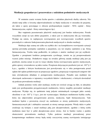 Mediacje gospodarcze i pracownicze z udziałem podmiotów medycznych W ostatnim czasie wzrasta liczba sporów z udziałem placówek służby zdrowia. Nie chodzi tutaj tylko o kwestię odpowiedzialności za błędy medyczne w stosunku do pacjenta, ale także o spory powstające w obrocie profesjonalnym (szpital - NFZ; szpital - firmy farmaceutyczne, szpital - firmy outsorcingowe itp.) Bez wątpienia pozostawanie placówki medycznej jest bardzo niekorzystne. Przede wszystkim cierpi na tym dobro pacjentów, a także jest to niekorzystne dla jej wizerunku. Wydaje się zatem, że najlepszym rozwiązaniem jest rozwiązywanie wszelkich sporów powstałych w zakresie funkcjonowania placówek medycznych w drodze mediacji. Mediacja daje szansę nie tylko na szybkie ale i na kompleksowe rozwiązanie sytuacji spornej powstałej pomiędzy szpitalem a pacjentem, czy też między szpitalem a np. firmą farmaceutyczną. Trzeba tutaj podkreślić, że jednym z atutów mediacji jest jej szybkość. Zgodnie z przepisami kodeksu postępowania cywilnego, termin na jej przeprowadzenie wynosi jeden miesiąc. Dodatkowo mając na uwadze główną zasadę mediacji jaką jest jej poufność, można uznać że jest to wręcz idealna forma rozwiązywania sporów medycznych, gdzie sprawy wizerunkowe są takie ważne. Przepisem dotyczącym poufności jest art. 1834 § 2 k.p.c., zgodnie z którym bezskuteczne jest powoływanie się w toku postępowania przed sądem lub sądem polubownym na propozycje ugodowe, propozycje wzajemnych ustępstw lub inne oświadczenia składane w postępowaniu mediacyjnym. Ponadto sam mediator ma obowiązek zachowania w tajemnicy wszystkich faktów i okoliczności, o których dowiedział się podczas prowadzenia mediacji. Jednak pomimo wielu zalet mediacji, trzeba też zwrócić uwagę na fakt, że aktualnie mało jest profesjonalnie przygotowanych mediatorów, którzy mogliby prowadzić mediacje medyczne. Wydaje się, że spełnienie tutaj jedynie minimalnych wymagań jakie zostały określone w art. 1832 § 1 k.p.c. jest nie wystarczające. Idealnym mediatorem byłaby osoba, która ma odpowiednie przygotowanie prawne, medyczne, bądź farmaceutyczne. Taki mediator będzie z pewnością cieszył się zaufaniem ze strony podmiotów medycznych, farmaceutycznych jak i zdobędzie szacunek ze strony samego pacjenta. Wtedy także w pełni zrealizuje się kolejna z zasad mediacji jaką jest akceptowalność, zgodnie z którą osoba mediatora musi być w pełni akceptowana przez strony. Jest to bardzo ważne z punktu skuteczności prowadzenia mediacji. Tylko podczas mediacji prowadzonej przez kompetentnego mediatora strony będą miały rzeczywistą szansę rozwiązania istniejącego między nimi sporu. Mając na uwadze skomplikowaną problematykę jak i terminologię stosowaną w sferze obrotu medycznego, wydaje się że idealną osobą do rozwiązywania tego typu sporów będzie mediator o wskazanych wyżej cechach. Tylko taka osoba będzie mogła w pełni profesjonalnie przeprowadzić mediacje w sektorze medycznym. W związku z powyższym należy popierać profesjonalizację i specjalizacje mediatorów. Również ośrodki mediacyjne skupiające zawodowych mediatorów powinny specjalizować się w prowadzeniu mediacji w określonym sektorze, w omawianym przypadku - w sektorze medycznym. Bez odpowiedniej wiedzy z zakresu funkcjonowania służby zdrowia, koncernów farmaceutycznych czy też aptek nie jest możliwe prowadzenie przez mediatora mediacji w sposób fachowy. Można nawet przypuszczać, że większość poruszanych przez strony sporu zagadnień właściwych dla branży medycznej, może być przez mediatora nie znającego określonej tematyki, wręcz niezrozumiała. Ponadto mediator powinien posiadać odpowiednią wiedzę z zakresu prawa, gdyż nie każde rozwiązanie proponowane przez strony może spotkać się z aprobatą sądu, który będzie zatwierdzał ugodę zawartą przed mediatorem. Należy mieć tutaj na uwadze, że zgodnie z art. 18314 sąd odmówi nadania klauzuli wykonalności albo zatwierdzenia ugody zawartej przed mediatorem, w całości lub w części, jeżeli ugoda jest sprzeczna z prawem lub zasadami współżycia społecznego albo zmierza do obejścia prawa, a także gdy jest niezrozumiała lub zawiera sprzeczności. Należy podkreślić tutaj, że ugoda zawierana w drodze mediacji powinna bardzo precyzyjnie określać wzajemne zobowiązania stron. Przede wszystkim, w przypadku mediacji dotyczących obrotu farmaceutycznego, wysoce precyzyjnie powinny zostać ujmowane kwestie związane z transportem leków, ich przechowywaniem czy też przyjmowaniem ewentualnych zwrotów. Jeśli chodzi o pozostawania postanowień ugody w zgodzie z przepisami prawa to należy mieć tutaj głównie na uwadze Ustawę z dnia 6 września 2001r. Prawo farmaceutyczne. (Dz. U. z 2001r. Nr 126, poz. 1381). Poza omówioną wyżej sferą mediacji prowadzonej pomiędzy podmiotami z branży medycznej (obrót profesjolany), warto zauważyć że mediacja jest także doskonałą metodą rozwiązywania sporów pracowniczych powstających w samej organizacji. Tutaj również wysoko wykwalifikowany mediator będzie potrafił pomóc stronom w znalezieniu odpowiedniej opcji rozwiązania powstałego konfliktu w drodze ugody, dzięki czemu nie będzie konieczne prowadzenie skomplikowanego i długotrwałego procesu sądowego.