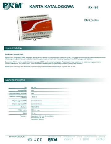 R KARTA KATALOGOWA PX 165 DMX Splitter Opis produktu Rozdzielacz sygnału DMX. Splitter, czyli rozdzielacz DMX, umożliwia tworzenie rozgałęzień w rozbudowanych instalacjach DMX. Ponieważ przy dużej ilości odbiorników połączenie ich szeregowo w jeden łańcuch może być kłopotliwe, przewidziano możliwość tworzenia rozgałęzień toru DMX przy pomocy splittera. Za pomocą PX165 można rozdzielić wejściowy sygnał DMX na 6 niezależnych gałęzi. Poszczególne tory wyjściowe są separowane galwanicznie zarówno od wejścia, jak i między sobą, oraz odpowiednio wzmacniane, co gwarantuje poprawną pracę całej instalacji. Splitter produkowany jest w obudowie przystosowanej do montażu na standardowych szynach DIN 35 mm. Dane techniczne Typ PX 165 Kanały DMX 512 Optyczna izolacja linii DMX TAK Napięcie przebicia izolacji WE/WY >1000 V Wejście sygnału DMX Zaciski śrubowe Wyjścia sygnału DMX Zaciski śrubowe Zasilanie Pobór prądu Masa Wymiary: Ver: PX165_D_pl_2-2 12-24V DC 500 mA max. 0,2 kg Szerokość: 105 mm (6 modułów) Wysokoość: 86 mm Głębokość: 60 mm Konsole teatralne i estradowE Cyfrowe ściemniacze mocy ul. Przemysłowa 12 30-701 Kraków SYSTEM dmx Sterowniki ARCHITEKTONICZNE tel: 12 626 46 92 fax: 12 626 46 94 OŚWIETLENIE LED e-mail: [email protected] http://www.pxm.pl R PX 165 Schemat podłączenia linia DMX 12-24V DC + + + – – – GND GND kolejne urządzenia www.pxm.pl GND GND GND GND GND GND sterownik DMX DMX splitter PX165 DMX terminator (ostatnie urządzenie) Rysunek techniczny Moduł produkowany jest w obudowie przystosowanej do montażu na szynach DIN 35 mm. 46 mm 86 mm GND GND GND GND GND GND www.pxm.pl + + + – – – GND GND 12-24V DC 105mm 60 mm Konsole teatralne i estradowE Cyfrowe ściemniacze mocy ul. Przemysłowa 12 30-701 Kraków SYSTEM dmx Sterowniki ARCHITEKTONICZNE tel: 12 626 46 92 fax: 12 626 46 94 OŚWIETLENIE LED e-mail: [email protected] http://www.pxm.pl