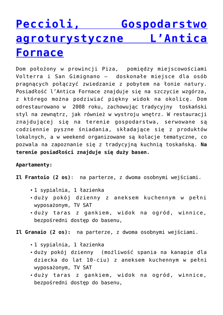 Peccioli, Gospodarstwo agroturystyczne L’Antica Fornace Dom położony w prowincji Piza, pomiędzy miejscowościami Volterra i San Gimignano – doskonałe miejsce dla osób pragnących połączyć zwiedzanie z pobytem na łonie natury. Posiadłość l’Antica Fornace znajduje się na szczycie wzgórza, z którego można podziwiać piękny widok na okolicę. Dom odrestaurowano w 2008 roku, zachowując tradycyjny toskański styl na zewnątrz, jak również w wystroju wnętrz. W restauracji znajdującej się na terenie gospodarstwa, serwowane są codziennie pyszne śniadania, składające się z produktów lokalnych, a w weekend organizowane są kolacje tematyczne, co pozwala na zapoznanie się z tradycyjną kuchnią toskańską. Na terenie posiadłości znajduje się duży basen. Apartamenty: Il Frantoio (2 os): na parterze, z dwoma osobnymi wejściami. 1 sypialnia, 1 łazienka duży pokój dzienny z aneksem kuchennym w pełni wyposażonym, TV SAT duży taras z gankiem, widok na ogród, winnice, bezpośredni dostęp do basenu, Il Granaio (2 os): na parterze, z dwoma osobnymi wejściami. 1 sypialnia, 1 łazienka duży pokój dzienny (możliwość spania na kanapie dla dziecka do lat 10-ciu) z aneksem kuchennym w pełni wyposażonym, TV SAT duży taras z gankiem, widok na ogród, winnice, bezpośredni dostęp do basenu, Le Rose (2 os): bez kuchni 1 sypialnia, 1 łazienka, taras La Limonaia (2+1 os): na parterze 1 sypialnia, 1 łazienka duży pokój dzienny (możliwość dodatkowego spania na kanapie dla jednej osoby) aneks kuchenny w pełni wyposażony taras z meblami wiklinowymi, bezpośredni dostęp do basenu Il Vigneto ( 2+1 os): na parterze, z dwoma wejściami 1 sypialnia, 1 łazienka aneks kuchenny w pełni wyposażony pokój dzienny z kanapą (możliwość spania na kanapie dla dziecka do lat 10-ciu) duży taras, ganek z wiklinowymi krzesłami, bezpośredni dostęp do basenu La Fornance (4+1 os): widok z okien na pierwszym piętrze, panoramiczny 2 sypialnie, 1 łazienka duży pokój dzienny (rozkładana kanapa dla jednej osoby) z aneksem kuchennym w pełni wyposażonym, TV SAT mały taras z widokiem na okolicę Il Girasole (4+2 os): znajduje się na pierwszym piętrze i jest największy 2 sypialnie z niedużymi tarasami, 2 łazienk pokój dzienny (rozkładana kanapa dla 2 osób) z aneksem kuchennym, TV SAT Pobyt tygodniowy 07/01-17/04 22/04-16/05 27/09-23/12 17/05-04/07 23/08-26/09 Pobyt dwu tygodniowy 18/04-21/04 07/01-17/04 05/07-22/08 22/04-16/05 24/12-31/12 27/09-23/12 17/05-04/07 23/08-26/09 18/04-21/04 05/07-22/08 24/12-31/12 Il Frantoio (2 os) Il Granaio (2 os) 2500 3400 4750 4450 5250 8500 2750 3500 4950 4500 5500 9000 2250 2850 3750 4500 4500 7500 2950 3750 5250 4750 5750 9250 3000 4000 5500 4750 6000 9750 3250 4250 6250 5000 7000 11250 3450 4500 6750 5500 7450 11450 Le Rose Bedroom (2 os) La Limonaia (2+1 os) Il Vigneto ( 2+1 os) La Fornance (4+1os) Il Girasole (5+1 os) Cena w PLN obejmuje: pobyt tygodniowy lub 2 tygodniowy, śniadanie, opłatę za wodę, gaz i prąd, korzystanie z basenu, ręczniki przy basenie, ręczniki w łazience, zmiana pościeli raz w tygodniu, basen Cena nie obejmuje: sprzątania końcowego, korzystania z sejfu, klimatyzacji 15 Euro/dzień