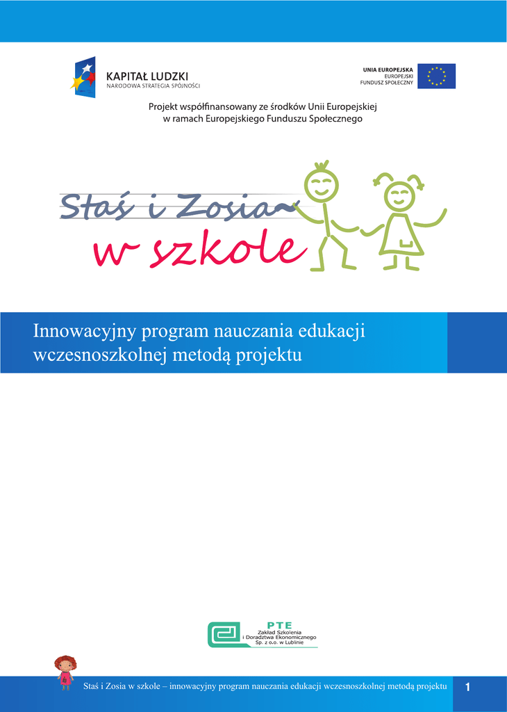 Staś i Zosia w szkole – innowacyjny program nauczania edukacji wczesnoszkolnej metodą projektu 1 AUTORZY – EKSPERCI Marta Wróblewska - Specjalista ds. Przyrody/Ekologii Milena Potręć - Specjalista ds. Przedsiębiorczości Katarzyna Machałowska - Specjalista ds. Przedsiębiorczości Ewa Gałczyńska - Specjalista ds. Technologii Informacyjno-Komunikacyjnych Anna Gołąb - Nauczyciel Edukacji Wczesnoszkolnej Danuta Chrzanowska - Doradca Metodyczny Kamila Małyszko - Nauczyciel Edukacji Wczesnoszkolnej Anna Natora - Doradca Metodyczny Tomasz Małyszko - Specjalista ds. Technologii Informacyjno-Komunikacyjnych Małgorzata Kępa - Nauczyciel Edukacji Wczesnoszkolnej Aldona Ryszkowska-Tatara - Specjalista ds. Przedsiębiorczości Kinga Sarad-Deć - Pedagog Agnieszka Tokarska - Nauczyciel Edukacji Wczesnoszkolnej Michał Adam Roman - Specjalista ds. Technologii Informacyjno-Komunikacyjnych Anna Jarczak - Psycholog Iwona Blicharz - Pedagog Monika Grzesiak-Chmura - Specjalista ds. Przedsiębiorczości Dorota Pyrgies - Psycholog Aleksandra Kata - Psycholog Dariusz Głuchowski - Specjalista ds. Technologii Informacyjno-Komunikacyjnych Maria Kęska - Specjalista ds. Matematyki Małgorzata Wieleba - Specjalista ds. Matematyki Anna Ryszkowska - Specjalista ds. Matematyki Marta Pietrow - Specjalista ds. Matematyki Bożena Jankowska - Doradca Metodyczny Marzena Szulecka - Specjalista ds. Przyrody/Ekologii Agnieszka Hankiewicz - Specjalista ds. Przyrody/Ekologii Bożena Danuta Gaj-Demczuk - Doradca Metodyczny Danuta Sałęga - Psycholog Katarzyna Kozłowska - Pedagog Anna Grabka - Specjalista ds. Przyrody/Ekologii REDAKTOR: Małgorzata Orzeł, Anna Natora, Danuta Chrzanowska Korekta językowa: Tadeusz Moraczewski ISBN: 978-83-936017-2-1 Wydawnictwo: Polskie Towarzystwo Ekonomiczne Zakład Szkolenia i Doradztwa Ekonomicznego Sp. z o.o. w Lublinie Wydruk: MV Monika Łyżwa, Lublin, ul. Strzembosza 3/3 Projekt okładki i skład: Tomasz Butkiewicz Opracowanie graficzne: Tomasz Butkiewicz, Karolina Kowalewska, Maciej Pałka 2 Staś i Zosia w szkole – innowacyjny program nauczania edukacji wczesnoszkolnej metodą projektu ZAWARTOŚĆ 1. Wstęp .................................................................................................................... 4 2. Cele ogólne ........................................................................................................... 5 3. Cele szczegółowe ................................................................................................. 6 4. Treści programowe ............................................................................................... 17 5. Metody i sposoby osiągania celów ....................................................................... 58 6. Diagnoza ............................................................................................................... 64 7. Propozycja oceniania osiągnięć uczniów ............................................................. 71 8. Opinia ................................................................................................................... 73 9. Bibliografia............................................................................................................ 75 Staś i Zosia w szkole – innowacyjny program nauczania edukacji wczesnoszkolnej metodą projektu 3 1. WSTĘP Szanowni Państwo! „Słyszę, zapominam. Widzę, zapamiętuję. Robię sam, rozumiem” – to maksyma naszego programu, która koresponduje z naturalnym rozwojem osobowości dziecka. Poza realizowaniem treści ujętych w podstawie programowej program ukierunkowany jest na kształtowanie umiejętności myślenia matematycznego, naukowego oraz rozwijanie postawy przedsiębiorczej. Opracowany innowacyjny program nauczania edukacji wczesnoszkolnej metodą projektu jest zgodny ze zmienioną podstawą programową kształcenia ogólnego dla szkół podstawowych obowiązującą od 1 września 2014 r. Projekt „Staś i Zosia w szkole – innowacyjny program nauczania edukacji wczesnoszkolnej metodą projektu” jest współfinansowany ze środków Unii Europejskiej w ramach poddziałania 3.3.4 Modernizacja treści i metod kształcenia projekty konkursowe Europejskiego Funduszu Społecznego, na podstawie umowy z Ośrodkiem Rozwoju Edukacji w Warszawie. Niniejszy program implementuje twierdzenie, iż dziecko powinno być aktywne w działaniu i współżyciu, wypełniać różne zadania, tworzyć, eksperymentować i doświadczać. Realizacja założeń programu zaowocuje pojawieniem się pytań i wątpliwości, które dziecko będzie w stanie samodzielnie rozwiązywać. Nasz program w sposób szczególny akcentuje treści związane z ekologią, ekonomią i przedsiębiorczością. Program „Staś i Zosia w szkole” to skuteczna, przyjazna i nowoczesna publikacja wspomagająca edukację wczesnoszkolną dziecka, ze szczególnym uwzględnieniem potrzeb dziecka 6-letniego. Niniejsze opracowanie nie odrzuca i nie neguje sprawdzonych metod nauczania. Proponuje dodatkowo innowacyjne podejście do edukacji z uwzględnieniem elementów przedsiębiorczości, ekonomii, ekologii, rozwoju społecznego i techniki. Nowoczesne kształcenie powinno dążyć do podejmowania różnorodnych działań, stwarzając jednocześnie poczucie bezpieczeństwa, spokoju, życzliwości i zaufania. Program „Staś i Zosia w szkole” wskazuje nauczycielowi, w jaki sposób powinien dążyć do zapewnienia każdemu dziecku optymalnych warunków uczenia się. Ważną rolę w procesie edukacji wczesnoszkolnej metodą projektu pełni nauczyciel, który poprzez niekonwencjonalne metody wprowadza dzieci w świat pojęć społecznych, przyrodniczych i technicznych. Pozwala im doświadczać i przeżywać rzeczywistość wykorzystując dziecięcą ciekawość i fascynację otaczającym światem. W załączonych do programu materiałach dydaktycznych umieszczono propozycje zajęć prowadzonych metodą projektu. Projekt możn