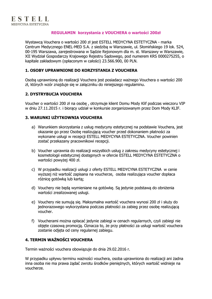 REGULAMIN korzystania z VOUCHERA o wartości 200zł Wystawcą Vouchera o wartości 200 zł jest ESTELL MEDYCYNA ESTETYCZNA - marka Centrum Medycznego ENEL-MED S.A. z siedzibą w Warszawie, ul. Słomińskiego 19 lok. 524, 00-195 Warszawa, zarejestrowana w Sądzie Rejonowym dla m. st. Warszawy w Warszawie, XII Wydział Gospodarczy Krajowego Rejestru Sądowego, pod numerem KRS 0000275255, o kapitale zakładowym (opłaconym w całości) 23.566.900, 00 PLN. 1. OSOBY UPRAWNIONE DO KORZYSTANIA Z VOUCHERA Osobą uprawnioną do realizacji Vouchera jest posiadacz ważnego Vouchera o wartości 200 zł, których wzór znajduje się w załączniku do niniejszego regulaminu. 2. DYSTRYBUCJA VOUCHERA Voucher o wartości 200 zł na osobę , otrzymuje klient Domu Mody Klif podczas wieczoru VIP w dniu 27.11.2015 r. i biorący udział w konkursie zorganizowanym przez Dom Mody KLIF. 3. WARUNKI UŻYTKOWNIA VOUCHERA a) Warunkiem skorzystania z usług medycyny estetycznej na podstawie Vouchera, jest okazanie go przez Osobę realizującą voucher przed dokonaniem płatności za wykonane usługi w recepcji ESTELL MEDYCYNA ESTETYCZNA. Voucher powinien zostać przekazany pracownikowi recepcji. b) Voucher uprawnia do realizacji wszystkich usług z zakresu medycyny estetycznej i kosmetologii estetycznej dostępnych w ofercie ESTELL MEDYCYNA ESTETYCZNA o wartości powyżej 400 zł. c) W przypadku realizacji usługi z oferty ESTELL MEDYCYNA ESTETYCZNA w cenie wyższej niż wartość zapisana na voucherze, osoba realizująca voucher dopłaca różnicę gotówką lub kartą; d) Vouchery nie będą wymieniane na gotówkę. Są jedynie podstawą do obniżenia wartości zrealizowanej usługi. e) Vouchery nie sumują się. Maksymalna wartość vouchera wynosi 200 zł i służy do jednorazowego wykorzystana podczas płatności za zabieg przez osobę realizującą voucher. f) Voucherami można opłacać jedynie zabiegi w cenach regularnych, czyli zabiegi nie objęte czasową promocją. Oznacza to, że przy płatności za usługi wartość vouchera zostanie odjęta od ceny regularnej zabiegu. 4. TERMIN WAŻNOŚCI VOUCHERA Termin ważności vouchera obowiązuje do dnia 29.02.2016 r. W przypadku upływu terminu ważności vouchera, osoba uprawniona do realizacji ani żadna inna osoba nie ma prawa żądać zwrotu środków pieniężnych, których wartość widnieje na voucherze. 5. POSTANOWIENIA KOŃCOWE a) Regulamin obowiązuje od dnia opublikowania. b) Vouchery nie będą łączone z innymi zniżkami oferowanymi przez Organizatora w okresie trwania Akcji oraz innymi zniżkami, jakie posiada pacjent. Pacjent będzie miał prawo dokonać wyboru z której zniżki lub promocji korzysta przy wykupie określonych usług. c) Organizator zastrzega sobie prawo wprowadzenia zmian w regulaminie. d) Niniejszy regulamin podany jest na stronie www.estell.pl oraz dostępny w recepcji Kliniki ESTELL ZAŁĄCZNIK DO REGULAMINU - Wzór Vouchera