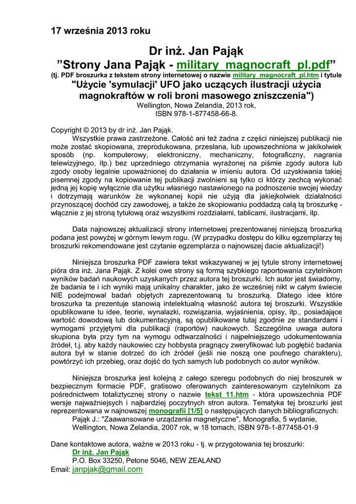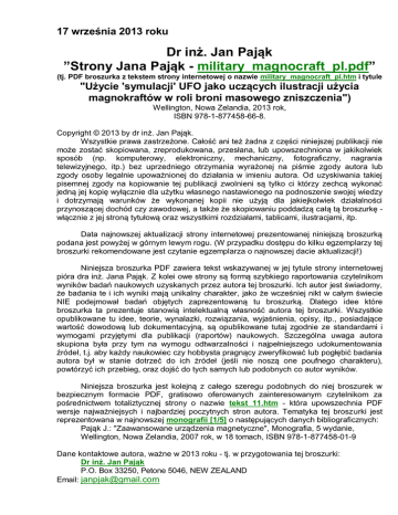 17 września 2013 roku Dr inż. Jan Pająk ”Strony Jana Pająk - military_magnocraft_pl.pdf” (tj. PDF broszurka z tekstem strony internetowej o nazwie military_magnocraft_pl.htm i tytule "Użycie 'symulacji' UFO jako uczących ilustracji użycia magnokraftów w roli broni masowego zniszczenia") Wellington, Nowa Zelandia, 2013 rok, ISBN 978-1-877458-66-8. Copyright © 2013 by dr inż. Jan Pająk. Wszystkie prawa zastrzeżone. Całość ani też żadna z części niniejszej publikacji nie może zostać skopiowana, zreprodukowana, przesłana, lub upowszechniona w jakikolwiek sposób (np. komputerowy, elektroniczny, mechaniczny, fotograficzny, nagrania telewizyjnego, itp.) bez uprzedniego otrzymania wyrażonej na piśmie zgody autora lub zgody osoby legalnie upoważnionej do działania w imieniu autora. Od uzyskiwania takiej pisemnej zgody na kopiowanie tej publikacji zwolnieni są tylko ci którzy zechcą wykonać jedną jej kopię wyłącznie dla użytku własnego nastawionego na podnoszenie swojej wiedzy i dotrzymają warunków że wykonanej kopii nie użyją dla jakiejkolwiek działalności przynoszącej dochód czy zawodowej, a także że skopiowaniu poddadzą całą tą broszurkę włącznie z jej stroną tytułową oraz wszystkimi rozdziałami, tablicami, ilustracjami, itp. Data najnowszej aktualizacji strony internetowej prezentowanej niniejszą broszurką podana jest powyżej w górnym lewym rogu. (W przypadku dostępu do kilku egzemplarzy tej broszurki rekomendowane jest czytanie egzemplarza o najnowszej dacie aktualizacji!) Niniejsza broszurka PDF zawiera tekst wskazywanej w jej tytule strony internetowej pióra dra inż. Jana Pająk. Z kolei owe strony są formą szybkiego raportowania czytelnikom wyników badań naukowych uzyskanych przez autora tej broszurki. Ich autor jest świadomy, że badania te i ich wyniki mają unikalny charakter, jako że wcześniej nikt w całym świecie NIE podejmował badań objętych zaprezentowaną tu broszurką. Dlatego idee które broszurka ta prezentuje stanowią intelektualną własność autora tej broszurki. Wszystkie opublikowane tu idee, teorie, wynalazki, rozwiązania, wyjaśnienia, opisy, itp., posiadające wartość dowodową lub dokumentacyjną, są opublikowane tutaj zgodnie ze standardami i wymogami przyjętymi dla publikacji (raportów) naukowych. Szczególna uwaga autora skupiona była przy tym na wymogu odtwarzalności i najpełniejszego udokumentowania źródeł, t.j. aby każdy naukowiec czy hobbysta pragnący zweryfikować lub pogłębić badania autora był w stanie dotrzeć do ich źródeł (jeśli nie noszą one poufnego charakteru), powtórzyć ich przebieg, oraz dojść do tych samych lub podobnych co autor wyników. Niniejsza broszurka jest kolejną z całego szeregu podobnych do niej broszurek w bezpiecznym formacie PDF, gratisowo oferowanych zainteresowanym czytelnikom za pośrednictwem totaliztycznej strony o nazwie tekst_11.htm - która upowszechnia PDF wersje najważniejsych i najbardziej poczytnych stron autora. Tematyka tej broszurki jest reprezentowana w najnowszej monografii [1/5] o następujących danych bibliograficznych: Pająk J.: "Zaawansowane urządzenia magnetyczne", Monografia, 5 wydanie, Wellington, Nowa Zelandia, 2007 rok, w 18 tomach, ISBN 978-1-877458-01-9 Dane kontaktowe autora, ważne w 2013 roku - tj. w przygotowania tej broszurki: Dr inż. Jan Pająk P.O. Box 33250, Petone 5046, NEW ZEALAND Email: [email protected] Każde urządzenie jakie zbudowane zostaje dla pokojowego użycia, przez moralnie niedojrzałych ludzi może zostać też nadużyte dla zasiewania zniszczenia i śmierci. Jako przykład rozważ samolot, który pokojowo służy zbliżeniu pomiędzy ludźmi oraz poznawaniu się nawzajem. Jednocześnie jednak może on zrzucać bomby atomowe, podpalać budynki WTC, lub strzelać do przechodniów na Ziemi. Istnieje jeden rodzaj ogromnie zaawansowanego statku kosmicznego (mojego wynalazku), jakiego wersja czekająca na bliskie już zbudowanie na Ziemi nazywana jest magnokraftem. Ów statek pokojowo może wynieść ludzkość do gwiazd, oraz umożliwić kontakty naszej cywilizacji z innymi rejonami wszechświata. Jeśli jednak znajdzie się on w rękach moralnie zdegenerowanych istot, np. dzisiejszych niedoskonałych ludzi postawionych w sytuacji opisanej na stronie o nazwie evil_pl.htm, wówczas ów gwiazdolot jest też w stanie dokonać ogromnych zniszczeń. Aby więc zilustrować i dać poznać ludziom, do czego może prowadzić zbudowanie mojego "magnokraftu" kiedy ludzkość NIE osiągnęła jeszcze wymaganego 2 poziomu "moralności", Bóg realistycznie "symuluje" na Ziemi sytuację, jakby "magnokraft" juz został zbudowany przez jakąś identyczną do ludzi cywilizację naszych krewniaków kosmicznych o szatańskiej filozofii życiowej. Ogromnie istotne powody dla których owa "symulacja" jest dla nas realizowana, wyjaśnione zostały dokładniej w punktach #L1 do #L5 strony o nazwie magnocraft_pl.htm. Owa wroga nam cywilizacja krewniaków jest tak "symulowana" jakby postawiła sobie ona za cel skrycie zniszczyć obecne zaawansowanie techniczne ludzkości. W celu owego skrytego niszczania zaawansowania ludzi, używa ona właśnie ciągle nam nieznanych morderczych zdolności ich wersji magnokraftu (tj. UFO). Faktycznie też, to właśnie ów ichni statek międzygwiezdny (tj. UFO), oraz jego diabliczni właściciele, są tak "symulowani", jakby zagrażali nam teraz kompletnym wyniszczeniem ludzkości. Skrycie wyniszczające i eksploatujące ludzi "symulacje" ichnich magnokraftów, są znane pod popularną nazywą UFO, lub wehikułów UFO. Najwyższy więc czas abyśmy zaczęli być świadomi, że owo realistyczne 3 "symulowanie" nam UFO i UFOnautów przez Boga, ma zmobilizować nas do szukania metod skutecznej obrony. Z kolei poprzez szukanie tych metod obrony, ludzkość zrozumie poziom własnej "niemoralności" i, miejmy nadzieję, podniesie się sama na wyższy poziom moralny. Aby u