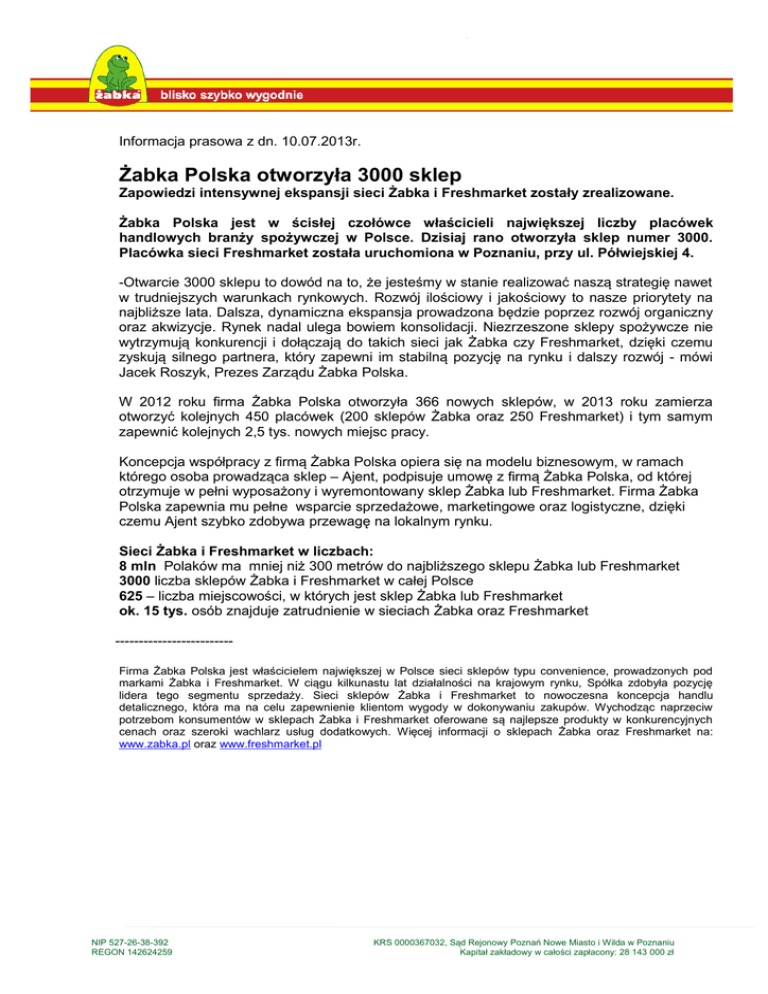 Żabka Polska sp. z o.o. 61-821 Poznań, ul. Ogrodowa 12, tel. +48 618 563 700, fax +48 618 525 313 Informacja prasowa z dn. 10.07.2013r. Żabka Polska otworzyła 3000 sklep Zapowiedzi intensywnej ekspansji sieci Żabka i Freshmarket zostały zrealizowane. Żabka Polska jest w ścisłej czołówce właścicieli największej liczby placówek handlowych branży spożywczej w Polsce. Dzisiaj rano otworzyła sklep numer 3000. Placówka sieci Freshmarket została uruchomiona w Poznaniu, przy ul. Półwiejskiej 4. -Otwarcie 3000 sklepu to dowód na to, że jesteśmy w stanie realizować naszą strategię nawet w trudniejszych warunkach rynkowych. Rozwój ilościowy i jakościowy to nasze priorytety na najbliższe lata. Dalsza, dynamiczna ekspansja prowadzona będzie poprzez rozwój organiczny oraz akwizycje. Rynek nadal ulega bowiem konsolidacji. Niezrzeszone sklepy spożywcze nie wytrzymują konkurencji i dołączają do takich sieci jak Żabka czy Freshmarket, dzięki czemu zyskują silnego partnera, który zapewni im stabilną pozycję na rynku i dalszy rozwój - mówi Jacek Roszyk, Prezes Zarządu Żabka Polska. W 2012 roku firma Żabka Polska otworzyła 366 nowych sklepów, w 2013 roku zamierza otworzyć kolejnych 450 placówek (200 sklepów Żabka oraz 250 Freshmarket) i tym samym zapewnić kolejnych 2,5 tys. nowych miejsc pracy. Koncepcja współpracy z firmą Żabka Polska opiera się na modelu biznesowym, w ramach którego osoba prowadząca sklep – Ajent, podpisuje umowę z firmą Żabka Polska, od której otrzymuje w pełni wyposażony i wyremontowany sklep Żabka lub Freshmarket. Firma Żabka Polska zapewnia mu pełne wsparcie sprzedażowe, marketingowe oraz logistyczne, dzięki czemu Ajent szybko zdobywa przewagę na lokalnym rynku. Sieci Żabka i Freshmarket w liczbach: 8 mln Polaków ma mniej niż 300 metrów do najbliższego sklepu Żabka lub Freshmarket 3000 liczba sklepów Żabka i Freshmarket w całej Polsce 625 – liczba miejscowości, w których jest sklep Żabka lub Freshmarket ok. 15 tys. osób znajduje zatrudnienie w sieciach Żabka oraz Freshmarket ------------------------Firma Żabka Polska jest właścicielem największej w Polsce sieci sklepów typu convenience, prowadzonych pod markami Żabka i Freshmarket. W ciągu kilkunastu lat działalności na krajowym rynku, Spółka zdobyła pozycję lidera tego segmentu sprzedaży. Sieci sklepów Żabka i Freshmarket to nowoczesna koncepcja handlu detalicznego, która ma na celu zapewnienie klientom wygody w dokonywaniu zakupów. Wychodząc naprzeciw potrzebom konsumentów w sklepach Żabka i Freshmarket oferowane są najlepsze produkty w konkurencyjnych cenach oraz szeroki wachlarz usług dodatkowych. Więcej informacji o sklepach Żabka oraz Freshmarket na: www.zabka.pl oraz www.freshmarket.pl NIP 527-26-38-392 REGON 142624259 KRS 0000367032, Sąd Rejonowy Poznań Nowe Miasto i Wilda w Poznaniu Kapitał zakładowy w całości zapłacony: 28 143 000 zł