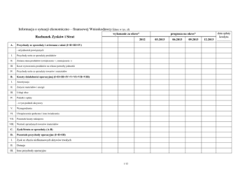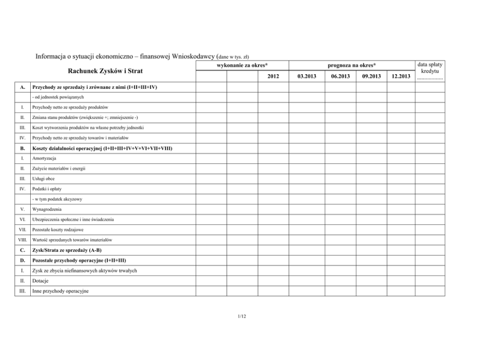 Informacja o sytuacji ekonomiczno – finansowej Wnioskodawcy (dane w tys. zł) wykonanie za okres* Rachunek Zysków i Strat A. 2012 Przychody ze sprzedaŜy i zrównane z nimi (I+II+III+IV) - od jednostek powiązanych I. Przychody netto ze sprzedaŜy produktów II. Zmiana stanu produktów (zwiększenie +; zmniejszenie -) III. Koszt wytworzenia produktów na własne potrzeby jednostki IV. Przychody netto ze sprzedaŜy towarów i materiałów B. Koszty działalności operacyjnej (I+II+III+IV+V+VI+VII+VIII) I. Amortyzacja II. ZuŜycie materiałów i energii III. Usługi obce IV. Podatki i opłaty - w tym podatek akcyzowy V. Wynagrodzenia VI. Ubezpieczenia społeczne i inne świadczenia VII. Pozostałe koszty rodzajowe VIII. Wartość sprzedanych towarów imateriałów C. Zysk/Strata ze sprzedaŜy (A-B) D. Pozostałe przychody operacyjne (I+II+III) I. Zysk ze zbycia niefinansowych aktywów trwałych II. Dotacje III. Inne przychody operacyjne 1/12 prognoza na okres* 03.2013 06.2013 09.2013 12.2013 data spłaty kredytu .................. E. Pozostałe koszty operacyjne (I+II+III) I. Strata ze zbycia niefinansowych aktywów trwałych II. Aktualizacja wartości aktywów niefinansowych III. Inne koszty operacyjne F. Zysk/Strata z działalności operacyjnej (C+D-E) G. Przychody finansowe (I+II+III+IV+V) I. Dywidendy i udziały w zyskach, w tym: - od jednostek powiązanych II. Odsetki, w tym: - od jednostek powiązanych III. Zysk ze zbycia inwestycji IV. Aktualizacja wartości inwestycji V. Inne H. Koszty finansowe (I+II+III+IV) I. Odsetki, w tym: - dla jednostek powiązanych II. Strata ze zbycia inwestycji III. Aktualizacja wartości inwestycji IV. Inne I. Zysk/Strata z działalności gosp. (F+G-H) J. Wynik zdarzeń nadzwyczajnych (I+II) I. Zyski nadzwyczajne II. Straty nadzwyczajne K. Zysk/Strata brutto (I+/-J) 2/12 L. Podatek dochodowy M. Pozostałe obowiązkowe zmniejszenia zysku (zwiększenia straty) N. Zysk/Strata netto (K-L-M) O. Wypłata właściciela (dywidenda) P. Zysk zatrzymany (N-O) */dane historyczne powinny obejmować ostatnie dwa pełne lata obrachunkowe oraz ostatni okres sprawozdawczy w roku bieŜącym, prognoza natomiast powinna obejmować co najmniej cały okres krerdytowania - przy kredytach udzielanych na okres jednego roku w układzie conajmniej kwartalnym, przy kredytach udzielanych na okres powyŜej jednego roku w okresach kwartalnych w pierwszym roku kredytowania, w kolejnych latach w układzie rocznym. W ostanim roku kredytowania prognoza powinna być sporządzona na okres do dnia ostatecznej spłaty kredytu. 3/12 wykonanie za okres* Bilans - Aktywa prognoza na okres* 2012 A. AKTYWA TRWAŁE (I+II+III+IV) I. Wartości Niematerialne i Prawne (1+2+3+4) 1. Koszty zakończonych prac rozwojowych 2. Wartość firmy 3. Inne wartości niematerialne i prawne 4. Zaliczki na wartości niematerialne i prawne II. Rzeczowe aktywa trwałe (1+2+3) 1. Środki trwałe a) grunty (w tym prawo uŜytkowania wieczystego gruntu) b) budynki, lokale i obiekty inŜynierii lądowej i wodnej c) urządzenia techniczne i maszyny d) środki transportu e) inne środki trwałe 2. Środki trwałe w budowie 3. Zaliczki na środki trwałe w budowie III. NaleŜności długoterminowe (1+2) 1. Od jednostek powiązanych 2. Od pozostałych jednostek IV. Inwestycje długoterminowe (1+2+3+4) 1. Nieruchomości 2. Wartości Niematerialne i Prawne 3. Długoterminowe aktywa finansowe 4/12 03.2013 06.2013 09.2013 12.2013 data spłaty kredytu .................. a) w jednostkach powiązanych - udziały lub akcje - inne papiery wartościowe - udzielone poŜyczki - inne długoterminowe aktywa finansowe b) w pozostałych jednostkach - udziały lub akcje - inne papiery wartościowe - udzielone poŜyczki - inne długoterminowe aktywa finansowe 4. Inne inwestycje długoterminowe V. Długoterminowe rozliczenia międzyokresowe (1+2) 1. Aktywa z tytułu odroczonego podatku dochodowego 2. Inne rozliczenia międzyokresowe B. AKTYWA OBROTOWE (I+II+III+IV) I. Zapasy (1+2+3+4+5) 1. Materiały 2. Półprodukty i produkty w toku 3. Produkty gotowe 4. Towary 5. Zaliczki na poczet dostaw II. NaleŜności krótkoterminowe (1+2) 1. NaleŜności od jednostek powiązanych a) z tytułu dostaw i usług, o okresie spłaty: - do 12 miesięcy 5/12 - powyŜej 12 miesięcy b) inne 2. NaleŜności od pozostałych jednostek a) z tytułu dostaw i usług, o okresie spłaty: - do 12 miesięcy - powyŜej 12 miesięcy b) z tytułu podatków, dotacji, ceł, ubezpieczeń społecznych i zdrowotnych oraz innych świadczeń c) inne d) dochodzone na drodze sądowej III. Inwestycje krótkoterminowe (1+2) 1. Krótkoterminowe aktywa finansowe a) w jednostkach powiązanych - udziały lub akcje - inne papiery wartościowe - udzielone poŜyczki - inne krótkoterminowe aktywa finansowe b) w pozostałych jednostkach - udziały lub akcje - inne papiery wartościowe - udzielone poŜyczki - inne krótkoterminowe aktywa finansowe c) środki pienięŜne i inne aktywa pienięŜne -środki pienięŜne w kasie i na rachunkach -inne środki pienięŜne -inne aktywa pienięŜne 6/12 2. Inne inwestycje krótkoterminowe IV. Krótkoterminowe rozliczenia międzyokresowe Suma aktywów (A+B+C) Bilans - Pasywa wykonanie za okres* prognoza na okres* 2012 A. KAPITAŁ (FUNDUSZ) WŁASNY (I-X) I. Kapitał ( fundusz ) podstawowy II. NaleŜne wpłaty na kapitał podstawowy (-) III. Udziały (akcje) własne (-) IV. Kapitał (fundusz) zapasowy V. Kapitał (fundusz) z aktualizacji wyceny VI. Pozostałe kapitały (fundusze) rezerwowe VII. Zysk (strata) z lat ubiegłych VIII. Zysk (strata) netto IX. Odpisy z zysku netto w ciągu roku obrotowego (-) X. Nie podzielony wynik finansowy z lat ubiegłych ZOBOWIĄZANIA I REZERWY NA B. ZOBOWIĄZANIA (I+II+III+IV) I. Rezerwy na zobowiązania (1+2+3) 1. Rezerwa z tytułu odroczonego podatku dochodowego 2. Rezerwa na świadczenie emerytalne i podobne - długoterminowa - krótkoterminowa 3. Pozostałe rezerwy 7/12 03.2013 06.2013 09.2013 12.2013 data spłaty kre