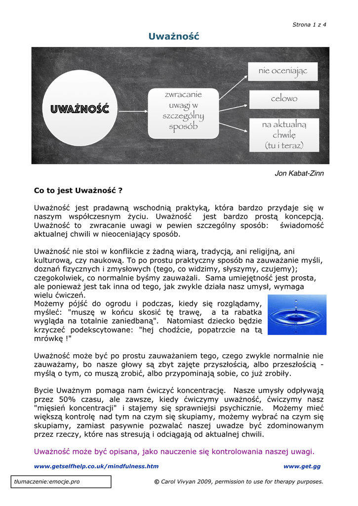 Strona 1 z 4 Uważność Jon Kabat-Zinn Co to jest Uważność ? Uważność jest pradawną wschodnią praktyką, która bardzo przydaje się w naszym współczesnym życiu. Uważność jest bardzo prostą koncepcją. Uważność to zwracanie uwagi w pewien szczególny sposób: świadomość aktualnej chwili w nieoceniający sposób. Uważność nie stoi w konflikcie z żadną wiarą, tradycją, ani religijną, ani kulturową, czy naukową. To po prostu praktyczny sposób na zauważanie myśli, doznań fizycznych i zmysłowych (tego, co widzimy, słyszymy, czujemy); czegokolwiek, co normalnie byśmy zauważali. Sama umiejętność jest prosta, ale ponieważ jest tak inna od tego, jak zwykle działa nasz umysł, wymaga wielu ćwiczeń. Możemy pójść do ogrodu i podczas, kiedy się rozglądamy, myśleć: "muszę w końcu skosić tę trawę, a ta rabatka wygląda na totalnie zaniedbaną". Natomiast dziecko będzie krzyczeć podekscytowane: "hej chodźcie, popatrzcie na tą mrówkę !" Uważność może być po prostu zauważaniem tego, czego zwykle normalnie nie zauważamy, bo nasze głowy są zbyt zajęte przyszłością, albo przeszłością myślą o tym, co muszą zrobić, albo przypominają sobie, co już zrobiły. Bycie Uważnym pomaga nam ćwiczyć koncentrację. Nasze umysły odpływają przez 50% czasu, ale zawsze, kiedy ćwiczymy uważność, ćwiczymy nasz "mięsień koncentracji" i stajemy się sprawniejsi psychicznie. Możemy mieć większą kontrolę nad tym na czym się skupiamy, możemy wybrać na czym się skupiamy, zamiast pasywnie pozwalać naszej uwadze być zdominowanym przez rzeczy, które nas stresują i odciągają od aktualnej chwili. Uważność może być opisana, jako nauczenie się kontrolowania naszej uwagi. www.getselfhelp.co.uk/mindfulness.htm tłumaczenie:emocje.pro www.get.gg © Carol Vivyan 2009, permission to use for therapy purposes. Strona 2 z 4 Automatyczny Pilot W samochodzie, jedziemy czasami przez całe kilometry na "automatycznym pilocie", nie zdając sobie naprawdę sprawy z tego co robimy. W ten sam sposób możemy być nieobecni, chwila-pochwili przez większość naszego życia: Często jesteśmy “daleko stąd” nie wiedząc o tym. Na automatycznym pilocie, jesteśmy bardziej podatni na “nadępnięcie na odcisk”: Zdarzenia wokół nas, myśli, emocje, doznania fizyczne (których możemy być tylko ledwo świadomi) wywołują stare nawyki, które często są niepomocne i mogą prowadzić do pogorszenia nastroju. Dzięki stawianiu się bardziej świadomymi naszych myśli, emocji i doznań cielesnych, z chwili na chwilę, dajemy sobie możliwość większej wolności i wyboru; nie musimy wpadać w te stare “psychiczne sidła” które powodowały problemy w przeszłości. Uważna Aktywność Jeśli zmywamy naczynia każdego wieczoru, pewnie robimy to automatycznie: myjemy myśląc o tym, co musimy zrobić, co robiliśmy wcześniej w ciągu dnia, martwimy się przyszłymi zdarzeniami, albo mamy myśli pełne żalu dotyczące przeszłości. Znowu, dziecko mogłoby widzieć to inaczej: "Spójrz na te bąbelki! Ale fajne!" Zmywanie, albo inna rutynowa czynność może stać się uważną aktywnością. Możemy zauważyć temperaturę wody, jak czujemy ją na skórze, fakturę bąbelków na naszych dłoniach,a nawet możemy usłyszeć, jak bąbelki delikatnie pękają. Dźwięki wody, kiedy wyciągamy, czy wkładamy naczynia do wody. Gładkość talerzy i fakturę gąbki. Po prostu zauważać i zwracać uwagę na to, na co zwykle tej uwagi nie zwracamy. Uważny spacer przynosi nowe doznania. Chodzenie jest czymś, co robi większość z nas. Możemy ćwiczyć, nawet przez kilka minut, uważne chodzenie. Zamiast być w swojej głowie, możemy rozglądać się i zauważać, co widzimy, słyszymy, czujemy. Możemy zauważać doznania w naszych ciałach podczas, kiedy idziemy. Zauważać doznania i każdy ruch w naszych stopach, nogach, ramionach, głowie i całym ciele, za każdym razem, kiedy stawiamy krok. Zauważać nasze oddychanie. Myśli będę stale przeszkadzać, ale możemy je tylko zauważać, a potem zawracać naszą uwagę z powrotem do czynności chodzenia. Im więcej ćwiczymy, tym więcej (przynajmniej na początku) będziemy zauważać myśli, które przychodzą nam do głowy i to jest ok. Jedynym celem uważności jest stałe powracanie uwagą do wybranej aktywności, zauważanie wszelkich doznań: zewnętrznych i wewnętrznych. www.getselfhelp.co.uk/mindfulness.htm www.get.gg © Carol Vivyan 2009, permission to use for therapy purposes. tłumaczenie:emocje.pro Strona 3 z 4 Uważne Oddychanie Podstawowym celem uważnej medytacji jest oddychanie spokojna, nie oceniająca świadomość, pozwolenie myślom i emocjom na pojawianie się i przemijanie bez przyklejania się do nich (nie wkręcanie się w nie). (Efektem ubocznym może być, ale nie musi i nie o to w tym chodzi, spokój) Usiądź wygodnie, zamknij oczy, wyprostuj kręgosłup. Sprowadź uwagę do swojego oddechu. Kiedy przyjdą myśli, emocje, doznania fizyczne, czy jakieś zewnętrzne dźwięki, po prostu zaakceptuj je, daj im przestrzeń, by przychodziły i odchodziły bez oceniania ich, czy wkręcania się w nie. Kiedy zauważysz, że uwaga gdzieś odpłynęła, że zaplątała się w myśli, czy uczucia, po prostu to zauważ i delikatnie sprowadź swoją uwagę z powrotem do swojego oddychania. To zupełnie normalne, że pojawiają się myśli, a twoja uwaga za nimi podążą. Nie ważne jak często to się zdarza, sprowadzaj swoją uwagę do oddechu, od nowa i od nowa. Medytacja Oddychania 1 (Kabat-Zinn 1996) Przyjmij wygodną pozycję leżąc na plecach, albo siedząc. Jeśli siedzisz, wyprostuj kręgosłup i pozwól ramionom opaść. Zamknij oczy, jeśli czujesz się z tym komfortowo. Sprowadź swoją uwagę do brzucha, poczuj jak wznosi się, rozszerza przy wdechu, a opada, kurczy się przy wydechu. Skupiaj swoją uwagę na oddechu, ‘bądź z’ każdym wdeche