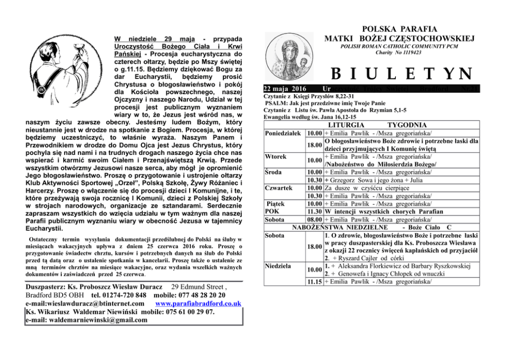 W niedziele 29 maja - przypada Uroczystość Bożego Ciała i Krwi Pańskiej - Procesja eucharystyczna do czterech ołtarzy, będzie po Mszy świętej o g.11.15. Będziemy dziękować Bogu za dar Eucharystii, będziemy prosić Chrystusa o błogosławieństwo i pokój dla Kościoła powszechnego, naszej Ojczyzny i naszego Narodu, Udział w tej procesji jest publicznym wyznaniem wiary w to, że Jezus jest wśród nas, w naszym życiu zawsze obecny. Jesteśmy ludem Bożym, który nieustannie jest w drodze na spotkanie z Bogiem. Procesja, w której będziemy uczestniczyć, to właśnie wyraża. Naszym Panem i Przewodnikiem w drodze do Domu Ojca jest Jezus Chrystus, który pochyla się nad nami i na trudnych drogach naszego życia chce nas wspierać i karmić swoim Ciałem i Przenajświętszą Krwią. Przede wszystkim otwórzmy Jezusowi nasze serca, aby mógł je opromienić Jego błogosławieństwo. Proszę o przygotowanie i ustrojenie ołtarzy Klub Aktywności Sportowej „Orzeł”, Polską Szkołę, Żywy Różaniec i Harcerzy. Proszę o włączenie się do procesji dzieci I Komunijne, i te, które przeżywają swoja rocznicę I Komunii, dzieci z Polskiej Szkoły w strojach narodowych, organizacje ze sztandarami. Serdecznie zapraszam wszystkich do wzięcia udziału w tym ważnym dla naszej Parafii publicznym wyznaniu wiary w obecność Jezusa w tajemnicy Eucharystii. Ostateczny termin wysyłania dokumentacji przedślubnej do Polski na śluby w miesiącach wakacyjnych upływa z dniem 25 czerwca 2016 roku. Proszę o przygotowanie świadectw chrztu, kursów i potrzebnych danych na ślub do Polski przed tą datą oraz o ustalenie spotkania w kancelarii. Proszę także o ustalenie ze mną terminów chrztów na miesiące wakacyjne, oraz wydania wszelkich ważnych dokumentów i zaświadczeń przed 25 czerwca. Duszpasterz: Ks. Proboszcz Wiesław Duracz 29 Edmund Street , Bradford BD5 OBH tel. 01274-720 848 mobile: 077 48 28 20 20 e-mail:[email protected] www.parafiabradford.co.uk Ks. Wikariusz Waldemar Niewiński mobile: 075 61 00 29 07. e-mail: [email protected] POLSKA PARAFIA MATKI BOŻEJ CZĘSTOCHOWSKIEJ POLISH ROMAN CATHOLIC COMMUNITY PCM Charity No 1119423 B I U L E T YN 22 maja 2016 Uroczystość Trójcy Świętej Bradford Nr.21 Czytanie z Księgi Przysłów 8,22-31 PSALM: Jak jest przedziwne imię Twoje Panie Czytanie z Listu św. Pawła Apostoła do Rzymian 5,1-5 Ewangelia według św. Jana 16,12-15 LITURGIA TYGODNIA Poniedziałek 10.00 + Emilia Pawlik - /Msza gregoriańska/ O błogosławieństwo Boże zdrowie i potrzebne łaski dla 18.00 dzieci przyjmujących I Komunię świętą Wtorek + Emilia Pawlik - /Msza gregoriańska/ 10.00 /Nabożeństwo do Miłosierdzia Bożego/ Środa 10.00 + Emilia Pawlik - /Msza gregoriańska/ 10.30 + Grzegorz Sowa i jego żona + Julia Czwartek 10.00 Za dusze w czyśćcu cierpiące 10.30 + Emilia Pawlik - /Msza gregoriańska/ Piątek 10.00 + Emilia Pawlik - /Msza gregoriańska/ POK 11.30 W intencji wszystkich chorych Parafian Sobota 08.00 + Emilia Pawlik - /Msza gregoriańska/ NABOŻEŃSTWA NIEDZIELNE - Boże Ciało C Sobota 1. O zdrowie, błogosławieństwo Boże i potrzebne łaski w pracy duszpasterskiej dla Ks. Proboszcza Wiesława 18.00 z okazji 22 rocznicy święceń kapłańskich od przyjaciół 2. + Ryszard Cajler od córki Niedziela 1. + Aleksandra Florkiewicz od Barbary Ryszkowskiej 10.00 2. + Genowefa i Ignacy Chłopek od wnuczki 11.15 + Emilia Pawlik - /Msza gregoriańska/ Lektorzy – Sobota 28.05.2016 g.18.00 – A. Andryszewski Niedziela 29.05.2016 g. 10.00 - K. Musztafa g.11.15 - J. Jelito Dyżur przedstawiciela PRD Sali św. Brata Alberta, sobota i niedziela 28-29.05.2016 – G. Wolny i A. Andryszewski OFIARY Na potrzeby parafii – £ Na kwiaty – £ Fundacja JP II - £ Taca dla parafii – 15.05.2016 - £ Gift Aid 17.04.2016 - £ 85 Jeżeli ktoś z Parafian pragnie złożyć ofiarę czekiem/na dowolny cel parafialny/, prosimy go wypisać na –P.C.M. BRADFORD. Zwracamy się w imieniu Parafialnej Rady Duszpasterskiej do wszystkich Parafian z serdeczną prośbą o złożenie raz w roku minimalnej sumy £ 30 na potrzeby naszej parafii. Wszystkim ofiarodawcom składamy serdeczne podziękowanie za złożone ofiary na nasze cele parafialne. Bóg zapłać. *** OGŁOSZENIA DUSZPASTERSKIE *** 1.Wiarę w jednego Boga w Trzech Osobach wyznajemy za każdym razem, kiedy czynimy znak krzyża świętego. Niech zatem każdy znak krzyża będzie wykonywany właśnie z tą świadomością, że dotykamy niepojętej tajemnicy, niech będzie zawsze naszym odważnym wyznaniem wiary w Ojca i Syna, i Ducha Świętego – jednego Boga w Trójcy Osób. 2. We wtorek, 24 maja przypada wspomnienie NMP Wspomożycielki Wiernych. Jest to również, ogłoszony przez Benedykta XVI, dzień powszechnej modlitwy za Kościół w Chinach. Ta intencja będzie nam towarzyszyć podczas nabożeństwa majowego. Zachęcamy też wszystkich parafian do indywidualnej modlitwy w tej intencji oraz w intencji naszych sióstr i braci chrześcijan cierpiących prześladowania. 3. W sobotę, 28 maja przypadnie 35. rocznica śmierci Prymasa Tysiąclecia, Stefana kard. Wyszyńskiego. Przez cały sobotni dzień będzie nam towarzyszyć modlitwa o jego rychłe wyniesienie do chwały ołtarzy. 4. Składamy najlepsze życzenia imieninowe i urodzinowe tym, którzy będą obchodzić te uroczystości w tym tygodniu. Modlitwą ogarniamy ostatnio zmarłych parafian. W TYM TYGODNIU PATRONUJĄ NAM:* 26 V – św. Filip Nereusz, kapłan i założyciel zakonnego zgromadzenia oratorianów (filipinów), odznaczający się wielką miłością bliźniego, ewangeliczną prostotą i radosną służbą Bogu. Przypominam, że w naszym kościele w maju codziennie odprawiamy nabożeństwa majowe ku czci Matki Najświętszej po Mszach o godzinie 10.30 i w soboty 15 min przed Mszą wieczorną. Weźmy udział w tym modlitewnym uwielbieniu Matki naszego Pana i naszej. W tak wielu sprawach możemy i powinniśmy prosić o J
