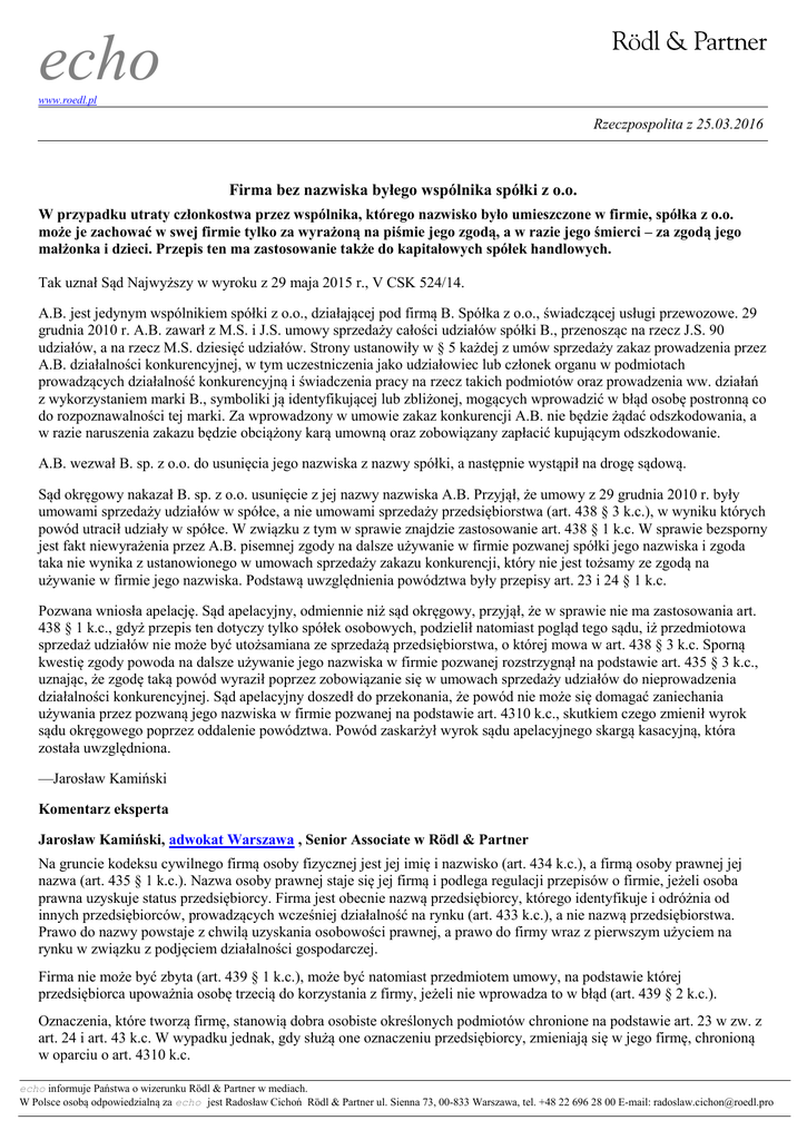 echo www.roedl.pl Rzeczpospolita z 25.03.2016 Firma bez nazwiska byłego wspólnika spółki z o.o. W przypadku utraty członkostwa przez wspólnika, którego nazwisko było umieszczone w firmie, spółka z o.o. może je zachować w swej firmie tylko za wyrażoną na piśmie jego zgodą, a w razie jego śmierci – za zgodą jego małżonka i dzieci. Przepis ten ma zastosowanie także do kapitałowych spółek handlowych. Tak uznał Sąd Najwyższy w wyroku z 29 maja 2015 r., V CSK 524/14. A.B. jest jedynym wspólnikiem spółki z o.o., działającej pod firmą B. Spółka z o.o., świadczącej usługi przewozowe. 29 grudnia 2010 r. A.B. zawarł z M.S. i J.S. umowy sprzedaży całości udziałów spółki B., przenosząc na rzecz J.S. 90 udziałów, a na rzecz M.S. dziesięć udziałów. Strony ustanowiły w § 5 każdej z umów sprzedaży zakaz prowadzenia przez A.B. działalności konkurencyjnej, w tym uczestniczenia jako udziałowiec lub członek organu w podmiotach prowadzących działalność konkurencyjną i świadczenia pracy na rzecz takich podmiotów oraz prowadzenia ww. działań z wykorzystaniem marki B., symboliki ją identyfikującej lub zbliżonej, mogących wprowadzić w błąd osobę postronną co do rozpoznawalności tej marki. Za wprowadzony w umowie zakaz konkurencji A.B. nie będzie żądać odszkodowania, a w razie naruszenia zakazu będzie obciążony karą umowną oraz zobowiązany zapłacić kupującym odszkodowanie. A.B. wezwał B. sp. z o.o. do usunięcia jego nazwiska z nazwy spółki, a następnie wystąpił na drogę sądową. Sąd okręgowy nakazał B. sp. z o.o. usunięcie z jej nazwy nazwiska A.B. Przyjął, że umowy z 29 grudnia 2010 r. były umowami sprzedaży udziałów w spółce, a nie umowami sprzedaży przedsiębiorstwa (art. 438 § 3 k.c.), w wyniku których powód utracił udziały w spółce. W związku z tym w sprawie znajdzie zastosowanie art. 438 § 1 k.c. W sprawie bezsporny jest fakt niewyrażenia przez A.B. pisemnej zgody na dalsze używanie w firmie pozwanej spółki jego nazwiska i zgoda taka nie wynika z ustanowionego w umowach sprzedaży zakazu konkurencji, który nie jest tożsamy ze zgodą na używanie w firmie jego nazwiska. Podstawą uwzględnienia powództwa były przepisy art. 23 i 24 § 1 k.c. Pozwana wniosła apelację. Sąd apelacyjny, odmiennie niż sąd okręgowy, przyjął, że w sprawie nie ma zastosowania art. 438 § 1 k.c., gdyż przepis ten dotyczy tylko spółek osobowych, podzielił natomiast pogląd tego sądu, iż przedmiotowa sprzedaż udziałów nie może być utożsamiana ze sprzedażą przedsiębiorstwa, o której mowa w art. 438 § 3 k.c. Sporną kwestię zgody powoda na dalsze używanie jego nazwiska w firmie pozwanej rozstrzygnął na podstawie art. 435 § 3 k.c., uznając, że zgodę taką powód wyraził poprzez zobowiązanie się w umowach sprzedaży udziałów do nieprowadzenia działalności konkurencyjnej. Sąd apelacyjny doszedł do przekonania, że powód nie może się domagać zaniechania używania przez pozwaną jego nazwiska w firmie pozwanej na podstawie art. 4310 k.c., skutkiem czego zmienił wyrok sądu okręgowego poprzez oddalenie powództwa. Powód zaskarżył wyrok sądu apelacyjnego skargą kasacyjną, która została uwzględniona. —Jarosław Kamiński Komentarz eksperta Jarosław Kamiński, adwokat Warszawa , Senior Associate w Rödl & Partner Na gruncie kodeksu cywilnego firmą osoby fizycznej jest jej imię i nazwisko (art. 434 k.c.), a firmą osoby prawnej jej nazwa (art. 435 § 1 k.c.). Nazwa osoby prawnej staje się jej firmą i podlega regulacji przepisów o firmie, jeżeli osoba prawna uzyskuje status przedsiębiorcy. Firma jest obecnie nazwą przedsiębiorcy, którego identyfikuje i odróżnia od innych przedsiębiorców, prowadzących wcześniej działalność na rynku (art. 433 k.c.), a nie nazwą przedsiębiorstwa. Prawo do nazwy powstaje z chwilą uzyskania osobowości prawnej, a prawo do firmy wraz z pierwszym użyciem na rynku w związku z podjęciem działalności gospodarczej. Firma nie może być zbyta (art. 439 § 1 k.c.), może być natomiast przedmiotem umowy, na podstawie której przedsiębiorca upoważnia osobę trzecią do korzystania z firmy, jeżeli nie wprowadza to w błąd (art. 439 § 2 k.c.). Oznaczenia, które tworzą firmę, stanowią dobra osobiste określonych podmiotów chronione na podstawie art. 23 w zw. z art. 24 i art. 43 k.c. W wypadku jednak, gdy służą one oznaczeniu przedsiębiorcy, zmieniają się w jego firmę, chronioną w oparciu o art. 4310 k.c. echo informuje Państwa o wizerunku Rödl & Partner w mediach. W Polsce osobą odpowiedzialną za echo jest Radosław Cichoń Rödl & Partner ul. Sienna 73, 00-833 Warszawa, tel. +48 22 696 28 00 E-mail: [email protected] W przypadku osoby prawnej nazwisko osoby fizycznej może być umieszczone w firmie, gdy służy ukazaniu związku danej osoby z powstaniem i działalnością przedsiębiorcy, pod warunkiem uzyskania pisemnej zgody osoby uprawnionej do nazwiska. Zgodę osoby uprawnionej na umieszczenie nazwiska w firmie odróżnić należy od zgody na zachowanie nazwiska w firmie. Spółka może zatem kontynuować działalność gospodarczą pod dotychczasową firmą pomimo utraty członkostwa przez wspólnika, którego nazwisko jest umieszczone w firmie, o ile były wspólnik wyrazi na to zgodę na piśmie, a w razie jego śmierci za zgodą jego małżonka i dzieci. Utrata członkostwa w rozumieniu tego przepisu może być spowodowana przeniesieniem ogółu praw na inna osobę. Sąd Najwyższy wskazał, że przepis art. 438 § 1 k.c. wymienia ogólnie osobę ustępującego wspólnika, nie określa natomiast rodzaju spółki, w firmie której zamieszczone było jego nazwisko. Nie ma więc dostatecznych podstaw, by zakres jego zastosowania ograniczać do spółek osobowych, zważywszy nadto, że nazwisko wspólnika może być użyte jako element firmy także w spółce kapitałowej, dla podkreśle