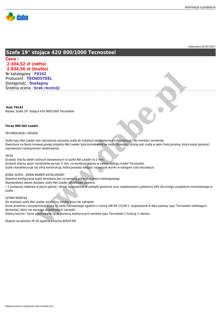 Informacje o produkcie Utworzono 02-03-2017 Szafa 19" stojąca 42U 800/1000 Tecnosteel Cena : 2.304,52 zł (netto) 2.834,56 zł (brutto) pl Nr katalogowy : F8142 Producent : TECNOSTEEL Dostępność : Dostępny Średnia ocena : brak recenzji e. Kod: F8142 Nazwa: Szafa 19" stojąca 42U 800/1000 Tecnosteel ab Tecno 800 Net Leader TECHNOLOGIA I DESIGN Szafa typu Net Leader jest najczęściej używaną szafą do instalacji okablowania strukturalnego i do montażu serwerów. Stworzona na bazie innowacyjnego projektu Net Leader była konsekwentnie modyfikowana i dzisiaj jest szafą w pełni funkcjonalną, która może sprostać najnowszym rozwiązaniom okablowania. .d 30/10 Grubość blachy belek nośnych stosowanych w szafie Net Leader to 2 mm. Grubość blachy spoin narożników wynosi 3 mm, co wyróżnia jedyny w swoim rodzaju model Tecnosteel. Szafa charakteryzuje się silną konstrukcją, która pozwala osiągać najwyższe wyniki w kategorii szaf sieciowych. w w JEDNA SZAFA - JEDEN NUMER KATALOGOWY Dowolna konfiguracja szafy określana jest za pomocą jednego numeru katalogowego. Standardowy zakres dostawy szafy Net Leader dodatkowo zawiera: • 2 przepusty kablowe w płycie górnej i dolnej wyposażone w zaślepki pomocne przy rozplanowaniu położenia UPS lub innego urządzenia montowanego w szafie. w SZYBKI MONTAŻ Do montażu szafy Net Leader wystarczy zwykły klucz do nakrętek. Drzwi przednie z przydymioną szybą ze szkła hartowanego zgodnie z normą UNI EN 12150-1: wyposażone w dwa zawiasy typu Tecnosteel ułatwiające demontaż, który nie wymaga dodatkowych narzędzi. Osłony boczne i tylna zdejmowane są za pomocą estetycznych zamków typu Tecnosteel z funkcją ¼ obrotu. Stopień szczelności IP 30 zgodnie z normą 60529 EN Wygenerowano w programie www.oscGold.com pl ab e. Opis: 1. Drzwi przednie szklane z zamkiem jednopunktowym 2. Drzwi tylnie pełne blaszane zamykane 3. Osłony boczne pełne blaszane, zdejmowane, 4. Dach perforowany, z przepustem szczotkowym 5. Trzy pary belek nośnych 19" (belki z możliwością regulacji) 6. Listwa i linki uziemienia 7. Szkielet szafy osadowiony na cokole 100mm 8. Szafa wykonana z blachy o grubości 2.0 mm 9. Kolor RAL 7035 10. Możliwość łączenia szaf w zestawy w w w .d 11. Uwaga ! Cokół jest dostępny jako opcja. Nie jest elementem wersji podstawowej ! Kod Opis S G W* U F8142 Szafa serwerowa Tecno 1000 Super Server 800 990 2057 42 *Całkowita wysokość z cokołem 100 mm