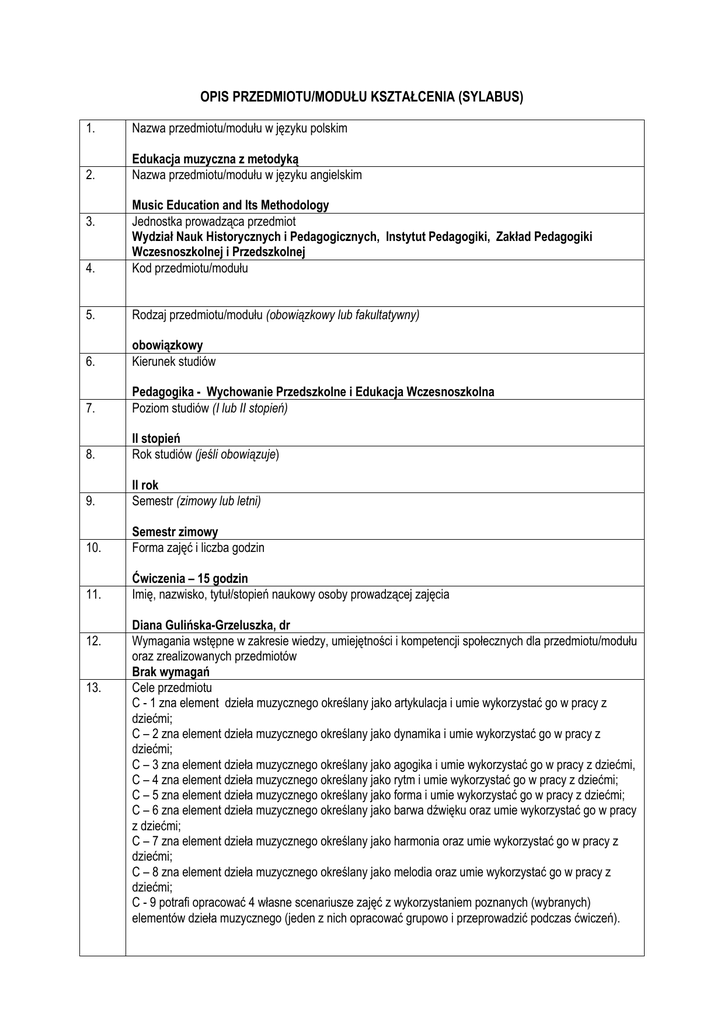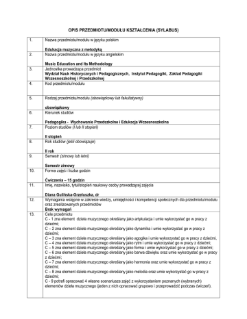OPIS PRZEDMIOTU/MODUŁU KSZTAŁCENIA (SYLABUS) 1. Nazwa przedmiotu/modułu w języku polskim 2. Edukacja muzyczna z metodyką Nazwa przedmiotu/modułu w języku angielskim 4. Music Education and Its Methodology Jednostka prowadząca przedmiot Wydział Nauk Historycznych i Pedagogicznych, Instytut Pedagogiki, Zakład Pedagogiki Wczesnoszkolnej i Przedszkolnej Kod przedmiotu/modułu 5. Rodzaj przedmiotu/modułu (obowiązkowy lub fakultatywny) 6. obowiązkowy Kierunek studiów 7. Pedagogika - Wychowanie Przedszkolne i Edukacja Wczesnoszkolna Poziom studiów (I lub II stopień) 8. II stopień Rok studiów (jeśli obowiązuje) 9. II rok Semestr (zimowy lub letni) 10. Semestr zimowy Forma zajęć i liczba godzin 11. Ćwiczenia – 15 godzin Imię, nazwisko, tytuł/stopień naukowy osoby prowadzącej zajęcia 3. 12. 13. Diana Gulińska-Grzeluszka, dr Wymagania wstępne w zakresie wiedzy, umiejętności i kompetencji społecznych dla przedmiotu/modułu oraz zrealizowanych przedmiotów Brak wymagań Cele przedmiotu C - 1 zna element dzieła muzycznego określany jako artykulacja i umie wykorzystać go w pracy z dziećmi; C – 2 zna element dzieła muzycznego określany jako dynamika i umie wykorzystać go w pracy z dziećmi; C – 3 zna element dzieła muzycznego określany jako agogika i umie wykorzystać go w pracy z dziećmi, C – 4 zna element dzieła muzycznego określany jako rytm i umie wykorzystać go w pracy z dziećmi; C – 5 zna element dzieła muzycznego określany jako forma i umie wykorzystać go w pracy z dziećmi; C – 6 zna element dzieła muzycznego określany jako barwa dźwięku oraz umie wykorzystać go w pracy z dziećmi; C – 7 zna element dzieła muzycznego określany jako harmonia oraz umie wykorzystać go w pracy z dziećmi; C – 8 zna element dzieła muzycznego określany jako melodia oraz umie wykorzystać go w pracy z dziećmi; C - 9 potrafi opracować 4 własne scenariusze zajęć z wykorzystaniem poznanych (wybranych) elementów dzieła muzycznego (jeden z nich opracować grupowo i przeprowadzić podczas ćwiczeń). 14. Zakładane efekty kształcenia EK_01 ma elementarną wiedzę o sztuce, ukierunkowaną na zastosowanie praktyczne K_W13 EK_02 zna podstawowe teorie i metodykę z zakresu sztuki K_W17 EK_03 ma podstawową wiedzę o uczestnikach działalności artystycznej K_W17 EK_04 zna metody nauczania-uczenia się stosowane w obszarach edukacji muzycznej na I etapie kształcenia i w edukacji przedszkolnej K_W25 EK_05 potrafi pracować w zespole, przyjmuje i wyznacza zadania K_U14 EK_06 odpowiedzialnie przygotowuje się do swojej pracy, projektuje i K_K09 wykonuje działania edukacyjne 15. Treści programowe 1.Artykulacja: - poznanie dźwięków i pojęć staccato i legato; - doskonalenie koordynacji słuchowo-ruchowej; - rozwijanie koncentracji, uwagi i pamięci; - rozwijanie wyobraźni muzyczno-ruchowej; - kształcenie umiejętności prawidłowej emisji i intonacji głosu; - poznanie piosenki Hej, Piotrusiu!; - wyrabianie umiejętności pracy w grupie; - utrwalanie treści bajki pt. Przygody Piotrusia Pana Jamesa Matthew Barriego. 2.Dynamika: - poznanie dźwięków cichych i głośnych; - doskonalenie koordynacji słuchowo-ruchowej; - rozwijanie koncentracji, uwagi i pamięci; - rozwijanie wyobraźni muzyczno-ruchowej; - kształcenie umiejętności prawidłowej emisji i intonacji głosu; - poznanie piosenki Planety; - przyswajanie wiadomości na temat zjawisk dotyczących kosmosu; - wyrabianie umiejętności pracy w grupie; - utrwalanie treści bajki pt. Dzieci pana Astronoma Wandy Chotomskiej. 3. Tempo: - poznanie muzyki szybkiej i wolnej - doskonalenie koordynacji słuchowo-ruchowej; - rozwijanie koncentracji, uwagi i pamięci; - rozwijanie wyobraźni muzyczno-ruchowej; - kształcenie umiejętności prawidłowej emisji i intonacji głosu; - poznanie piosenki pt. Sprytne krasnoludki; - wyrabianie umiejętności pracy w grupie; - utrwalanie treści bajki braci Grimm pt. Królewna Śnieżka i siedmiu krasnoludków; - uwrażliwianie na krzywdę ludzką; - wzbudzanie w sobie pozytywnych emocji. 4. Metrorytmika: - poznanie dźwięków o różnej długości trwania; - poznanie klucza wiolinowego i pięciolinii; - zapoznanie się z elementami potrzebnymi do stworzenia piosenki; - doskonalenie koordynacji słuchowo-ruchowej; - wyrabianie szybkiej reakcji na sygnał muzyczny; - poznanie piosenki pt. Nutki; - wyrabianie umiejętności pracy w grupie; Utrwalanie treści bajki pt. Nutka kapryśnica Haliny Mlynkovej. 5. Forma ABC i AB: - poznanie form ABC i AB; - kształcenie poczucia rytmu; - doskonalenie reakcji na sygnał słowny i muzyczny; - doskonalenie koordynacji słuchowo- ruchowej; 16. 17. 18. 19. - rozwijanie wyobraźni muzyczno-ruchowej; - kształcenie umiejętności prawidłowej emisji i intonacji głosu; - poznanie piosenki pt. Małe świnki; - utrwalanie treści bajki braci Grimm pt. Trzy małe świnki. 6. Barwa w muzyce: - poznanie różnych barw dźwięków; - uświadomienie, co to jest dźwięk; - poznanie różnych efektów dźwiękowych; - doskonalenie koordynacji słuchowo- ruchowej; - rozwijanie koncentracji, uwagi i pamięci; - rozwijanie wyobraźni muzyczno-ruchowej; - kształcenie umiejętności prawidłowej emisji i intonacji głosu; - wyrabianie umiejętności pracy w grupie; - poznanie piosenki pt. Barwa dźwięku; - poznanie zwyczajów panujących na łące; - poznanie nazw popularnych owadów; - uświadomienie, jakie zjawiska występują w przyrodzie; - utrwalanie treści bajki pt. Pszczółka Maja i jej przygody Waldemara Bonselsa. 7. Tryb durowy i molowy: - poznanie muzyki wesołej i smutnej; - nauka pokazywania emocji na twarzy; - doskonalenie koordynacji słuchowo-ruchowej; - rozwijanie koncentracji, uwagi i pamięci; - rozwijanie wyobraźni muzyczno-ruchowej; - kształcenie umiejętności empatycznych; - poznanie piosenki pt. Piosenka o małym misiu; - wyrabianie umiejętności pracy w grupie; - utrwalanie treści bajki pt. Kubuś Pucha