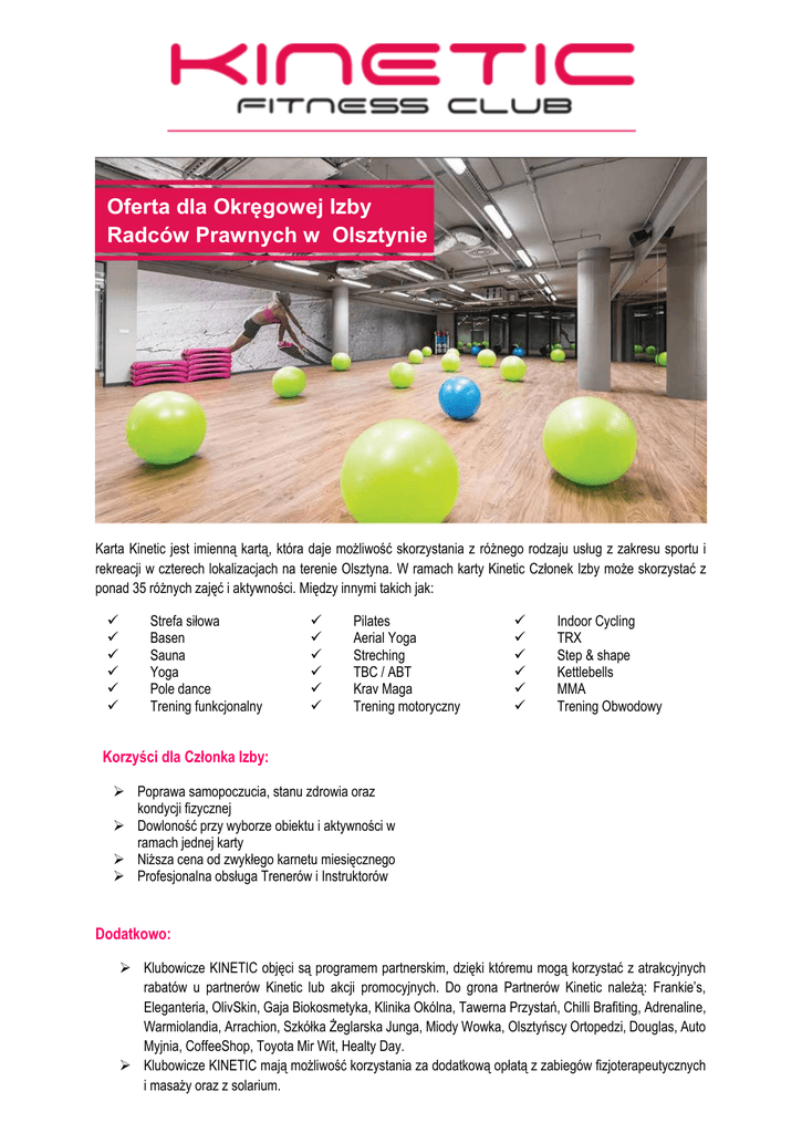 Oferta dla Okręgowej Izby Radców Prawnych w Olsztynie Karta Kinetic jest imienną kartą, która daje możliwość skorzystania z różnego rodzaju usług z zakresu sportu i rekreacji w czterech lokalizacjach na terenie Olsztyna. W ramach karty Kinetic Członek Izby może skorzystać z ponad 35 różnych zajęć i aktywności. Między innymi takich jak: Strefa siłowa Basen Sauna Yoga Pole dance Trening funkcjonalny Pilates Aerial Yoga Streching TBC / ABT Krav Maga Trening motoryczny Indoor Cycling TRX Step & shape Kettlebells MMA Trening Obwodowy Korzyści dla Członka Izby: Poprawa samopoczucia, stanu zdrowia oraz kondycji fizycznej Dowloność przy wyborze obiektu i aktywności w ramach jednej karty Niższa cena od zwykłego karnetu miesięcznego Profesjonalna obsługa Trenerów i Instruktorów Dodatkowo: Klubowicze KINETIC objęci są programem partnerskim, dzięki któremu mogą korzystać z atrakcyjnych rabatów u partnerów Kinetic lub akcji promocyjnych. Do grona Partnerów Kinetic należą: Frankie’s, Eleganteria, OlivSkin, Gaja Biokosmetyka, Klinika Okólna, Tawerna Przystań, Chilli Brafiting, Adrenaline, Warmiolandia, Arrachion, Szkółka Żeglarska Junga, Miody Wowka, Olsztyńscy Ortopedzi, Douglas, Auto Myjnia, CoffeeShop, Toyota Mir Wit, Healty Day. Klubowicze KINETIC mają możliwość korzystania za dodatkową opłatą z zabiegów fizjoterapeutycznych i masaży oraz z solarium. Oferta cenowa dla min. 20 i więcej zgłoszonych Pracowników: KINETIC OPEN Dedykowany dla: Członek Izby pokrywa 100% ceny karty 1 wejście dziennie, 2 kluby Kinetic FITNESS, STREFA SIŁOWA, SAUNY, Członka Izby 99 zł jednego członka rodziny lub znajomego 120 zł Dedykowany dla: Członek Izby pokrywa 100% ceny karty Członka Izby 149 zł jednego członka rodziny lub znajomego 158 zł AQUA PLUS OPEN 1 wejście dziennie, 2 kluby Kinetic FITNESS, STREFA SIŁOWA, SAUNY, 8 wejść na Basen Oferta ważna jest do dnia 14.02.2017 r. Ceny podane w ofercie są cenami brutto W razie jakichkolwiek pytań, jestem do dyspozycji. Z wyrazami szaczunku, Łukasz Orłowski Koordynator ds. sprzedaży KINETIC Fitness Club kom.: 734 140 073 e-mail: [email protected] Niniejszy dokument jest przeznaczony wyłącznie do użytku Izby i jej Członków. Rozpowszechnianie informacji zawartych w ofercie jest możliwe wyłącznie po uzyskaniu pisemnej zgody.